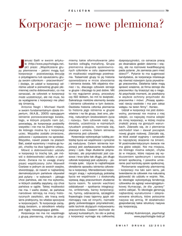 F E L I E T O N 79 Korporacje – nowe plemiona? J anusz Galli w swoim artykule (http://www.psychologia.net. pl/) pisze: „Współczesne grupy plemienne – jakimi mogą być korporacje – pozostawiają decyzję o przystąpieniu lub opuszczeniu grupy swoim członkom – pracownikom” i dodaje, że udział w korporacji odróżnia udział w pierwotnej grupie plemiennej cecha dobrowolności, co ma oznaczać, że człowiek w korporacji może uczestniczyć, ale nie musi, bo za wystąpienie z korporacji nie płaci się śmiercią. Antonio Negri i Michael Hardt w swoim fundamentalnym dziele Imperium, (W.A.B., 2005) opisującym istnienie ponowoczesnego świata, tego, w którym przyszło nam żyć, powiadają, że korporacje podzieliły wszystko i nie ma na Ziemi miejsca, do którego można by z korporacji uciec. Wszystko zostało zmierzone, policzone i wystawione na sprzedaż. Wszystko, nawet piasek na plażach Bali, został wyceniony i można go kupić, choćby na dwa tygodnie urlopu. Mówić o dobrowolności udziału w korporacji to trochę tak, jak mówić o dobrowolności udziału w państwie. Zwraca na to uwagę znany pisarz współczesny John Maxwell Coetzee w jednym ze swoich esejów, stwierdzając, że nawet w najbardziej demokratycznym państwie obywatel jest pytany – w wyborach – jakiego chce państwa, ale nie ma wyborów, w których zostałby zapytany, czy chce państwa w ogóle. Takiej możliwości nie ma. I warto dodać, że państwa narodowe istnieją na mocy historycznych zaszłości, ale tracą swój sens praktyczny, bo władza spoczywa w korporacjach. To korporacje zarządzają światem, a ośrodkiem władzy jest nigdy niezasypiająca giełda. Korporacja nie ma nic wspólnego z grupą plemienną, chyba że przyj- miemy takie sformułowanie jako bardzo odległą metaforę. Grupa plemienna skupiała spokrewnionych członków w celu zapewnienia im możliwości wspólnego przetrwania. Tożsamość grupy to jej historia opowiedziana w micie stworzenia i istnienia świata. Mit objaśnia również i to, dlaczego człowiek istnieje w grupie i dlaczego to jest dobre. Mit to nie regulamin pracy, procedury czy ISO ileśtam, bo mit to świętość. Sakralizuje niektóre elementy świata i istnienie człowieka w tym świecie. Osobista historia członka plemienia to historia jego istnienia w grupie właśnie i na tle grupy. Jest ono, plemię, naturalnym środowiskiem życia i rozwoju. Tam człowiek rodzi się, dorasta, uczestniczy w rozmaitych rytuałach przejścia, rozmnaża się, starzeje i umiera. Celem istnienia plemienia jest człowiek. Korporacja wykorzystuje ludzką potrzebę bycia we wspólnocie i cynicznie jej nadużywa. Celem istnienia korporacji jest zawłaszczanie rezultatów pracy i zysk. Daje złudzenie przynależności, ale przynależność jest czasowa i trwa tylko tak długo, jak długo członek korporacji jest użyteczny – pomnaża zyski. Użycie to najtrafniejsze określenie sposobu istnienia człowieka w korporacji. Menedżerowie korporacyjni znają i wykorzystują potrzebę bycia we wspólnocie i z doskonałą wprawą dają pracownikom złudzenie bycia razem. To szeroki wachlarz oddziaływań – spotkania integracyjne, emblematy, barwy korporacyjne, hymny, odznaczenia, szczególna frazeologia (nasz tajemny język odróżniający nas od innych), rozmaite gesty potwierdzające przynależność, setki technik służących motywowaniu pracowników. Czasem dochodzi do sytuacji kuriozalnych, bo oto w jednej z korporacji wymaga się całkowitej dyspozycyjności, co oznacza pracę po dwanaście godzin dziennie i więcej, ale na rozmowie kwalifikacyjnej pada pytanie „ile zamierza pani mieć dzieci?”. Pytanie to ma sugerować kandydatce, że korporacja interesuje się również rozwojem życia prywatnego pracownika. Działania takie mają sprawić wrażenie, że firma istnieje dla pracownika i by troszczyć się o niego. Aż przychodzi moment, że przełożony w asyście ochrony przychodzi do pracownika i mówi: „Proszę spakować rzeczy osobiste i ma pan zakaz wstępu na teren firmy”. Koniec. Udział w korporacji nie jest dobrowolny, ponieważ nie można z niej odejść, co najwyżej można odejść do innej korporacji, w której można znaleźć pracę na gorszych warunkach. Zdarzało się, że z plemienia odchodził klan i dawał początek nowej grupie rodowej. Zdarzało się, że ktoś został wygnany i oznaczało to najczęściej skazanie na śmierć. W postmodernistycznym świecie nie ma gdzie odejść. Nie ma miejsca, do którego można odejść, chyba że w miejsce, które nazywa się wykluczeniem społecznym i oznacza śmierć społeczną. I powolne umieranie pod kontrolą opieki społecznej. Porównanie wspólnoty plemiennej i korporacji ma taki sam sens, jak twierdzenie że człowiek ma naturalną gotowość do udziału w wojnie. Nie, to ideologie wykorzystują tendencję człowieka do agresji wewnątrzgatunkowej tłumacząc, że dla „sprawy” wolno zabijać. To ideologie generują najbardziej wynaturzone i zdeprawowane struktury, które potocznie nazywa się armią. W działalności gospodarczej takie struktury nazywa się korporacją. Andrzej Kuśmierczyk, psycholog www.psychologia-lodz.pl ś W I A T D R U K U 12/ 2 0 1 0