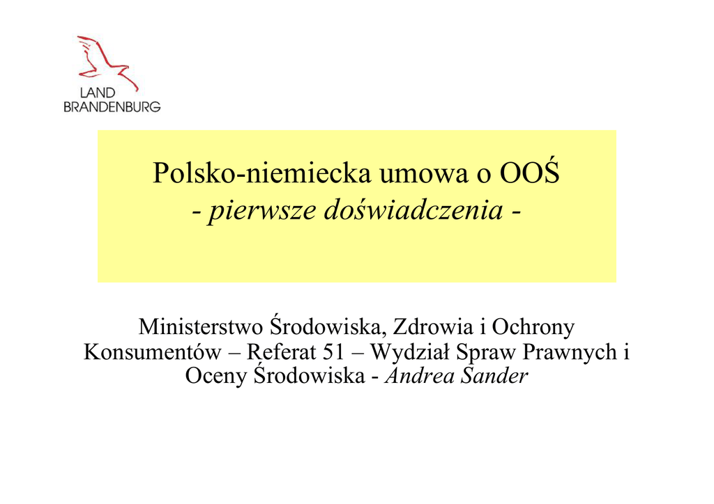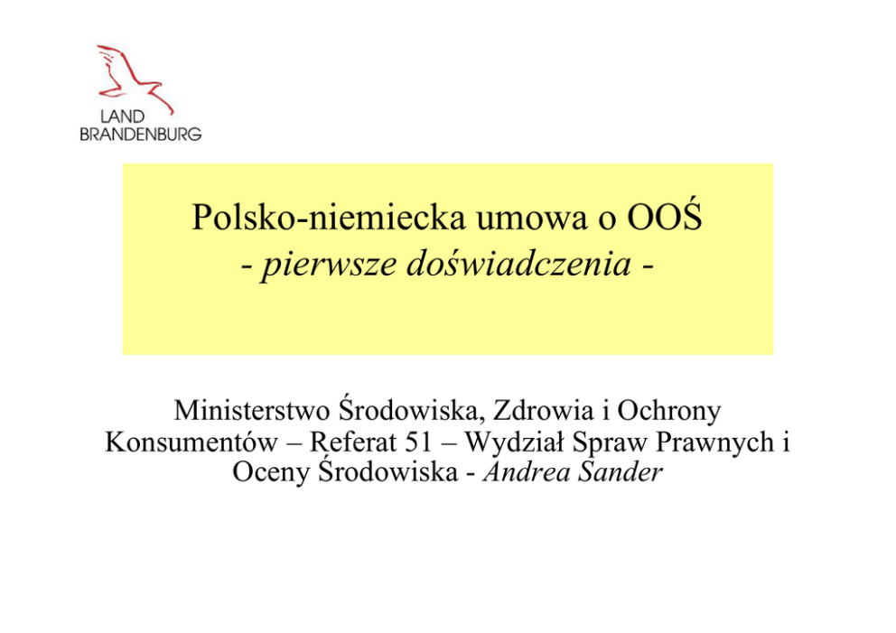 Polsko-niemiecka umowa o OOŚ - pierwsze doświadczenia - Ministerstwo Środowiska, Zdrowia i Ochrony Konsumentów – Referat 51 – Wydział Spraw Prawnych i Oceny Środowiska - Andrea Sander Pierwsze doświadczenia z polsko-niemiecką umową o OOŚ 1. Papiernia w Eisenhüttenstadt Procedura wydawania zezwoleń podlegająca OOŚ dla obiektu (650 000 ton tektury falistej rocznie, elektrociepłownia oraz oczyszczalnia ścieków) -> Marzec 2007 r. – pierwsze spotkanie wstępne - grudzień 2008 r. ostatnie dopuszczenie częściowe) - Powiadomienie Polski przed wejściem w życie polsko-niemieckiej umowy o OOŚ (czerwiec 2007 r.) – współdziałanie miało miejsce Styczeń 2008 r.: omówienie polskiego stanowiska przy okazji spotkania wyjaśniającego (Ministerstwo Środowiska w Warszawie, województwo lubuskie); został ustanowiony dodatkowy punkt pomiaru immisji pomiędzy obiektem a Polską -> Pozytywne doświadczenie: bezpośredni kontakt między niemieckim i polskim przedstawicielami (organów) 2 Pierwsze doświadczenia z polsko-niemiecką umową o OOŚ 2. Farma wiatrowa Jerischke Farma wiatrowa - 27 elektrowni wiatrowych (EW) w Jerischke, na południe od Forst Postępowanie w toku (obowiązek OOŚ w Niemczech od 20 EW) Kwiecień 2010: Zaproszenie Krajowego Urzędu Środowiska (Oddział Regionalny Południe) dla polskich kolegów do udziału w procesie scopingowym Pozytywne: Niemcy zaoferowały polskim kolegom udział w scopingu (wykracza poza ramy polskoniemieckiej umowy o OOŚ) 3