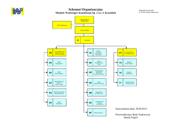 Schemat Organizacyjny Załącznik do uchwały nr 15/2013 Rady Nadzorczej Miejskie Wodociągi i Kanalizacja Sp. z o.o. w Koszalinie Zgromadzenie Wspólników Rada Nadzorcza Zarząd Spółki N DE Z-ca Dyrektora ds. Ekonomicznych Główny Księgowy Dyrektor NS Główny Specjalista ds. Ochrony Środowiska EK Dział Księgowości NK Dział Zatrudnienia i Płac EE Dział Ekonomiczny NO Dział Organizacji i Zarządzania Systemami Teleinformatycznymi ES Dział Rozliczeń opłat za wodę i ścieki NA Dział Administracyjny EG Dział Gospodarki Wodomierzami NB Specjalista ds. BHP i OC EH Dział Handlowy NZ DT Z-ca Dyrektora ds. Eksploatacji TH Zakład Wodociągów TK Zakład Kanalizacji TT Zakład Usług Technicznych Specjalista ds. kontroli wewnętrznej Zatwierdzono dnia: 20.09.2013 NP Radca Prawny Przewodniczący Rady Nadzorczej Marek Fligiel Załącznik nr 2 do schematu organizacyjnego Miejskich Wodociągów i Kanalizacji Sp. z o.o. w Koszalinie DT Z-ca Dyrektora ds. Eksploatacji TT Zakład Usług Technicznych TH Zakład Wodociągów TK Zakład Kanalizacji TM Dział Obsługi Mechanicznej HK Dział Ujęć Wody w Koszalinie KO Oczyszczalnia Ścieków TE Dział Obsługi Energetycznej HM Dział Ujęć Wody w Mostowie KG Grupa Robót Kanalizacyjnych Dział Inwestycji, Remontów i Zamówień Publicznych HW Dział Eksploatacji Sieci Wodociągowej KT Dział Transportu TI TR Dział Techniczny Załącznik nr 1 do schematu organizacyjnego Miejskich Wodociągów i Kanalizacji Sp. z o.o. w Koszalinie N NS Dyrektor Główny Specjalista ds. Ochrony Środowiska NSW Laboratorium Badania Wody NSS Laboratorium Badania Ścieków