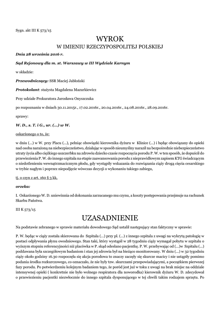 Sygn. akt III K 573/15 WYROK W IMIENIU RZECZYPOSPOLITEJ POLSKIEJ Dnia 28 września 2016 r. Sąd Rejonowy dla m. st. Warszawy w III Wydziale Karnym w składzie: Przewodniczący: SSR Maciej Jabłoński Protokolant: stażysta Magdalena Mazurkiewicz Przy udziale Prokuratora Jarosława Onyszczuka po rozpoznaniu w dniach 30.11.2015r., 17.02.2016r., 20.04.2016r., 24.08.2016r., 28.09.2016r. sprawy: W. D., s. T. i G., ur. (...) w W. oskarżonego o to, że: w dniu (...) w W. przy Placu (...), pełniąc obowiązki kierownika dyżuru w Klinice (...) i będąc obowiązany do opieki nad osoba narażoną na niebezpieczeństwo, działając w sposób nieumyślny naraził na bezpośrednie niebezpieczeństwo utraty życia albo ciężkiego uszczerbku na zdrowiu dziecko czasie rozpoczęcia porodu P. W. w ten sposób, że dopuścił do przewiezienia P. W. do innego szpitala na etapie zaawansowania porodu z nieprawidłowym zapisem KTG świadczącym o niedotlenieniu wewnątrzmacicznym płodu, gdy wystąpiły wskazania do rozwiązania ciąży drogą cięcia cesarskiego w trybie nagłym i poprzez niepodjęcie wówczas decyzji o wykonaniu takiego zabiegu, tj. o czyn z art. 160 § 3 kk, orzeka: I. Oskarżonego W. D. uniewinnia od dokonania zarzucanego mu czynu, a koszty postępowania przejmuje na rachunek Skarbu Państwa. III K 573/15 UZASADNIENIE Na podstawie zebranego w sprawie materiału dowodowego Sąd ustalił następujący stan faktyczny w sprawie: P. W. będąc w ciąży została skierowana do Szpitala (...) przy pl. (...) z innego szpitala z uwagi na wykrytą patologię w postaci odpływania płynu owodniowego. Stan taki, który wystąpił w 28 tygodniu ciąży wymagał pobytu w szpitalu o wyższym stopniu referencyjności niż placówka w P. skąd odesłano pacjentkę. P. W. przebywając od (...)w Szpitalu (...) poddawana była szczegółowym badaniom i stan jej zdrowia był na bieżąco monitorowany. W dniu (...) w 32 tygodniu ciąży około godziny 16.30 rozpoczęła się akcja porodowa to znaczy zaczęły się skurcze macicy i nie ustąpiły pomimo podania środka rozkurczowego, co oznaczało, że nie były tzw. skurczami przepowiadającymi, a początkiem pierwszej fazy porodu. Po potwierdzeniu kolejnym badaniem tego, że poród jest już w toku z uwagi na brak miejsc na oddziale intensywnej opieki ( konkretnie nie było wolnego respiratora dla noworodka) kierownik dyżuru W. D. zdecydował o przewiezieniu pacjentki niezwłocznie do innego szpitala dysponującego w tej chwili takim rodzajem sprzętu. Po podjęciu tej decyzji pojawiły się nieprawidłowości w zapisie KTG( czyli tętna płodu) w postaci głębokich deceleracji. Mając wiedzę o tym zapisie W. D. nie zmienił decyzji i nie podjął się wykonania na miejscu cesarskiego cięcia, co biegli powołani przez prokuratora z L. (...) ocenili jako decyzję nieprawidłową. W dalszej części porodu, który przebiegał w (...) Szpitalu (...) siłami natury doszło do zakończenia porodu w wyniku czego urodził się martwy płód. Przyczyny obumarcia płodu przed zakończeniem porodu nie zostały ustalone wobec nie przeprowadzenia sekcji zwłok. Powyższy stan faktyczny Sąd ustalił na podstawie następujących dowodów: wyjaśnień W. D. (k- 207-210, 245, 331,576-577), zeznań świadków M. A. (k- 64,332), K. B. (k-100-101,332-333), D. B. (k- 54, 333-335), J. C. (k- 58,335), M. N. (k- 61,335) P. T. (k- 50-52, 335-336, 461 ), P. W. (k- 15-17,352), A. S. (k- 462-463) opinii biegłych złożonych do protokołu (k-378-384) i 557-558 oraz dokumentów zaliczonych do materiału dowodowego według wykazu na k-578. Sąd dał wiarę zarówno wyjaśnieniom W. D. jak i zeznaniom świadków, które jawią się jako spójne wzajemnie się uzupełniające i logiczne, a także znajdujące potwierdzenie w dokumentacji medycznej. Minimalne nieścisłości w relacji P. W. co do czasu kolejnych badań i przekazywanych jej informacji przez personel medyczny Sąd uznaje za naturalny wpływ absolutnie nietypowej sytuacji dla świadka czyli dokonywania obserwacji w trakcie przebiegu porodu obarczonego bardzo wysokim ryzykiem i zakończonego traumatycznie dla świadka. Jak idzie o opinie biegłych to Sąd odniesie się do nich w dalszej części uzasadnienia. Sąd zważył, co następuje: W realiach niniejszej sprawy uznanie winy oskarżonego w zakresie zarzucanego mu czynu jest zdaniem Sądu wykluczone. Przed przedstawieniem (zwięzłym jak nakazuje treść art. 424 § 1 kpk) powodów jakie skłoniły Sąd do uniewinnienia oskarżonego należy poczynić jedną uwagę porządkującą. W niniejszej sprawie przedmiotem zarzutu jest jedna decyzja jaką podjął lekarz kierujący zespołem dyżuru położniczego. Jest to decyzja o przewiezieniu rodzącej do innego szpitala podjęta około godziny 17.45 i podtrzymana ( nie zmieniona) około godziny 18.40 (ostatni zapis badania potwierdzony podpisem W. D.). Dlatego też Sąd nie będzie czynił przedmiotem swoich pisemnych rozważań ani tego co działo się z pacjentką wcześniej (i co nie wzbudziło jakichkolwiek wątpliwości biegłych) ani tego co działo się od momentu rozpoczęcia transportu do innego szpitala (co też nie było przedmiotem krytycznej oceny biegłych). Oceniając prawidłowość postępowania W. D. trzeba mieć na względzie w pierwszej kolejności to, że ciąża pokrzywdzonej była ciążą patologiczną zagrożoną przedwczesnym porodem z uwagi na odpływające od kilku tygodni wody płodowe. Wiadomym też było, że w przypadku porodu przedwczesnego dziecko rozwijające się w środowisku o zmniejszonej objętości płynu owodniowego będzie wymagało zapewnienia wsparcia wentylacyjnego czyli dostępu do wysokospecjalistycznego respiratora przeznaczonego dla noworodków z uwagi na praktyczne pewne niedostatki rozwojowe układu oddechowego. Była to wiedza oczywista dla pracujących razem z W. D. świadków czyli ordynator oddziału patologii ciąży D. B. i lekarza neonatologa K. B.. Wyposażony w 