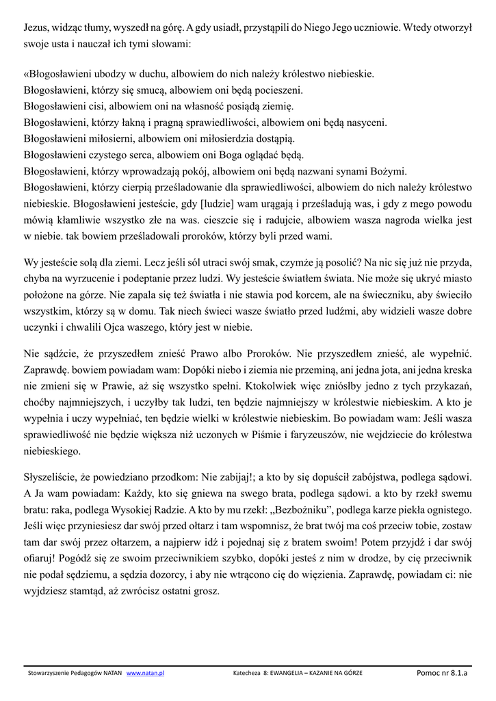 Jezus, widząc tłumy, wyszedł na górę. A gdy usiadł, przystąpili do Niego Jego uczniowie. Wtedy otworzył swoje usta i nauczał ich tymi słowami: «Błogosławieni ubodzy w duchu, albowiem do nich należy królestwo niebieskie. Błogosławieni, którzy się smucą, albowiem oni będą pocieszeni. Błogosławieni cisi, albowiem oni na własność posiądą ziemię. Błogosławieni, którzy łakną i pragną sprawiedliwości, albowiem oni będą nasyceni. Błogosławieni miłosierni, albowiem oni miłosierdzia dostąpią. Błogosławieni czystego serca, albowiem oni Boga oglądać będą. Błogosławieni, którzy wprowadzają pokój, albowiem oni będą nazwani synami Bożymi. Błogosławieni, którzy cierpią prześladowanie dla sprawiedliwości, albowiem do nich należy królestwo niebieskie. Błogosławieni jesteście, gdy [ludzie] wam urągają i prześladują was, i gdy z mego powodu mówią kłamliwie wszystko złe na was. cieszcie się i radujcie, albowiem wasza nagroda wielka jest w niebie. tak bowiem prześladowali proroków, którzy byli przed wami. Wy jesteście solą dla ziemi. Lecz jeśli sól utraci swój smak, czymże ją posolić? Na nic się już nie przyda, chyba na wyrzucenie i podeptanie przez ludzi. Wy jesteście światłem świata. Nie może się ukryć miasto położone na górze. Nie zapala się też światła i nie stawia pod korcem, ale na świeczniku, aby świeciło wszystkim, którzy są w domu. Tak niech świeci wasze światło przed ludźmi, aby widzieli wasze dobre uczynki i chwalili Ojca waszego, który jest w niebie. Nie sądźcie, że przyszedłem znieść Prawo albo Proroków. Nie przyszedłem znieść, ale wypełnić. Zaprawdę. bowiem powiadam wam: Dopóki niebo i ziemia nie przeminą, ani jedna jota, ani jedna kreska nie zmieni się w Prawie, aż się wszystko spełni. Ktokolwiek więc zniósłby jedno z tych przykazań, choćby najmniejszych, i uczyłby tak ludzi, ten będzie najmniejszy w królestwie niebieskim. A kto je wypełnia i uczy wypełniać, ten będzie wielki w królestwie niebieskim. Bo powiadam wam: Jeśli wasza sprawiedliwość nie będzie większa niż uczonych w Piśmie i faryzeuszów, nie wejdziecie do królestwa niebieskiego. Słyszeliście, że powiedziano przodkom: Nie zabijaj!; a kto by się dopuścił zabójstwa, podlega sądowi. A Ja wam powiadam: Każdy, kto się gniewa na swego brata, podlega sądowi. a kto by rzekł swemu bratu: raka, podlega Wysokiej Radzie. A kto by mu rzekł: „Bezbożniku”, podlega karze piekła ognistego. Jeśli więc przyniesiesz dar swój przed ołtarz i tam wspomnisz, że brat twój ma coś przeciw tobie, zostaw tam dar swój przez ołtarzem, a najpierw idź i pojednaj się z bratem swoim! Potem przyjdź i dar swój ofiaruj! Pogódź się ze swoim przeciwnikiem szybko, dopóki jesteś z nim w drodze, by cię przeciwnik nie podał sędziemu, a sędzia dozorcy, i aby nie wtrącono cię do więzienia. Zaprawdę, powiadam ci: nie wyjdziesz stamtąd, aż zwrócisz ostatni grosz. Stowarzyszenie Pedagogów NATAN www.natan.pl Katecheza 8: EWANGELIA – KAZANIE NA GÓRZE Pomoc nr 8.1.a