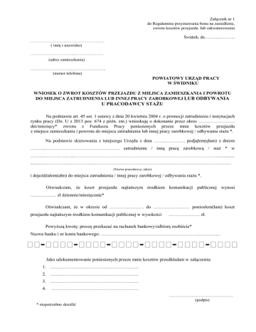 Załącznik nr 1 do Regulaminu przyznawania bonu na zasiedlenie, zwrotu kosztów przejazdu lub zakwaterowania Świdnik, dn………..……….. ………………………….………………………...….. ( imię i nazwisko) ………………………………..………………..……. (adres zamieszkania) …………………………………………….. (numer telefonu) POWIATOWY URZĄD PRACY W ŚWIDNIKU WNIOSEK O ZWROT KOSZTÓW PRZEJAZDU Z MIEJSCA ZAMIESZKANIA I POWROTU DO MIEJSCA ZATRUDNIENIA LUB INNEJ PRACY ZAROBKOWEJ LUB ODBYWANIA U PRACODAWCY STAŻU Na podstawie art. 45 ust. 1 ustawy z dnia 20 kwietnia 2004 r. o promocji zatrudnienia i instytucjach rynku pracy (Dz. U z 2013 poz. 674 z późn. zm.) wnioskuję o dokonanie przez okres ………………….…. dni/miesięcy* zwrotu z Funduszu Pracy poniesionych przeze mnie kosztów przejazdu z miejsca zamieszkania i powrotu do miejsca zatrudnienia lub innej pracy zarobkowej / odbywania stażu *. Na podstawie skierowania z tutejszego Urzędu z dnia ……...……….…. podjąłem(ęłam) z dniem ………..……………………………………………. zatrudnienie / inną pracę zarobkową / staż * w ……..………………...………………………………………………………………………………………................. ...........…………………………………………………………………………………………………………………… (Nazwa pracodawcy, adres) i dojeżdżałem(ałm) do miejsca zatrudnienia / innej pracy zarobkowej / odbywania stażu *. Oświadczam, że koszt przejazdu najtańszym środkiem komunikacji publicznej wynosi ……………… zł dziennie/miesięcznie* Oświadczam, że w okresie od …………..….……. do ………………..…… poniosłem(łam) koszt przejazdu najtańszym środkiem komunikacji publicznej w wysokości …………………. zł. Powyższą kwotę: proszę przekazać na rachunek bankowy/odbiorę osobiście* Nazwa banku i nr konta bankowego: ……………………………………………………………….… ------ Jako udokumentowanie poniesionych przeze mnie kosztów przedkładam w załączeniu: 1. …………………………………………………….. 2. …………………………………………………….. 3. …………………………………………………….. 4. .…………………………………………………… ……………………………………… (podpis) * niepotrzebne skreślić Załącznik nr 2 do Regulaminu przyznawania bonu na zasiedlenie, zwrotu kosztów przejazdu lub zakwaterowania Świdnik, dn………..……….. ………………………….………………………...….. ( imię i nazwisko) ………………………………..………………..……. (adres zamieszkania) …………………………………………….. (numer telefonu) POWIATOWY URZĄD PRACY W ŚWIDNIKU WNIOSEK O ZWROT KOSZTÓW PRZEJAZDU Z TYTUŁU UDZIAŁU W SZKOLENIU Na podstawie art. 41 pkt. 4b Ustawy z dnia 20 kwietnia 2004 r. o promocji zatrudnienia i instytucjach rynku pracy (Dz. U z 2013 poz. 674 z późn. zm.) zwracam się z prośbą o dokonanie przez okres ………………….…. dni/miesięcy* zwrotu z Funduszu Pracy poniesionych przeze mnie kosztów przejazdu do miejsca szkolenia i powrotu do miejsca zamieszkania. Nadmieniam, że na podstawie skierowania z tutejszego Urzędu z dnia ……...……….………………. podjąłem(podjęłam) z dniem …………..………..…… szkolenie ………………...…………… …………………………………………………………………………………………………………………………….. (nazwa instytucji szkoleniowej oraz siedziba) w miejscowości ……………….……………………………………........ Oświadczam, że koszt przejazdu najtańszym środkiem komunikacji publicznej wynosi ……………… zł dziennie/miesięcznie* Oświadczam również, że w okresie od …………..….……. do ………………..…… poniosłem koszt przejazdu najtańszym środkiem komunikacji publicznej w wysokości …………………. zł. Powyższą kwotę: proszę przekazać na rachunek bankowy/odbiorę osobiście* Nazwa banku i nr konta bankowego: ……………………………………………………………….… ------ Jako udokumentowanie poniesionych przeze mnie kosztów przedkładam w załączeniu: 1. …………………………………………………….. 2. …………………………………………………….. 3. …………………………………………………….. 4. .…………………………………………………… ……………………………………… (podpis) * niepotrzebne skreślić Załącznik nr 3 do Regulaminu przyznawania bonu na zasiedlenie, zwrotu kosztów przejazdu lub zakwaterowania Świdnik, dn………..……….. ………………………….………………………...….. ( imię i nazwisko) ………………………………..………………..……. (adres zamieszkania) …………………………………………….. (numer telefonu) POWIATOWY URZĄD PRACY W ŚWIDNIKU WNIOSEK O ZWROT KOSZTÓW PRZEJAZDU Z MIEJSCA ZAMIESZKANIA I POWROTU DO MIEJSCA ODBYWANIA ZAJĘĆ Z ZAKRESU PORADNICTWA ZAWODOWEGO Na podstawie art. 45 ust. 1 ustawy z dnia 20 kwietnia 2004 r. o promocji zatrudnienia i instytucjach rynku pracy (Dz. U z 2013 poz. 674 z późn. zm.) wnioskuję o dokonanie przez okres ………………….…. dni/miesięcy* zwrotu z Funduszu Pracy poniesionych przeze mnie kosztów przejazdu z miejsca zamieszkania i powrotu do miejsca odbywania zajęć z zakresu poradnictwa zawodowego. Na podstawie skierowania z tutejszego Urzędu z dnia ……...……….…. uczestniczyłem(am) w dniach ………..…………….. w zajęciach z zakresu poradnict