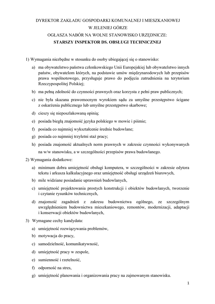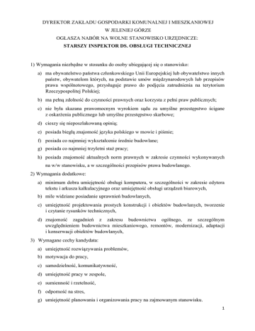 DYREKTOR ZAKŁADU GOSPODARKI KOMUNALNEJ I MIESZKANIOWEJ W JELENIEJ GÓRZE OGŁASZA NABÓR NA WOLNE STANOWISKO URZĘDNICZE: STARSZY INSPEKTOR DS. OBSŁUGI TECHNICZNEJ 1) Wymagania niezbędne w stosunku do osoby ubiegającej się o stanowisko: a) ma obywatelstwo państwa członkowskiego Unii Europejskiej lub obywatelstwo innych państw, obywatelom których, na podstawie umów międzynarodowych lub przepisów prawa wspólnotowego, przysługuje prawo do podjęcia zatrudnienia na terytorium Rzeczypospolitej Polskiej; b) ma pełną zdolność do czynności prawnych oraz korzysta z pełni praw publicznych; c) nie była skazana prawomocnym wyrokiem sądu za umyślne przestępstwo ścigane z oskarżenia publicznego lub umyślne przestępstwo skarbowe; d) cieszy się nieposzlakowaną opinią; e) posiada biegłą znajomość języka polskiego w mowie i piśmie; f) posiada co najmniej wykształcenie średnie budowlane; g) posiada co najmniej trzyletni staż pracy; h) posiada znajomość aktualnych norm prawnych w zakresie czynności wykonywanych na w/w stanowisku, a w szczególności przepisów prawa budowlanego. 2) Wymagania dodatkowe: a) minimum dobra umiejętność obsługi komputera, w szczególności w zakresie edytora tekstu i arkusza kalkulacyjnego oraz umiejętność obsługi urządzeń biurowych, b) mile widziane posiadanie uprawnień budowlanych, c) umiejętność projektowania prostych konstrukcji i obiektów budowlanych, tworzenie i czytanie rysunków technicznych, d) znajomość zagadnień z zakresu budownictwa ogólnego, ze szczególnym uwzględnieniem budownictwa mieszkaniowego, remontów, modernizacji, adaptacji i konserwacji obiektów budowlanych, 3) Wymagane cechy kandydata: a) umiejętność rozwiązywania problemów, b) motywacja do pracy, c) samodzielność, komunikatywność, d) umiejętność pracy w zespole, e) sumienność i rzetelność, f) odporność na stres, g) umiejętność planowania i organizowania pracy na zajmowanym stanowisku. 1 4) Do zakresu czynności na w/w stanowisku będzie należało w szczególności: a) prowadzenie książek obiektów, b) przygotowywanie dokumentacji dotyczącej rozbiórek obiektów, c) bieżąca kontrola stanu technicznego i sanitarnego nieruchomości, d) typowanie robót wszystkich branż koniecznych do realizacji z określeniem stopnia zużycia elementów, e) dokonywanie czynności zdawczo-odbiorczych nieruchomości, m.in. zakresie oceny stanu technicznego nieruchomości, f) przygotowywanie dokumentacji związanej ze zwrotem kosztów dla użytkownika lokalu za prace obciążające wynajmującego, g) uczestniczenie w komisjach odbiorczych wykonania zleconych oraz w komisjach przeglądów gwarancyjnych i pogwarancyjnych, remontów h) przygotowywanie stosownej dokumentacji m.in. umów na roboty budowlane dla inwestorów oraz dla użytkowników nieruchomości oraz kontrolowanie realizacji robót, dokonanie odbiorów i rozliczanie robót, i) podejmowanie działań zmierzających do realizacji zaleceń kominiarskich, PINB-u i innych podmiotów, j) przyjmowanie interesantów i udzielanie niezbędnych informacji w zakresie zajmowanego stanowiska, 5) Informacje o warunkach pracy na danym stanowisku: - określenie warunków pracy: praca w budynku ZGKiM przy ul. Podgórnej 9 w Jeleniej Górze (budynek nie jest wyposażony w windę oraz nie jest przystosowany do poruszania się na wózku inwalidzkim) a także możliwość oddelegowania pracownika poza miejsce wykonywania pracy (w tym: konferencje, szkolenia), - stanowisko związane z pracą przy monitorze ekranowym, - termin rozpoczęcia pracy: styczeń 2017 r., - wymiar zatrudnienia: pełny etat, - rodzaj umowy: umowa o pracę na czas określony 6 miesięcy, z możliwością jej przedłużenia na czas nieokreślony. 6) Wymagane dokumenty: - życiorys (CV), - list motywacyjny, - oświadczenie o treści: „Posiadam pełną zdolność do czynności prawnych oraz korzystam w pełni z praw publicznych, nie byłam/byłem skazana/y 2 prawomocnym wyrokiem sądu za umyśle przestępstwo ścigane z oskarżenia publicznego lub umyślne przestępstwo skarbowe”, - kopia dokumentu tożsamości, - kopie dokumentów potwierdzających: wykształcenie, doświadczenie zawodowe. Wymagane dokumenty aplikacyjne należy składać w terminie do dnia 06.12.2016 do godz. 15.00 w sekretariacie ZGKiM ul. Podgórna 9 w Jeleniej Górze z dopiskiem „Nabór na stanowisko urzędnicze: starszy inspektor ds. obsługi technicznej – nie otwierać” lub wysłać na adres: Zakład Gospodarki Komunalnej i Mieszkaniowej ul. Podgórna 9, 58 – 500 Jelenia Góra z dopiskiem j/w. Dokumenty aplikacyjne, które wpłyną po godz. 15.00 dnia 06.12.2016 nie będą podlegały procedurze naboru. Dyrektor może w każdym czasie i na każdym etapie unieważnić procedurę naboru. Kandydaci zostaną powiadomieni o zakończeniu procedury naboru. Dokumenty kandydata wybranego w naborze i zatrudnionego w Zakładzie zostaną dołączone do jego akt osobowych. Dokumenty pozostałych kandydatów nie będą odsyłane (prosimy nie dołączać oryginałów dokumentów potwierdzających: wykształcenie, doświadczenie zawodowe, itp.). Ogłoszenie jest opublikowane w Biuletynie Informacji Publicznej ZGKiM http://zgkim.bip.jeleniagora.pl oraz wywieszone na tablicy informacyjnej ZGKiM przy ul. Podgórnej 9 w Jeleniej Górze. Wskaźnik zatrudnienia osób niepełnosprawnych w ZGKiM jest wyższy niż 6%. Wymagane dokumenty: list motywacyjny oraz CV powinny być opatrzoną klauzulą: „Wyrażam zgodę na przetwarzanie moich danych osobowych, zawartych w ofercie pracy dla potrzeb niezbędnych do realizacji procesu rekrutacji, zgodnie z Ustawą z dnia 29.08.1997 r. o ochronie danych osobowych (Dz. U. z 2002 r. nr 101, poz. 926 ze zm.) oraz Ustawą z dnia 21.11.2008 o pracownikach samorządowych (Dz. U. z 2008r. nr. 223, poz. 1458 ze zm.)” oraz własnoręcznym podpisem. 3