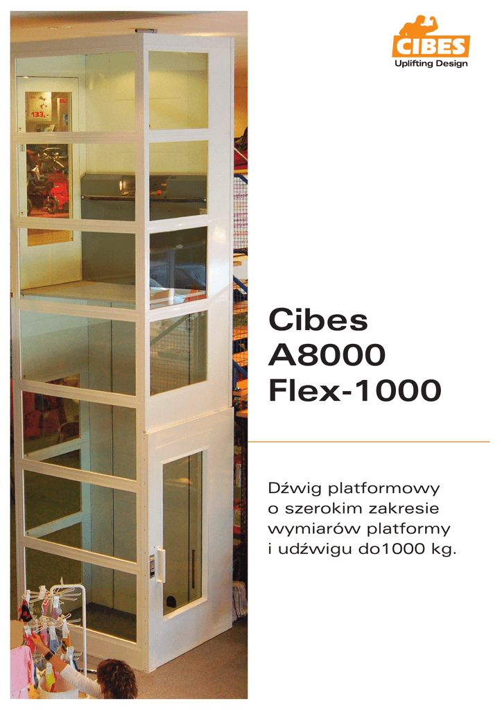 Cibes A8000 Flex-1000 Dźwig platformowy o szerokim zakresie wymiarów platformy i udźwigu do1000 kg. • Standardowe wymiary platformy 1405 x 1989 mm (szerokość x głębokość) • Szerokość platformy w zakresie 1005 – 1405 mm • Głębokość platformy w zakresie 1480 – 2480 mm • Niewymagane podszybie • Drzwi przeszklone panoramicznie lub małą szybą • Szyb z paneli szklanych ze szkła laminowanego, hartowanego lub paneli stalowych • Wszystkie kolory z palety RAL • Wersja do montażu na zewnątrz lub wewnątrz budynków Bezpieczeństwo Listwy przeciwzakleszczeniowe, przycisk wzywania pomocy, oświetlenie awaryjne gwarantują poczucie bezpieczeństwa. Szybki montaż Dźwig Cibes A8000 Flex-1000 może być montowany na podłodze, bez podszybia, i jest dostarczany wraz z prefabrykowanym szybem z paneli stalowych lub paneli z hartowanego, laminowanego szkła. Oznakowanie CE Platforma dźwigowa A8000 Flex -1000 jest oznaczona znakiem CE, co potwierdza spełnienie wymagań Europejskiej Dyrektywy. DANE TECHNICZNE, CIBES A8000-FLEX1000 Udźwig Prędkość Wysokość podnoszenia Liczba przystanków Sterowanie 1000 kg < 0,15 m/s ≤ 13 m 6 (maksymalnie) Przyciskami wymagającymi wciskania w czasie jazdy Platforma, standardowa 1405 x 1980 mm (szerokość x głębokość) Platforma, niestandardowa Szerokość 1005 - 1405 mm (co 100 mm) Głębokość 1480 - 2480 mm (co 100 mm) Wymiary szybu Szerokość: wymiar platformy + 420 mm (otwór w stropie: Głębokość: wymiar platformy + 100 mm wymiar szybu + 30 mm) Głębokość przy przejeździe na wprost: wymiar platformy + 120 mm Drzwi, standardowe 1300 x 2000 mm Podszybie 200 mm Opcjonalnie: rampa Wykończenie szybu RAL 9010 Wykończenie platformy RAL 9007 Rodzaj napędu Śrubowy, gwint samohamowny Moc silnika 3 fazy, 4,0 kW Zasilanie 400 V, 3 fazy, zabezpieczenie 16 A, zwłoczne Falownik zapewniający łagodny start i hamowanie – standardowy Opcje Telefony, blokady, automatyczne otwieracze drzwi, przyciski naciskane ramieniem, składane siedzenie, bateryjny zjazd awaryjny, sterowanie podczerwienią, automatyczne oświetlenie szybu, sygnał dźwiękowy zatrzymania na przystanku itp. głębokość szerokość Cibes Lift AB, P.O.Box 6, SE-811 02 Järbo, Szwecja. Tel: +46 290 295 50. Fax: +46 290 295 69 [email protected]. www.cibeslift.com Zastrzegamy sobie prawo wprowadzania zmian w produktach. © Cibes Lift AB 2010 – Wszelkie prawa zastrzeżone RCD000594650-0001 F 12 PL 10 10 Cibes A8000 Flex-1000 jest d źwigiem platformowym towarowo – osobowym, zaprojektowanym z myśla˛ o transportowaniu ładunków do 1000 kg. Dzieki ˛ szerokiemu zakresowi wymiarów platformy d źwig A8000 Flex-1000 jest uniwersalna˛ propozycja˛ dla każdej lokalizacji, np. budynków prywatnych i użyteczności publicznej, pawilonów handlowych, biur, restauracji, fabryk, przychodni, szpitali, szkół, etc.