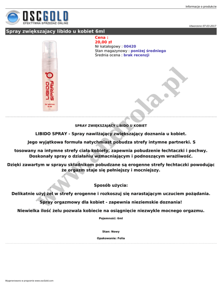 Informacje o produkcie Utworzono 07-03-2017 Spray zwiększajacy libido u kobiet 6ml Cena : 20,00 zł ro la .p l Nr katalogowy : 00420 Stan magazynowy : poniżej średniego Średnia ocena : brak recenzji SPRAY ZWIĘKSZAJĄCY LIBIDO U KOBIET nd LIBIDO SPRAY - Spray nawilżający zwiększający doznania u kobiet. Jego wyjątkowa formuła natychmiast pobudza strefy intymne partnerki. S w .a tosowany na intymne strefy ciała kobiety, zapewnia pobudzenie łechtaczki i pochwy. Doskonały spray o działaniu wzmacniającym i podnoszącym wrażliwość. w Dzięki zawartym w sprayu składnikom pobudzane są erogenne strefy łechtaczki powodując że orgazm staje się pełniejszy i mocniejszy. Sposób użycia: w Delikatnie użyj żel w strefy erogenne i rozkoszuj się narastającym uczuciem pożądania. Spray orgazmowy dla kobiet - zapewnia nieziemskie doznania! Niewielka ilość żelu pozwala kobiecie na osiągnięcie niezwykle mocnego orgazmu. Pojemność: 6ml Stan: Nowy Opakowanie: Folia Wygenerowano w programie www.oscGold.com