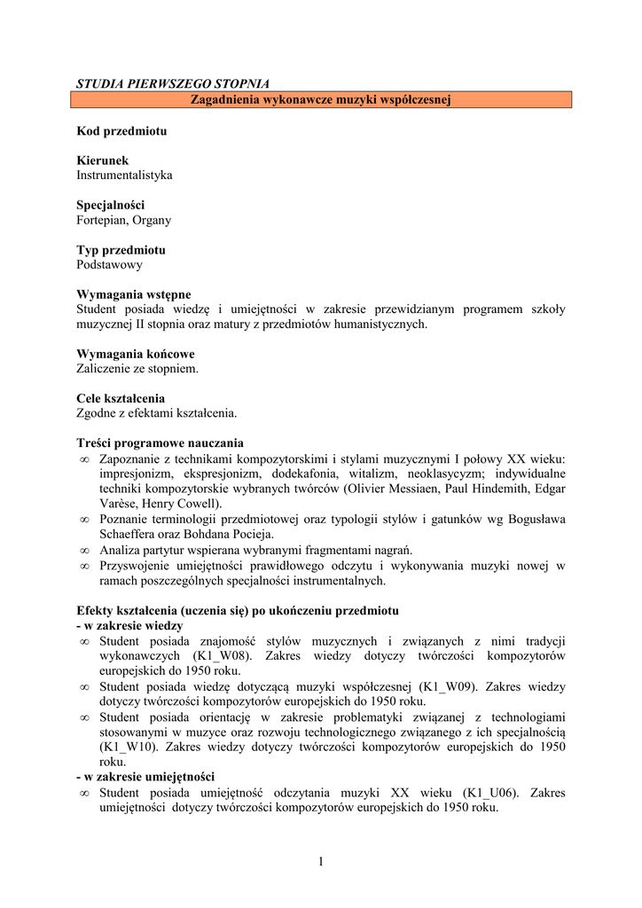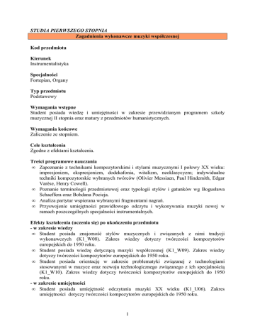 STUDIA PIERWSZEGO STOPNIA Zagadnienia wykonawcze muzyki współczesnej Kod przedmiotu Kierunek Instrumentalistyka Specjalności Fortepian, Organy Typ przedmiotu Podstawowy Wymagania wstępne Student posiada wiedzę i umiejętności w zakresie przewidzianym programem szkoły muzycznej II stopnia oraz matury z przedmiotów humanistycznych. Wymagania końcowe Zaliczenie ze stopniem. Cele kształcenia Zgodne z efektami kształcenia. Treści programowe nauczania • Zapoznanie z technikami kompozytorskimi i stylami muzycznymi I połowy XX wieku: impresjonizm, ekspresjonizm, dodekafonia, witalizm, neoklasycyzm; indywidualne techniki kompozytorskie wybranych twórców (Olivier Messiaen, Paul Hindemith, Edgar Varèse, Henry Cowell). • Poznanie terminologii przedmiotowej oraz typologii stylów i gatunków wg Bogusława Schaeffera oraz Bohdana Pocieja. • Analiza partytur wspierana wybranymi fragmentami nagrań. • Przyswojenie umiejętności prawidłowego odczytu i wykonywania muzyki nowej w ramach poszczególnych specjalności instrumentalnych. Efekty kształcenia (uczenia się) po ukończeniu przedmiotu - w zakresie wiedzy • Student posiada znajomość stylów muzycznych i związanych z nimi tradycji wykonawczych (K1_W08). Zakres wiedzy dotyczy twórczości kompozytorów europejskich do 1950 roku. • Student posiada wiedzę dotyczącą muzyki współczesnej (K1_W09). Zakres wiedzy dotyczy twórczości kompozytorów europejskich do 1950 roku. • Student posiada orientację w zakresie problematyki związanej z technologiami stosowanymi w muzyce oraz rozwoju technologicznego związanego z ich specjalnością (K1_W10). Zakres wiedzy dotyczy twórczości kompozytorów europejskich do 1950 roku. - w zakresie umiejętności • Student posiada umiejętność odczytania muzyki XX wieku (K1_U06). Zakres umiejętności dotyczy twórczości kompozytorów europejskich do 1950 roku. 1 • Student posiada umiejętność właściwego odczytania tekstu nutowego, biegłego i pełnego przekazania materiału muzycznego, zawartych w utworze idei i jego formy (K1_U09). Zakres umiejętności dotyczy twórczości kompozytorów europejskich do 1950 roku. - w zakresie kompetencji społecznych • Student umie posługiwać się fachową terminologią z zakresu dziedziny muzyki (K1_K10). Zakres kompetencji dotyczy twórczości kompozytorów europejskich do 1950 roku. Metody nauczania Ćwiczenia - analiza przykładów muzycznych pod względem harmoniki, rytmiki, melodyki, faktury, formy, notacji oraz aspektów wykonawczych na przykładzie partytur i nagrań. Nakład pracy studenta potrzebny do osiągnięcia efektów uczenia się ROK SEMESTR I 1 II 2 3 Punkty ECTS Ilość godzin w semestrze Rodzaj zaliczenia LEGENDA III 4 5 6 1 15 zs zal – zaliczony; zs – zaliczenie ze stopniem; egz – egzamin; ed – egzamin dyplomowy Kryteria oceny Ocenie podlega wiedza studenta sprawdzana przy pomocy kolokwium pisemnego (pracy pisemnej). Pytania dotyczą znajomości stylów, cech języka muzycznego wybranych kompozytorów, terminologii muzycznej, technik wykonawczych i kompozytorskich I połowy XX wieku. Literatura (piśmiennictwo) Antokoletz E., Muzyka XX wieku, POZKAL, Poznań 2009. Jarociński S., Orfeusz na rozdrożu, PWM, Kraków 1974. Schäffer B., Mały informator muzyki XX wieku, PWM, Kraków 1987. Zieliński T., Style, kierunki i twórcy muzyki XX wieku, COMUK, Warszawa 1980. Język wykładowy Polski, angielski, niemiecki, rosyjski Imię i nazwisko wykładowcy dr Artur Zagajewski dr Sławomir Zamuszko 2