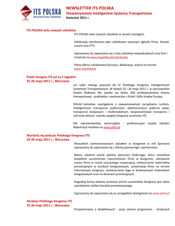 NEWSLETTER ITS POLSKA Stowarzyszenie Inteligentne Systemy Transportowe Kwiecieo 2011 r. ITS POLSKA wita nowych członków ITS POLSKA wita nowych członków w swoich szeregach. Deklarację członkostwa jako członkowie zwyczajni zgłosiły firmy: AlcatelLucent oraz PTV. Zapraszamy do zapoznania się z listą członków indywidualnych oraz firm i instytucji na www.itspolska.pl/czlonkowie Pełna oferta członkostwa (korzyści, deklaracje, statut) na stronie www.itspolska.pl Polski Kongres ITS już za 5 tygodni! 25-26 maja 2011 r., Warszawa Już tylko miesiąc pozostał do IV Polskiego Kongresu Inteligentnych Systemów Transportowych. W dniach 25 i 26 maja 2011 r. w warszawskim Hotelu Radisson Blu spotka się blisko 200 profesjonalistów branży transportowej - praktyków i naukowców z Polski i kilku krajów Europy. Wśród tematów: wystąpienia o zaawansowanym zarządzaniu ruchem, inteligentnym transporcie publicznym, elektronicznym poborze opłat, transporcie kolejowym i multimodalnym, bezpieczeostwie transportu i ochronie danych, szeroko pojętej integracji systemów ITS. Dla reprezentantów samorządów - preferencyjne zasady udziału! Rejestracja możliwa na www.pkits.pl Wyróżnij się podczas Polskiego Kongresu ITS 25-26 maja 2011 r., Warszawa Wszystkich zainteresowanych udziałem w Kongresie w roli Sponsora zapraszamy do zapoznania się z ofertą sponsoringu i partnerstwa. Mamy ostatnie wolne pakiety Sponsora Srebrnego, który umożliwia bezpłatne uczestnictwo reprezentanta firmy w Kongresie, odczytanie nazwy firmy w czasie uroczystego rozpoczęcia, umieszczenie materiałów promocyjnych w teczkach kongresowych, prezentację firmy na stronie internetowej kongresu, zamieszczenie logo w drukowanych materiałach kongresowych oraz na ekranach promocyjnych. Dogodną formą własnej promocji wśród uczestników Kongresu jest także zamówienie stolika (stoiska) prezentacyjnego. Zapraszamy do zapoznania się ze szczegółami dostępnymi na www.pkits.pl Atrakcje Polskiego Kongresu ITS 25-26 maja 2011 r., Warszawa Przypominamy o dodatkowych - poza samym programem - atrakcjach czekających na uczestników PKITS. Przed dwa dni spotykad się można przy kilkunastu stoiskach, na których prezentowane będą najnowsze produkty i oferty usług branży ITS. Wieczorne przyjęcie w historycznych wnętrzach Centrum Sztuki Zachęta zapewni godną oprawę dla uroczystego finału Konkursu Lider ITS. Tam też nastąpi losowanie nagrody - autorskiego urządzenia do nawigacji ufundowanego przez Autoguard. Każda przerwa będzie okazją do owocnego networkingu - ale tu już niezbędna jest własną aktywnośd. Nadal zachęcamy do wykorzystania ofert partnerskich - zapewniania materiałów do teczek kongresowych, smyczy do identyfikatorów, własnych prezentacji stolikowych. Więcej na www.pkits.pl Wspólna promocja w planowanym dodatku „Rzeczpospolitej” pod roboczym tytułem „Inteligentne Systemy Transportowe w Polsce” Z uwagi na wzmożone zainteresowanie implementacją Inteligentnych Systemów Transportowych przez administrację publiczną oraz struktury rządowe nadal czekamy na Paostwa zgłoszenia współudziału we wspólnej promocji tematyki ITS na łamach Rzeczpospolitej. Planowany termin wydania maj br. Aby utrzymad merytoryczną wartośd dodatku jako źródła informacji o produktach i usługach związanych z ITS, cała powierzchnia przeznaczona zostanie na problemowe artykuły sponsorowane. Najmniejsza powierzchnia to 1 moduł zawierający tytuł artykułu, tekst 2000 znaków ze spacjami oraz ilustrację. 2 moduły pomieszczą tekst 4000 znaków ze spacjami, 3 moduły 6000 znaków ze spacjami, 4 moduły 8000 znaków ze spacjami. Na Paostwa zgłoszenia czekamy droga mailową: [email protected] lub tel. 22 630 99 09. Zapraszamy do zapoznania się z załączonymi informacjami - pobierz ofertę Wywiad Przeglądu ITS nt. „Wdrożenia projektu Inteligentny system transportu ITS Wrocław Błażej Trzcinowicz, kierownik projektu ITS Wrocław ITS POLSKA wydawca „Przeglądu ITS” serdecznie zaprasza do lektury wywiadu przeprowadzonego z p. Błażejem Trzcinowiczem, kierownikiem projektu ITS Wrocław. Temat rozmowy dotyczy wdrożenia projektu „Inteligentny system transportu ITS Wrocław”. Aby przeczytad wywiad wejdź na www.przeglad-its.pl Wspólne stoisko członków ITS POLSKA na Targach TRAFFIC-EXPO 10-13 maja 2011 r., Kielce ITS POLSKA serdecznie zaprasza do umawiania spotkao z Członkami Stowarzyszenia na stoisku A-24 w pawilonie A podczas dorocznych Międzynarodowych Targów Infrastruktury Traffic-Expo odbywających się w dniach 10-13 maja 2011 r. w Kielcach. Informujemy, że na stoisku o pow. 24m2 wystawią się: APM, Neurosoft, Sprint, Grupa UTI Polska oraz ITS POLSKA wraz z Przeglądem ITS. Podsumowanie seminarium pt. „Centra Zarządzania - Technologie, Organizacje, Finansowanie” 21 kwietnia 2011 r., Poznao W dniu 21 kwietnia 2011 r. w Hotelu Quality w Poznaniu odbyło się seminarium nt. „Centra Zarządzania Ruchem - Technologie, Organizacje, Finansowanie”. Organizatorem spotkania było Stowarzyszenie Inteligentne Systemy Transportowe ITS POLSKA. Patronat nad wydarzeniem objęła Generalna Dyrekcja Dróg Krajowych i Autostrad w Poznaniu, a Partnerami zostali Zarząd Dróg Miejskich w Poznaniu oraz Politechnika Poznaoska. Celem seminarium było poruszenie problematyki koncepcji planowania i projektowania, wymiarowania, projektowania wnętrz, stosowanych ścian graficznych, stacji roboczych, serwerowni i przykładów funkcjonowania Centr Zarządzania Ruchem w innym miastach oraz uwarunkowao prawnych i konieczności współpracy m.in. z GDDKiA. Swój udział w seminarium zgłosiło blisko 80 osób w tym reprezentanci sektora usług stanowili 47%, jednostek samorządowych - 41%, uczelni 5%, instytutów badawczych i organizacji - 4% oraz prasy - 3%. W pierwszej części programu swoją ofertę jako m.in. Partnerzy Merytoryczni przedstawili mówcy z firmy: Barco, Gevas Software, 