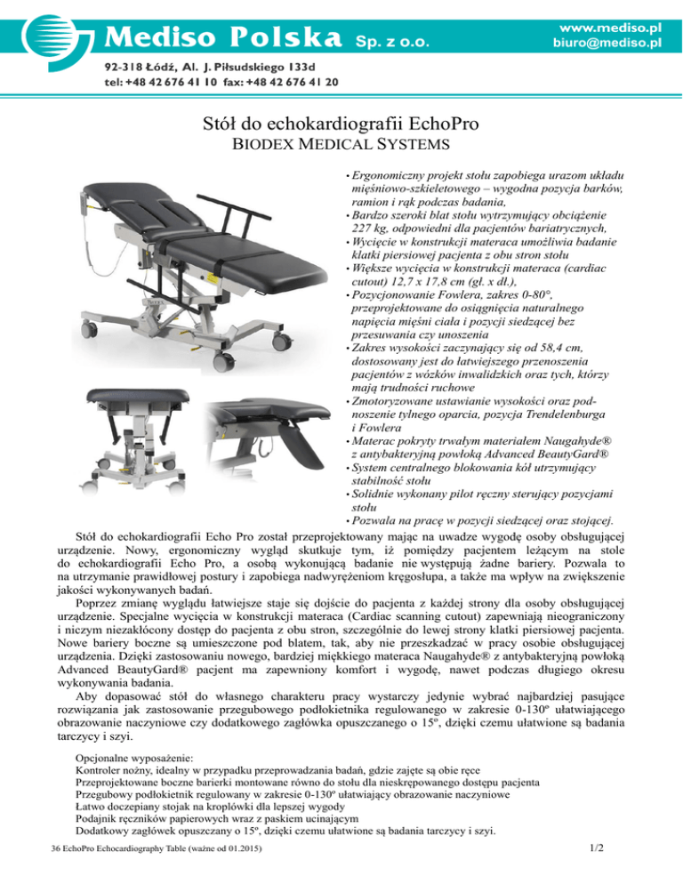 Stół do echokardiografii EchoPro BIODEX MEDICAL SYSTEMS • Ergonomiczny projekt stołu zapobiega urazom układu mięśniowo-szkieletowego – wygodna pozycja barków, ramion i rąk podczas badania, • Bardzo szeroki blat stołu wytrzymujący obciążenie 227 kg, odpowiedni dla pacjentów bariatrycznych, • Wycięcie w konstrukcji materaca umożliwia badanie klatki piersiowej pacjenta z obu stron stołu • Większe wycięcia w konstrukcji materaca (cardiac cutout) 12,7 x 17,8 cm (gł. x dł.), • Pozycjonowanie Fowlera, zakres 0-80°, przeprojektowane do osiągnięcia naturalnego napięcia mięśni ciała i pozycji siedzącej bez przesuwania czy unoszenia • Zakres wysokości zaczynający się od 58,4 cm, dostosowany jest do łatwiejszego przenoszenia pacjentów z wózków inwalidzkich oraz tych, którzy mają trudności ruchowe • Zmotoryzowane ustawianie wysokości oraz podnoszenie tylnego oparcia, pozycja Trendelenburga i Fowlera • Materac pokryty trwałym materiałem Naugahyde® z antybakteryjną powłoką Advanced BeautyGard® • System centralnego blokowania kół utrzymujący stabilność stołu • Solidnie wykonany pilot ręczny sterujący pozycjami stołu • Pozwala na pracę w pozycji siedzącej oraz stojącej. Stół do echokardiografii Echo Pro został przeprojektowany mając na uwadze wygodę osoby obsługującej urządzenie. Nowy, ergonomiczny wygląd skutkuje tym, iż pomiędzy pacjentem leżącym na stole do echokardiografii Echo Pro, a osobą wykonującą badanie nie występują żadne bariery. Pozwala to na utrzymanie prawidłowej postury i zapobiega nadwyrężeniom kręgosłupa, a także ma wpływ na zwiększenie jakości wykonywanych badań. Poprzez zmianę wyglądu łatwiejsze staje się dojście do pacjenta z każdej strony dla osoby obsługującej urządzenie. Specjalne wycięcia w konstrukcji materaca (Cardiac scanning cutout) zapewniają nieograniczony i niczym niezakłócony dostęp do pacjenta z obu stron, szczególnie do lewej strony klatki piersiowej pacjenta. Nowe bariery boczne są umieszczone pod blatem, tak, aby nie przeszkadzać w pracy osobie obsługującej urządzenia. Dzięki zastosowaniu nowego, bardziej miękkiego materaca Naugahyde® z antybakteryjną powłoką Advanced BeautyGard® pacjent ma zapewniony komfort i wygodę, nawet podczas długiego okresu wykonywania badania. Aby dopasować stół do własnego charakteru pracy wystarczy jedynie wybrać najbardziej pasujące rozwiązania jak zastosowanie przegubowego podłokietnika regulowanego w zakresie 0-130º ułatwiającego obrazowanie naczyniowe czy dodatkowego zagłówka opuszczanego o 15º, dzięki czemu ułatwione są badania tarczycy i szyi. Opcjonalne wyposażenie: Kontroler nożny, idealny w przypadku przeprowadzania badań, gdzie zajęte są obie ręce Przeprojektowane boczne barierki montowane równo do stołu dla nieskrępowanego dostępu pacjenta Przegubowy podłokietnik regulowany w zakresie 0-130º ułatwiający obrazowanie naczyniowe Łatwo doczepiany stojak na kroplówki dla lepszej wygody Podajnik ręczników papierowych wraz z paskiem ucinającym Dodatkowy zagłówek opuszczany o 15º, dzięki czemu ułatwione są badania tarczycy i szyi. 36 EchoPro Echocardiography Table (ważne od 01.2015) 1/2 SPECYFIKACJA: Wymiary: 185.4 x 76.2 cm (dł. x szer.); 88.9 cm (wys.) razem z opcjonalnymi bocznymi barierkami Regulowana wysokość: od 58.4 do 99 cm Cardiac Scanning Cutout: specjalne wycięcia w konstrukcji materaca 21,1 x 40 cm Sonographer Cutout: specjalne wycięcia w konstrukcji materaca dla osoby wykonującej badanie, które są regulowane tak, aby zwiększyć dostęp do pacjenta; 20,3 x 37,4 cm Części ruchome: • Regulowana wysokość: od 58.4 do 99 cm • Pozycja Trendelenburga: 0º do ±15º • Oparcie: regulacja od 0º do 80º Sterowanie: • Sterownik ręczny: wysokości, oparcia (pozycja Fowlera), pozycja Trendelenburga • Sterownik nożny (opcjonalny): wysokości, oparcia (pozycja Fowlera), pozycja Trendelenburga Kółka: 12.7 cm, blokada dla każdego z osobna, kółka obracające się, samonastawne, system centralnego blokowania Blat stołu: dwa podstawowe odcinki: odcinek dla tułowia: cechuje się specjalnymi wycięciami przeznaczonymi zarówno dla pacjenta, jak i osoby wykonującej badanie i możliwością ustawiania tylnego oparcia do pozycji Fowlera oraz odcinek dla dolnych części ciała, który pozostaje nieruchomy. Materac: odcinek dla tułowia o grubości 5 cm, odcinek dla dolnych części ciała o grubości 8 cm; guma piankowa pokryta trwałym materiałem Naugahyde® z antybakteryjną powłoką Advanced BeautyGard® Kolor obicia: grafit Ograniczanie ruchów pacjenta: Dwa pasy ograniczające Wykończenie: Lakier proszkowy Dopuszczalna waga pacjenta: 227 kg; waga testowana dla czterokrotnego obciążenia pacjenta Waga: 152 kg Zasilanie: 230 VAC Gwarancja: Dwa lata Certyfikaty: EN 60601-1 058-705 Stół do echokardiografii, EchoPro (Zawiera sterownik ręczny) Opcje dodatkowe: 058-633 Składane boczne barierki 058-736 Podkładka na ramię ułatwiająca obrazowanie naczyniowe 058-737 Pręt na kroplówki 058-740 Kontroler nożny 058-611 Dozownik ręczników papierowych (wraz z paskiem ucinającym) 058-738 Dodatkowy zagłówek Wymiennie: 058-612 Higieniczny ręcznik papierowy, 12 rolek (46 cm x 69 m) 36 EchoPro Echocardiography Table (ważne od 01.2015) 2/2