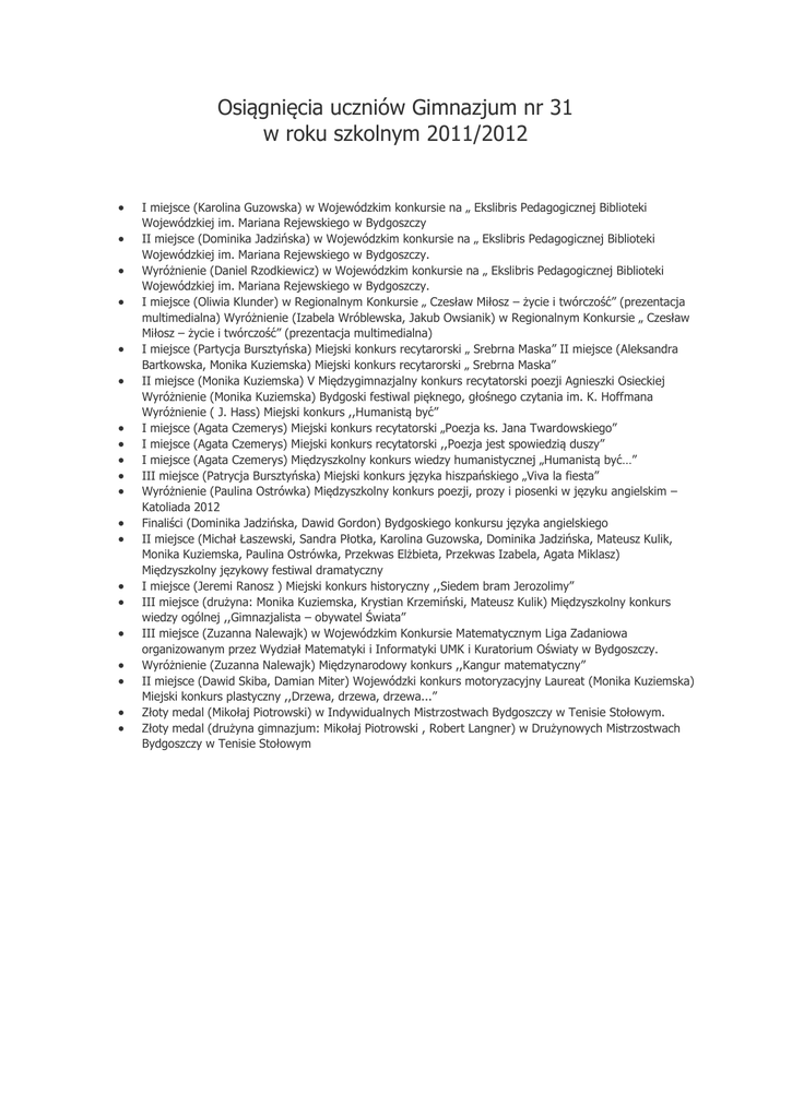 Osiągnięcia uczniów Gimnazjum nr 31 w roku szkolnym 2011/2012 I miejsce (Karolina Guzowska) w Wojewódzkim konkursie na „ Ekslibris Pedagogicznej Biblioteki Wojewódzkiej im. Mariana Rejewskiego w Bydgoszczy II miejsce (Dominika Jadzińska) w Wojewódzkim konkursie na „ Ekslibris Pedagogicznej Biblioteki Wojewódzkiej im. Mariana Rejewskiego w Bydgoszczy. Wyróżnienie (Daniel Rzodkiewicz) w Wojewódzkim konkursie na „ Ekslibris Pedagogicznej Biblioteki Wojewódzkiej im. Mariana Rejewskiego w Bydgoszczy. I miejsce (Oliwia Klunder) w Regionalnym Konkursie „ Czesław Miłosz – życie i twórczość” (prezentacja multimedialna) Wyróżnienie (Izabela Wróblewska, Jakub Owsianik) w Regionalnym Konkursie „ Czesław Miłosz – życie i twórczość” (prezentacja multimedialna) I miejsce (Partycja Bursztyńska) Miejski konkurs recytarorski „ Srebrna Maska” II miejsce (Aleksandra Bartkowska, Monika Kuziemska) Miejski konkurs recytarorski „ Srebrna Maska” II miejsce (Monika Kuziemska) V Międzygimnazjalny konkurs recytatorski poezji Agnieszki Osieckiej Wyróżnienie (Monika Kuziemska) Bydgoski festiwal pięknego, głośnego czytania im. K. Hoffmana Wyróżnienie ( J. Hass) Miejski konkurs ,,Humanistą być” I miejsce (Agata Czemerys) Miejski konkurs recytatorski „Poezja ks. Jana Twardowskiego” I miejsce (Agata Czemerys) Miejski konkurs recytatorski ,,Poezja jest spowiedzią duszy” I miejsce (Agata Czemerys) Międzyszkolny konkurs wiedzy humanistycznej „Humanistą być…” III miejsce (Patrycja Bursztyńska) Miejski konkurs języka hiszpańskiego „Viva la fiesta” Wyróżnienie (Paulina Ostrówka) Międzyszkolny konkurs poezji, prozy i piosenki w języku angielskim – Katoliada 2012 Finaliści (Dominika Jadzińska, Dawid Gordon) Bydgoskiego konkursu języka angielskiego II miejsce (Michał Łaszewski, Sandra Płotka, Karolina Guzowska, Dominika Jadzińska, Mateusz Kulik, Monika Kuziemska, Paulina Ostrówka, Przekwas Elżbieta, Przekwas Izabela, Agata Miklasz) Międzyszkolny językowy festiwal dramatyczny I miejsce (Jeremi Ranosz ) Miejski konkurs historyczny ,,Siedem bram Jerozolimy” III miejsce (drużyna: Monika Kuziemska, Krystian Krzemiński, Mateusz Kulik) Międzyszkolny konkurs wiedzy ogólnej ,,Gimnazjalista – obywatel Świata” III miejsce (Zuzanna Nalewajk) w Wojewódzkim Konkursie Matematycznym Liga Zadaniowa organizowanym przez Wydział Matematyki i Informatyki UMK i Kuratorium Oświaty w Bydgoszczy. Wyróżnienie (Zuzanna Nalewajk) Międzynarodowy konkurs ,,Kangur matematyczny” II miejsce (Dawid Skiba, Damian Miter) Wojewódzki konkurs motoryzacyjny Laureat (Monika Kuziemska) Miejski konkurs plastyczny ,,Drzewa, drzewa, drzewa...” Złoty medal (Mikołaj Piotrowski) w Indywidualnych Mistrzostwach Bydgoszczy w Tenisie Stołowym. Złoty medal (drużyna gimnazjum: Mikołaj Piotrowski , Robert Langner) w Drużynowych Mistrzostwach Bydgoszczy w Tenisie Stołowym