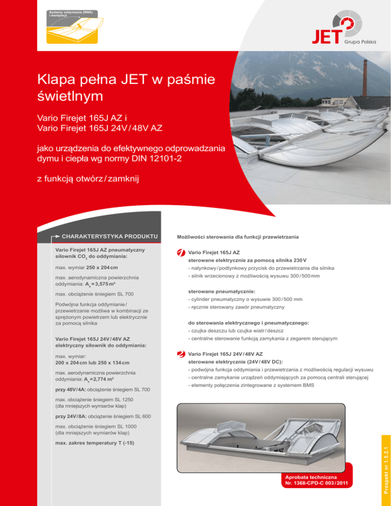 Systemy oddymiania (RWA) i wentylacji Klapa pełna JET w paśmie świetlnym Vario Firejet 165J AZ i Vario Firejet 165J 24V / 48V AZ jako urządzenia do efektywnego odprowadzania dymu i ciepła wg normy DIN 12101-2 z funkcją otwórz / zamknij CHARAKTERYSTYKA PRODUKTU Vario Firejet 165J AZ pneumatyczny siłownik CO2 do oddymiania: Możliwości sterowania dla funkcji przewietrzania 1 Vario Firejet 165J AZ sterowane elektrycznie za pomocą silnika 230 V max. wymiar 250 x 204 cm - natynkowy / podtynkowy przycisk do przewietrzania dla silnika ax. aerodynamiczna powierzchnia m oddymiania: Aa = 3,575 m² - silnik wrzecionowy z możliwością wysuwu 300 / 500 mm sterowane pneumatycznie: - cylinder pneumatyczny o wysuwie 300 / 500 mm - ręcznie sterowany zawór pneumatyczny do sterowania elektrycznego i pneumatycznego: - czujka deszczu lub czujka wiatr / deszcz - centralne sterowanie funkcją zamykania z zegarem sterującym max. obciążenie śniegiem SL 700 odwójna funkcja oddymianie / P przewietrzanie możliwa w kombinacji ze sprężonym powietrzem lub elektrycznie za pomocą silnika Vario Firejet 165J 24V / 48V AZ elektryczny siłownik do oddymiania: ax. wymiar: m 200 x 204 cm lub 250 x 134 cm ax. aerodynamiczna powierzchnia m oddymiania: Aa = 2,774 m² przy 48V / 4A: obciążenie śniegiem SL 700 2 Vario Firejet 165J 24V / 48V AZ sterowane elektrycznie (24V / 48V DC): - podwójna funkcja oddymiania i przewietrzania z możliwością regulacji wysuwu - centralne zamykanie urządzeń oddymiających za pomocą centrali sterującej - elementy połączenia zintegrowane z systemem BMS ax. obciążenie śniegiem SL 1250 m (dla mniejszych wymiarów klap) przy 24V / 8A: obciążenie śniegiem SL 600 max. obciążenie śniegiem SL 1000 (dla mniejszych wymiarów klap) Aprobata techniczna Nr. 1368-CPD-C 003 / 2011 Prospekt nr 1.5.2.1 max. zakres temperatury T (-15) Budownictwo przemysłowe Architektura Technika oddymiania (RWA) i Serwis Osprzęt: elektryczna centrala oddymiania JET RV 24 V / 48 V Zalety 24-woltowej techniki - działa prawie niesłyszalnie Funkcje: - codzienne przewietrzanie bez dodatkowego silnika - system kontrolujący prąd spoczynkowy - możliwość otwarcia klapy na dowolną wysokość - elementy połączenia zintegrowane z systemem BMS - łatwa konserwacja - sterowanie 2 grup możliwe za pomocą 1 centrali - zwarcia i przerwanie kabli są natychmiast rozpoznawane - optyczna sygnały dot. stanu centrali - wejścia na czujkę, przyciski i czujniki - podłączenie do czujki dymu lub systemu BMS Zalety 48-woltowej techniki - możliwość sterowania dwa razy większą ilością klap przewietrzających z jednej centrali - znaczna minimalizacja kosztów instalacji - zmniejszenie kosztów poprzez znacznie mniejszy przekrój kabli -e fektywne zmniejszenie kosztów projektowania -p ewność również przy wysokim obciążeniu śniegiem - k ompatybilność ze standardowymi produktami JET (przycisk do oddymiania JET, czujka dymu, centrala pogodowa itd.) Technologia 48 V Wartość oddymiania Aa (aerodynamiczna powierzchnia oddymiania) klapa pełna długość klapy pełnej = 100 cm wartość oddymiania Aa m² Długość klapy pełnej = 134 cm wartość oddymiania Aa m² Długość klapy pełnej = 204 cm wartość oddymiania Aa m² cm Vario Firejet 165J AZ Vario Firejet 165J 24V / 48V AZ Vario Firejet 165J AZ Vario Firejet 165J 24V / 48V AZ Vario Firejet 165J AZ Vario Firejet 165J 24V / 48V AZ 150 1,050 0,990 1,410 1,327 2,295 2,234 160 1,120 1,056 1,504 1,415 2,448 2,383 170 1,190 1,122 1,598 1,503 2,601 2,532 180 1,350 1,278 1,692 1,592 2,574 2,497 190 1,425 1,349 1,786 1,680 2,717 2,636 200 1,500 1,420 1,880 1,769 2,860 2,774 210 1,575 1,491 2,121 1,998 3,003 - 220 1,650 1,562 2,222 2,093 3,146 - 230 1,725 1,633 2,323 2,188 3,289 - 240 1,800 1,704 2,424 2,283 3,432 - 250 1,875 1,775 2,525 2,379 3,575 - szerokość JET Grupa Polska Sp. z o.o. JET Grupa Polska Sp. z o.o. ul. Kaliska 38 PL 62-300 Września Tel. +48 (0) 61 / 640 34-10 Faks +48 (0) 61 / 640 34-11 www.jet-polska.pl [email protected] ŚWIETLIKI KOPUŁKOWE ~ PASMA ŚWIETLNE ~ SYSTEMY ODDYMIANIA ~ SPECJALNE KONSTRUKCJE ZE SZKŁA I GRILLODURU ® ~ WYWIETRZAKI GRAWITACYJNE Obowiązuje od daty wydania aż do nowego nakładu. Stan: sierpień 2011 r. Za błędy w druku, pomyłki i zmiany techniczne nie ponosimy odpowiedzialności. - podłączenie większej ilości central za pomocą systemu magistrali - estetyczny wygląd dzięki płaskiemu położeniu