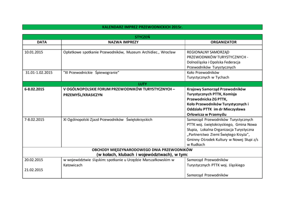 KALENDARZ IMPREZ PRZEWODNICKICH 2015r. DATA STYCZEŃ NAZWA IMPREZY 10.01.2015 Opłatkowe spotkanie Przewodników, Muzeum Archidiec., Wrocław 31.01-1.02.2015 "XI Przewodnickie Śpiewogranie" 6-8.02.2015 LUTY V OGÓLNOPOLSKIE FORUM PRZEWODNIKÓW TURYSTYCZNYCH – PRZEMYŚL/KRASICZYN 7-8.02.2015 ORGANIZATOR REGIONALNY SAMORZĄD PRZEWODNIKÓW TURYSTYCZNYCH Dolnośląska i Opolska Federacja Przewodników Turystycznych Koło Przewodników Turystycznych w Tychach Krajowy Samorząd Przewodników Turystycznych PTTK, Komisja Przewodnicka ZG PTTK, Koło Przewodników Turystycznych i Oddziału PTTK im dr Mieczysława Orłowicza w Przemyślu XI Ogólnopolski Zjazd Przewodników Świętokrzyskich Samorząd Przewodników Turystycznych PTTK woj. świętokrzyskiego, Gmina Nowa Słupia, Lokalna Organizacja Turystyczna „Partnerstwo Ziemi Świętego Krzyża”, Gminny Ośrodek Kultury w Nowej Słupi z/s w Rudkach OBCHODY MIĘDZYNARODOWEGO DNIA PRZEWODNIKÓW (w kołach, klubach i województwach), w tym: 20.02.2015 w województwie śląskim: spotkanie u Urzędzie Marszałkowskim w Katowicach Samorząd Przewodników Turystycznych PTTK woj. śląskiego 21.02.2015 Samorząd Przewodników - województwie podlaskim Turystycznych PTTK woj. podlaskiego - województwie pomorskim Pomorska Federacja Przewodnicka PTTK - w województwie lubelskim Wycieczki z przewodnikami PTTK Koło Przewodników Miejskich i Terenowych im. M. S. Pajdowskiego w Lublinie „Szlakiem mieszczan lubelskich” - XII Międzynarodowy Dzień Przewodnika Turystycznego, Wrocław 21.02.2015 40–lecie Koła Przewodników Terenowych w Lęborku 21.02.2015 40 Warsztaty Przewodnickie "Mała Ojczyzna - Koszęcin" 28.02.2015 Szkolenie licencyjne po Ojcowskim PN - II-XII Szkolenia muzealne, szkolenie z metodyki oprowadzania grup dziecięcych i młodzieżowych MARZEC XXXI OGÓLNOPOLSKA PIELGRZYMKA PRZEWODNIKÓW TURYSTYCZNYCH NA JASNĄ GÓRĘ 6-8.03.2015 REGIONALNY SAMORZĄD PRZEWODNIKÓW TURYSTYCZNYCH Dolnośląska i Opolska Federacja Przewodników Turystycznych oraz KPiP „Rzepiór” Koło Przewodników Terenowych w Lęborku Samorząd Przewodników Turystycznych PTTK woj. śląskiego Koło Przewodników Turystycznych im. Augusta Czarnynogi w Chorzowie Koło Przewodników Turystycznych w Białymstoku Koło Przewodników PTTK Oddział "Ziemia Sanocka" w Sanoku 14.03.2015 14.03.2015 "X spotkanie przy miedzy" Wyjazd szkoleniowy do Końskowoli Koło Przewodników w Chrzanowie Lubelski Samorząd Przewodników Turystycznych 10-15.03.2015 KURS NA INSTRUKTORÓW PRZEWODNICTWA PTTK Krajowy Samorząd Przewodników Turystycznych PTTK, Komisja Przewodnicka ZG PTTK, Koło Przewodników Terenowych i Beskidzkich 20-22.03.2015 20 - 22.03.2015 21.03.2015 przy Oddziale PTTK w Rzeszowie II OGÓLNOPOLSKI KONKURS KRASOMÓWCZY O TYTUŁ "PRZEWODNIK Krajowy Samorząd Przewodników - KRASOMÓWCA" W PSZCZYNIE Turystycznych PTTK, Komisja Przewodnicka ZG PTTK, Samorząd Przewodników Turystycznych PTTK woj. śląskiego, Oddz. PTTK "Ziemi Pszczyńskiej Szkolenie zimowe w Karkonoskim Parku Narodowym, Szklarska Poręba REGIONALNY SAMORZĄD PRZEWODNIKÓW TURYSTYCZNYCH Dolnośląska i Opolska Federacja Przewodników Turystycznych Lubelski Samorząd Przewodników Spotkanie przewodników miejskich i terenowych woj. lubelskiego oraz Turystycznych, Koło Przewodników Terenowych Biur Turystycznych woj. lubelskiego w Puławach - Willa Samotnia im. Książąt Czartoryskich 21.03.2015 XX Rajd Wiosenny „Marzanna Koło Przewodników Turystycznych w Białymstoku Koło Przewodników im. Jana Frankowskiego w Kołobrzegu 21.03.2015 49 Rajdu Szlakiem Walk o Kołobrzeg 21.03.2015 Rajd „Powitanie wiosny” Koło Przewodników Terenowych w Łowiczu 21.03.2015 Wycieczka autokarowa „Łowicz i Ziemia Łowicka” Koło Przewodników w Sieradzu 22.03.2015 XII Przewodnickie topienie Marzanny, Nowogrodziec Koło Przewodników Terenowych i Sudeckich w 26.03.2015 Zamki, pałace i nie tylko … na Ziemi Kłodzkiej Legnicy Koło Przewodników Sudeckich w Kłodzku 27-29.03.2015 XXVI Rajd Primaaprilisowy – Beskid Sądecki Studenckie Koło Przewodników Beskidzkich w Łodzi 28.03.2015 XI Powitanie wiosny przy szybie Witold, Boguszów-Gorce; Koło Przewodników Sudeckich i Terenowych w Wałbrzychu III - XI II-XII Wolontariat przewodników PTTK w Bazylice i Klasztorze oo. Dominikanów Szkolenia muzealne, szkolenie z metodyki oprowadzania grup dziecięcych i młodzieżowych Koło Przewodników Miejskich i Terenowych im. M. S. Pajdowskiego w Lublinie Samorząd Przewodników województwa podlaskiego, Koło Przewodników Turystycznych w Białymstoku 10 - 12.04.2015 KWIECIEŃ Wycieczka szkoleniowo-integracyjna "Dolina dolnej Pilicy i Drzewiczki" 11.04.2015 Z PTTK na rowerze 11.04.2015 Spotkanie w Małujowicach, rocznica bitwy 1741. 11-12.04.2015 Konferencja popularno – naukowa „Restytucja Zamku Królewskiego w Poznaniu”. „100 lat Przewodnictwa Turystycznego w Poznaniu 19142014” 2-dniowa sesja poświęcona 295 rocznicy „Synodu Zamojskiego” Koło Przewodników PTTK im. Marcelego Mottego przy Oddziale Poznańskim 11-12.04.2015 Początek sezonu turystycznego w Sycowie / św. Marek, arboretum leśne Stradomia Dolna 17-19.04.2015 XVIII OGÓLNOPOLSKI ZLOT NIZINNY PRZEWODNIKÓW PTTK W MIĘDZYZDROJACH 18.04.2015 41 Warsztaty Przewodnickie "Śladami rodów herbowych Ziemi Częstochowskiej" REGIONALNY SAMORZĄD PRZEWODNIKÓW TURYSTYCZNYCH Dolnośląska i Opolska Federacja Przewodników Turystycznych Krajowy Samorząd Przewodników Turystycznych PTTK, Komisja Przewodnicka ZG PTTK, , Klub Przewodników PTTK „Na Wyspach” w Międzyzdrojach Samorząd Przewodników Turystycznych PTTK woj. śląskiego 11-12.04.2015 Samorząd Przewodników Turystycznych PTTK woj. śląskiego Koło Przewodników Turystycznych w Białymstoku Koło Przewodników Turystycznych w Brzegu Lubelski Samorząd Przewodników Turystycznych, Koło Przewodników Terenowych PTTK im. Róży i Jana Zamoyskich w Zamościu 18.04.2015 Szkolenie przewod
