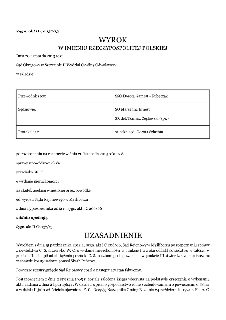 Sygn. akt II Ca 157/13 WYROK W IMIENIU RZECZYPOSPOLITEJ POLSKIEJ Dnia 20 listopada 2013 roku Sąd Okręgowy w Szczecinie II Wydział Cywilny Odwoławczy w składzie: Przewodniczący: SSO Dorota Gamrat - Kubeczak Sędziowie: SO Marzenna Ernest SR del. Tomasz Cegłowski (spr.) Protokolant: st. sekr. sąd. Dorota Szlachta po rozpoznaniu na rozprawie w dniu 20 listopada 2013 roku w S. sprawy z powództwa C. S. przeciwko W. C. o wydanie nieruchomości na skutek apelacji wniesionej przez powódkę od wyroku Sądu Rejonowego w Myśliborzu z dnia 15 października 2012 r., sygn. akt I C 206/06 oddala apelację. Sygn. akt II Ca 157/13 UZASADNIENIE Wyrokiem z dnia 15 października 2012 r., sygn. akt I C 206/06, Sąd Rejonowy w Myśliborzu po rozpoznaniu sprawy z powództwa C. S. przeciwko W. C. o wydanie nieruchomości w punkcie I wyroku oddalił powództwo w całości, w punkcie II odstąpił od obciążenia powódki C. S. kosztami postępowania, a w punkcie III stwierdził, że nieuiszczone w sprawie koszty sadowe ponosi Skarb Państwa. Powyższe rozstrzygnięcie Sąd Rejonowy oparł o następujący stan faktyczny. Postanowieniem z dnia 2 stycznia 1965 r. została założona księga wieczysta na podstawie orzeczenia o wykonaniu aktu nadania z dnia 2 lipca 1964 r. W dziale I wpisano gospodarstwo rolne z zabudowaniami o powierzchni 6,78 ha, a w dziale II jako właściciela ujawniono F. C.. Decyzją Naczelnika Gminy B. z dnia 24 października 1974 r. F. i A. C. przekazali gospodarstwo rolne o powierzchni 6,78 ha na własność Skarbu Państwa w zamian za rentę. Spod przyjęcia zostały wyłączone zabudowania, które miały stanowić odrębny od gruntu przedmiot własności. Postanowieniem z dnia 16 września 2005 r. Sąd Rejonowy w Myśliborzu ustalił, że w skład spadku po A. C. wchodzi udział w ½ współwłasności nieruchomości – domu mieszkalnego, stodoły, kurnika, stajni i pralni położonej w B., dla której Sąd Rejonowy w Myśliborzu prowadzi Kw (...). Dział spadku został dokonany w ten sposób, że udział w nieruchomości został przyznany na wyłączną własność powódce C. S.. Na powyższej podstawie w dniu 23 marca 2006 r. dokonano wpisu do księgi wieczystej i ujawniono powódkę C. S. jako właścicielkę odrębnych od gruntu nieruchomości w udziale do ½ części. Decyzją z dnia 10 lipca 2006 r. przeniesiono własność działki o numerze (...) o powierzchni 0, 3295 ha na rzecz F. C. w udziale do ½ oraz C. S. w udziale do ½. Postanowieniem z dnia 22 stycznia 2007 r. Sąd stwierdził, że spadek po F. C. na podstawie testamentu nabyła w całości C. S.. Na tej podstawie w dniu 30 lipca 2007 r. Sąd Rejonowy w Myśliborzu wpisał w księdze wieczystej Kw (...) C. S. jako właścicielkę działki nr (...) w całości. Postanowieniem dnia 30 grudnia 2010 r. Sąd Rejonowy w Myśliborzu oddalił wniosek Z. C. o zasiedzenie. Na skutek apelacji wniesionej przez Z. C. Sąd Okręgowy w Szczecinie postanowieniem z dnia 10 maja 2012 r. zmienił zaskarżone postanowienie w ten sposób, że stwierdził, iż Z. C. z dniem 7 marca 2008 r. nabyła przez zasiedzenie prawo własności nieruchomości budynkowej obejmującej dom mieszkalny, stodołę, kurnik, stajnię i pralnię położonej w B., dla której Sąd Rejonowy w Myśliborzu prowadzi Kw nr (...). Na tej podstawie do działu III KW (...) zostało ujawnione ostrzeżenie o niezgodności treści księgi wieczystej. F. C. umową z dnia 7 marca 1978 r. sprzedał W. C. dom mieszkalny, chlewnię, stodołę oraz działkę przyzagrodową o powierzchni 0,50 ha położoną w B.. Umowa została zawarta w zwykłej formie pisemnej. W piśmie z dnia 24 maja 2006 r. pozwany został wezwany do wydania nieruchomości w terminie jednego miesiąca od doręczenia wezwania. Pozwany nie zastosował się do wezwania zawartego w piśmie. Sąd Rejonowy, biorąc pod uwagę powyżej ustalony stan faktyczny, uznał powództwo za nieuzasadnione. Jako podstawę rozstrzygnięcia Sąd Rejonowy wskazał treść przepisu art. 222 § 1 k.c. Zgodnie z dyspozycją art. 222 § 1 k.c. właściciel może żądać od osoby, która faktycznie włada jego rzeczą, ażeby rzecz została mu wydana, chyba że osobie tej przysługuje skuteczne względem właściciela uprawnienie do władania rzeczą. Sąd I instancji wskazał, że legitymowanym do wystąpienia z roszczeniem windykacyjnym jest właściciel nieruchomości (rzeczy), spoczywa jednak na nim obowiązek udowodnienia, że przysługuje mu prawo własności. Sąd Rejonowy podniósł, że z przeprowadzonego postępowania dowodowego wynika, że faktycznie w księdze wieczystej Kw (...) jako właściciel całej nieruchomości ujawniona jest powódka C. S., jednak w dziale III Kw wpisane jest ostrzeżenie o niezgodności treści księgi wieczystej z rzeczywistym stanem prawnym. W powołaniu na art. 8 ustawy o księgach wieczystych i hipotece z dnia 6 lipca 1982 r. Sąd stwierdził, że rękojmię wiary publicznej ksiąg wieczystych wyłącza między innymi ostrzeżenie o niezgodności stanu prawnego ujawnionego w księdze wieczystej z rzeczywistym stanem prawnym. Na chwilę orzekania przez Sąd I instancji jej właścicielem jest Z. C. (zgodnie z orzeczeniem Sądu Okręgowego w Szczecinie z dnia 10 maja 2012 r.), a nie powódka. Pozwany w niniejszej sprawie W. C. zajmuje budynki nie jako samoistny posiadacz, a jako małżonek Z. C. – osoba, która ma uprawnienia do zamieszkiwania wspólnie z właścicielem nieruchomości, za jego zresztą wyraźną akceptacja. Sąd I instancji w konkluzji stwierdził, że skoro powódka nie jest właścicielem nieruchomości, nie ma legitymacji do wystąpienia z powództwem windykacyjnym z art. 222 § 1 k.c., co było przyczyną oddalenia powództwa w punkcie I wyroku. Jako podstawę rozstrzygnięcia o kosztach procesu w punkcie II wyroku Sąd wskazał art. 102 k.p.c., a jako podstawę orzeczenia o nieuiszczonych kosztach sądowych w punkcie III wyroku art. 113 ust. 1 ustawy o koszta