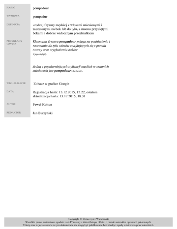 HASŁO pompadour WYMOWA pompadur DEFINICJA «rodzaj fryzury męskiej z włosami uniesionymi i zaczesanymi na bok lub do tyłu, z mocno przyciętymi bokami i dobrze widocznym przedziałkiem» PRZYKŁADY UŻYCIA Klasyczna fryzura pompadour polega na podniesieniu i zaczesaniu do tyłu włosów znajdujących się z przodu twarzy oraz wygładzeniu boków (jego-styl.pl). Jedną z popularniejszych stylizacji męskich w ostatnich miesiącach jest pompadour (she-he.pl). WIZUALIZACJE Zobacz w grafice Google DATA Rejestracja hasła: 13.12.2015, 15.22, ostatnia aktualizacja hasła: 13.12.2015, 18.31 AUTOR Paweł Kołtun REDAKTOR Jan Burzyński Copyright © Uniwersytet Warszawski Wszelkie prawa zastrzeżone zgodnie z art.17 ustawy z dnia 4 lutego 1994 r. o prawie autorskim i prawach pokrewnych. Teksty oraz zdjęcia zawarte w tym dokumencie nie mogą być publikowane bez wiedzy i zgody właściciela praw autorskich. Powered by TCPDF (www.tcpdf.org)