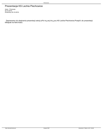Piechowice Prezentacja KS Lechia Piechowice Autor: Promocja 04.10.2010. Zmieniony 04.10.2010. Zapraszamy do obejrzenia prezentacji sekcji pi³ki no¿nej dru¿yny KS Lechia Piechowice.Przejd¼ do prezentacji klikaj±æ na herb klubu http://old.piechowice.pl Kreator PDF Utworzono 7 March, 2017, 00:46
