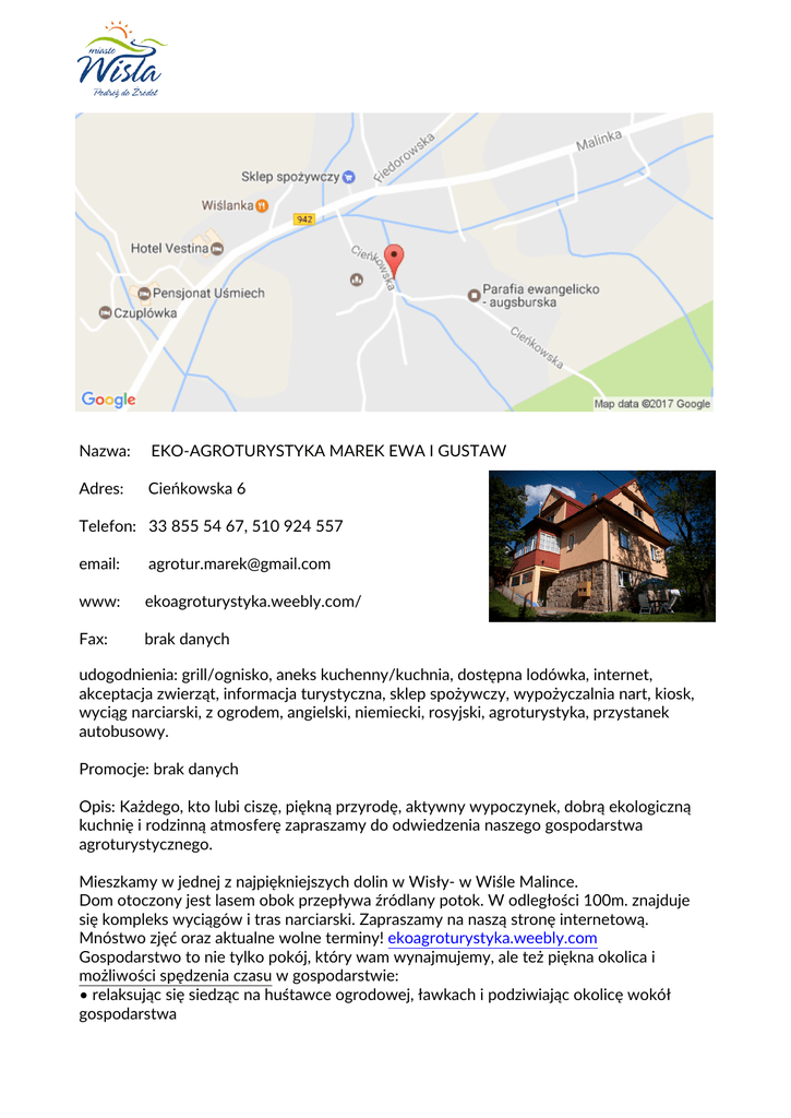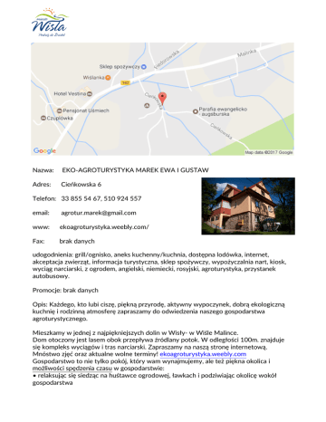 Nazwa: EKO-AGROTURYSTYKA MAREK EWA I GUSTAW Adres: Cieńkowska 6 Telefon: 33 855 54 67, 510 924 557 email: [email protected] www: ekoagroturystyka.weebly.com/ Fax: brak danych udogodnienia: grill/ognisko, aneks kuchenny/kuchnia, dostępna lodówka, internet, akceptacja zwierząt, informacja turystyczna, sklep spożywczy, wypożyczalnia nart, kiosk, wyciąg narciarski, z ogrodem, angielski, niemiecki, rosyjski, agroturystyka, przystanek autobusowy. Promocje: brak danych Opis: Każdego, kto lubi ciszę, piękną przyrodę, aktywny wypoczynek, dobrą ekologiczną kuchnię i rodzinną atmosferę zapraszamy do odwiedzenia naszego gospodarstwa agroturystycznego. Mieszkamy w jednej z najpiękniejszych dolin w Wisły- w Wiśle Malince. Dom otoczony jest lasem obok przepływa źródlany potok. W odległości 100m. znajduje się kompleks wyciągów i tras narciarski. Zapraszamy na naszą stronę internetową. Mnóstwo zjęć oraz aktualne wolne terminy! ekoagroturystyka.weebly.com Gospodarstwo to nie tylko pokój, który wam wynajmujemy, ale też piękna okolica i możliwości spędzenia czasu w gospodarstwie: • relaksując się siedząc na huśtawce ogrodowej, ławkach i podziwiając okolicę wokół gospodarstwa • grilując w altance • obserwując codzienne życie na gospodarstwie (duża atrakcja dla dzieci) W obiekcie mogą Państwo skorzystać również z profesjonalego masażu! Ponadto: • na terenie gospodarstwa są kury oraz bardzo przyjazne kotki i pies • parking Nie wiesz jak zaplanować czas wolny? Gospodarze doradzą, co wybrać, pomogą zaplanować, co zwiedzić, jak spędzić czas, udostępnią dostępne plany imprez w Wiśle, materiały promocyjne dotyczące Wisły i okolic Gospodarze oferują także: • tanią i szybką naukę jazdy na nartach z instruktorem (instruktor na miejscu tel., dla gości ceny promocyjne) • przewodnictwo górskie, wycieczki piesze, rowerowe i samochodowe po okolicy oraz do Czech i Słowacji • opiekę nad dziećmi Wyżywienie: • kuchnia domowa, regionalna i wegetariańska lub żywienie we własnym zakresie (dostęp do kuchni z pełnym wyposażeniem) • możliwość zakupu produktów rolnych • obiady lub obiadokolacje podawane na ustaloną przez gości porę Zapraszamy przez cały rok - święta, sylwester, ferie, majówka, wakacje, grzybobranie... • rezerwacja telefoniczna • doba hotelowa do uzgodnienia • dozwolony przyjazd ze zwierzętami (warunek: świadectwo szczepienia, kaganiec, smycz)
