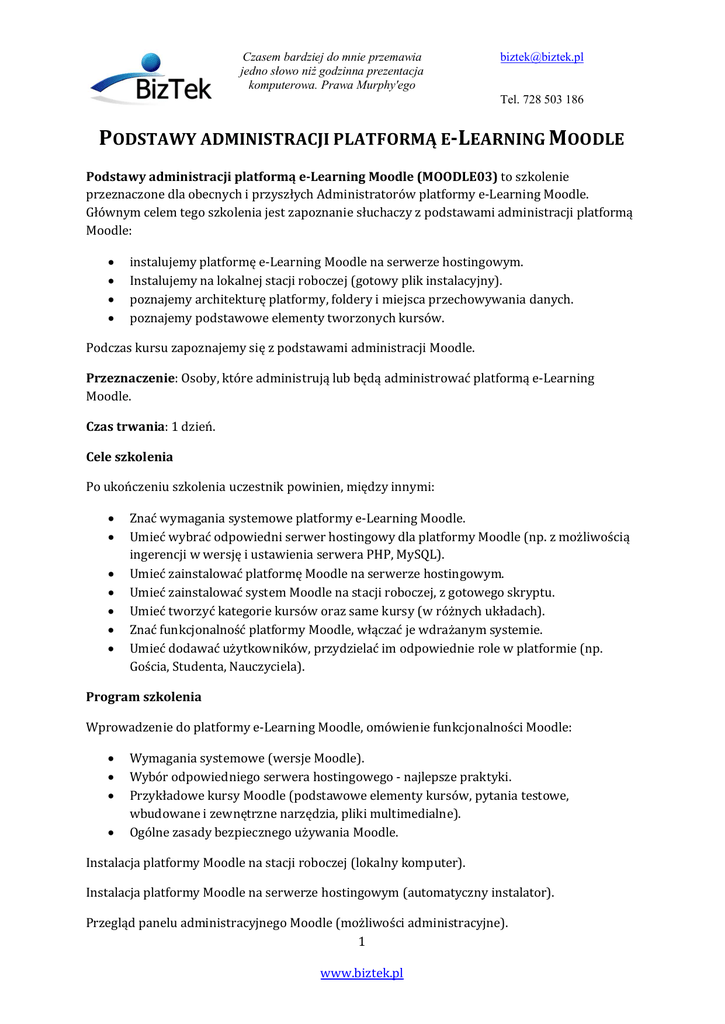 Czasem bardziej do mnie przemawia jedno s owo ni godzinna prezentacja komputerowa. Prawa Murphy'ego [email protected] Tel. 728 503 186 PODSTAWY ADMINISTRACJI PLATFORM E-LEARNING MOODLE Podstawy administracji platform e-Learning Moodle (MOODLE03) to szkolenie przeznaczone dla obecnych przysz ych Administratorów platformy e-Learning Moodle. ównym celem tego szkolenia jest zapoznanie uchaczy podstawami administracji platform Moodle: instalujemy platform e-Learning Moodle na serwerze hostingowym. Instalujemy na lokalnej stacji roboczej (gotowy plik instalacyjny). poznajemy architektur platformy, foldery miejsca przechowywania danych. poznajemy podstawowe elementy tworzonych kursów. Podczas kursu zapoznajemy si podstawami administracji Moodle. Przeznaczenie Osoby, które administruj lub Moodle. Czas trwania administrowa platform e-Learning dzie Cele szkolenia Po uko czeniu szkolenia uczestnik powinien, mi dzy innymi: Zna wymagania systemowe platformy e-Learning Moodle. Umie wybra odpowiedni serwer hostingowy dla platformy Moodle (np. mo liwo ci ingerencji wersj ustawienia serwera PHP, MySQL). Umie zainstalowa platform Moodle na serwerze hostingowym. Umie zainstalowa system Moodle na stacji roboczej, gotowego skryptu. Umie tworzy kategorie kursów oraz same kursy (w ró nych uk adach). Zna funkcjonalno platformy Moodle, cza je wdra anym systemie. Umie dodawa ytkowników, przydziela im odpowiednie role platformie (np. Go cia, Studenta, Nauczyciela). Program szkolenia Wprowadzenie do platformy e-Learning Moodle, omówienie funkcjonalno ci Moodle: Wymagania systemowe (wersje Moodle). Wybór odpowiedniego serwera hostingowego najlepsze praktyki. Przyk adowe kursy Moodle (podstawowe elementy kursów, pytania testowe, wbudowane zewn trzne narz dzia, pliki multimedialne). Ogólne zasady bezpiecznego ywania Moodle. Instalacja platformy Moodle na stacji roboczej (lokalny komputer). Instalacja platformy Moodle na serwerze hostingowym (automatyczny instalator). Przegl panelu administracyjnego Moodle (mo liwo ci administracyjne). www.biztek.pl Czasem bardziej do mnie przemawia jedno s owo ni godzinna prezentacja komputerowa. Prawa Murphy'ego [email protected] Tel. 728 503 186 Zarz dzanie kursami Moodle, mi dzy innymi: Tworzenie nowych kategorii kursów. Tworzenie nowego kursu Moodle. Przenoszenie kursów pomi dzy kategoriami. Tworzenie kopii zapasowej kursu Moodle. Odtwarzanie kursu Moodle kopii bezpiecze stwa. Zarz dzanie ytkownikami platformy Moodle: Role ytkowników systemu Moodle (np. Go Student, Nauczyciel), porównanie ról ytkowników. Rejestracja nowych ytkowników systemie. Przydzielanie ról zarejestrowanym osobom systemie. Zarz dzanie zawarto ci kursów Moodle: Przegl elementów kursów Moodle (strona, ksi ka, folder, itd.). Tworzenie przyk adowej zawarto ci kursu Moodle (krótki kurs testem Moodle). Przenoszenie zawarto ci kursu do innego elementu. Zmiana wygl du platformy Moodle: Zmiana strony startowej Moodle. Wybór szablonu Moodle (na podstawie standardowych szablonów). Materia szkoleniowe uchacze otrzymuj materia szkoleniowe zyku polskim. www.biztek.pl silniku