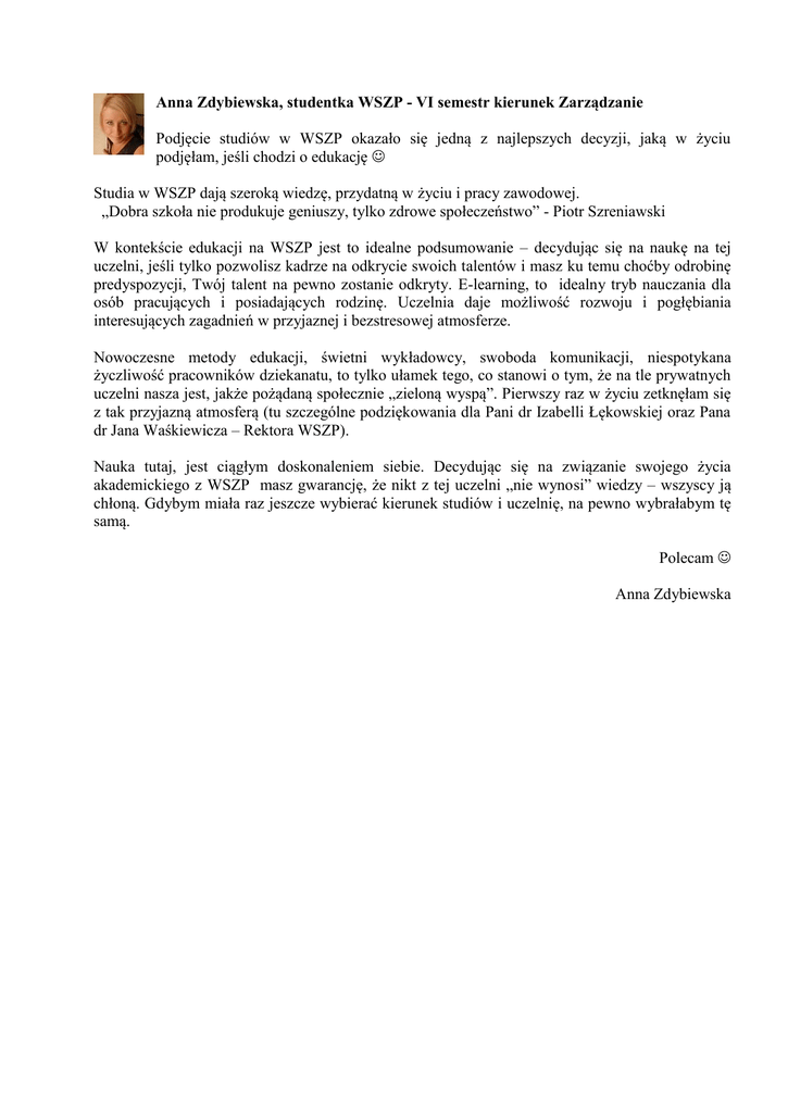 Anna Zdybiewska, studentka WSZP - VI semestr kierunek Zarządzanie Podjęcie studiów w WSZP okazało się jedną z najlepszych decyzji, jaką w życiu podjęłam, jeśli chodzi o edukację Studia w WSZP dają szeroką wiedzę, przydatną w życiu i pracy zawodowej. „Dobra szkoła nie produkuje geniuszy, tylko zdrowe społeczeństwo” - Piotr Szreniawski W kontekście edukacji na WSZP jest to idealne podsumowanie – decydując się na naukę na tej uczelni, jeśli tylko pozwolisz kadrze na odkrycie swoich talentów i masz ku temu choćby odrobinę predyspozycji, Twój talent na pewno zostanie odkryty. E-learning, to idealny tryb nauczania dla osób pracujących i posiadających rodzinę. Uczelnia daje możliwość rozwoju i pogłębiania interesujących zagadnień w przyjaznej i bezstresowej atmosferze. Nowoczesne metody edukacji, świetni wykładowcy, swoboda komunikacji, niespotykana życzliwość pracowników dziekanatu, to tylko ułamek tego, co stanowi o tym, że na tle prywatnych uczelni nasza jest, jakże pożądaną społecznie „zieloną wyspą”. Pierwszy raz w życiu zetknęłam się z tak przyjazną atmosferą (tu szczególne podziękowania dla Pani dr Izabelli Łękowskiej oraz Pana dr Jana Waśkiewicza – Rektora WSZP). Nauka tutaj, jest ciągłym doskonaleniem siebie. Decydując się na związanie swojego życia akademickiego z WSZP masz gwarancję, że nikt z tej uczelni „nie wynosi” wiedzy – wszyscy ją chłoną. Gdybym miała raz jeszcze wybierać kierunek studiów i uczelnię, na pewno wybrałabym tę samą. Polecam Anna Zdybiewska
