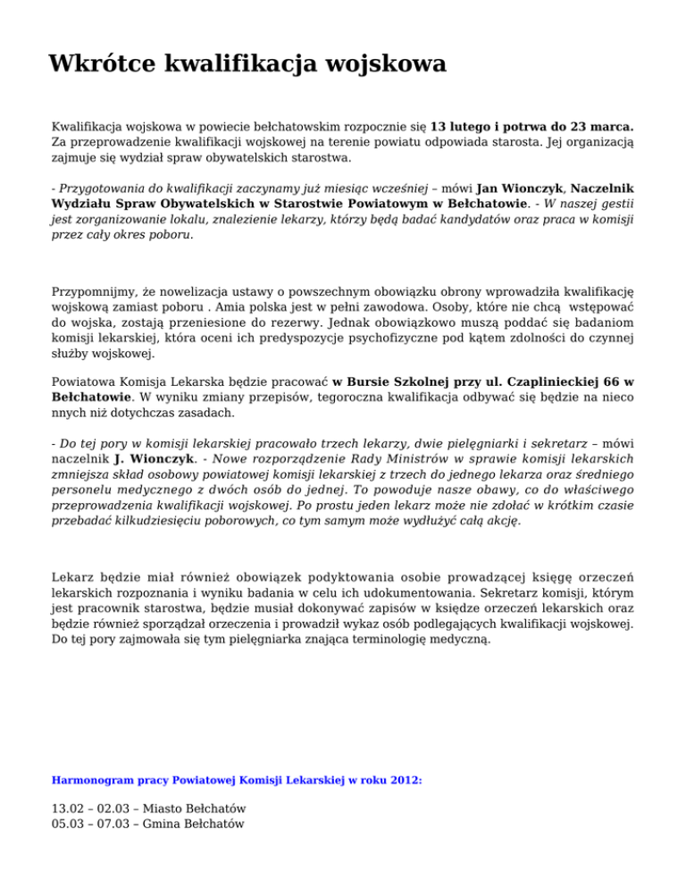 Wkrótce kwalifikacja wojskowa Kwalifikacja wojskowa w powiecie bełchatowskim rozpocznie się 13 lutego i potrwa do 23 marca. Za przeprowadzenie kwalifikacji wojskowej na terenie powiatu odpowiada starosta. Jej organizacją zajmuje się wydział spraw obywatelskich starostwa. - Przygotowania do kwalifikacji zaczynamy już miesiąc wcześniej – mówi Jan Wionczyk, Naczelnik Wydziału Spraw Obywatelskich w Starostwie Powiatowym w Bełchatowie. - W naszej gestii jest zorganizowanie lokalu, znalezienie lekarzy, którzy będą badać kandydatów oraz praca w komisji przez cały okres poboru. Przypomnijmy, że nowelizacja ustawy o powszechnym obowiązku obrony wprowadziła kwalifikację wojskową zamiast poboru . Amia polska jest w pełni zawodowa. Osoby, które nie chcą wstępować do wojska, zostają przeniesione do rezerwy. Jednak obowiązkowo muszą poddać się badaniom komisji lekarskiej, która oceni ich predyspozycje psychofizyczne pod kątem zdolności do czynnej służby wojskowej. Powiatowa Komisja Lekarska będzie pracować w Bursie Szkolnej przy ul. Czaplinieckiej 66 w Bełchatowie. W wyniku zmiany przepisów, tegoroczna kwalifikacja odbywać się będzie na nieco nnych niż dotychczas zasadach. - Do tej pory w komisji lekarskiej pracowało trzech lekarzy, dwie pielęgniarki i sekretarz – mówi naczelnik J. Wionczyk. - Nowe rozporządzenie Rady Ministrów w sprawie komisji lekarskich zmniejsza skład osobowy powiatowej komisji lekarskiej z trzech do jednego lekarza oraz średniego personelu medycznego z dwóch osób do jednej. To powoduje nasze obawy, co do właściwego przeprowadzenia kwalifikacji wojskowej. Po prostu jeden lekarz może nie zdołać w krótkim czasie przebadać kilkudziesięciu poborowych, co tym samym może wydłużyć całą akcję. Lekarz będzie miał również obowiązek podyktowania osobie prowadzącej księgę orzeczeń lekarskich rozpoznania i wyniku badania w celu ich udokumentowania. Sekretarz komisji, którym jest pracownik starostwa, będzie musiał dokonywać zapisów w księdze orzeczeń lekarskich oraz będzie również sporządzał orzeczenia i prowadził wykaz osób podlegających kwalifikacji wojskowej. Do tej pory zajmowała się tym pielęgniarka znająca terminologię medyczną. Harmonogram pracy Powiatowej Komisji Lekarskiej w roku 2012: 13.02 – 02.03 – Miasto Bełchatów 05.03 – 07.03 – Gmina Bełchatów 08.03 – 12.03 – Gmina Zelów 13.03 – Gmina Drużbice 14.03 – Gmina Kleszczów 15.03 – Gmina Kluki 15.03 – 16.03– Gmina Rusiec 19.03 – 20.03 – Gmina Szczerców Dzień 21 marca jest przeznaczony dla kobiet, które kończą naukę w szkołach medycznych i weterynaryjnych lub na kierunkach psychologicznych. Łączna liczba osób podlegających w tym roku kwalifikacji wojskowej w powiecie bełchatowskim to niespełna 1000. Krzysztof Borowski, Rzecznik prasowy Starostwa Powiatowego w Bełchatowie