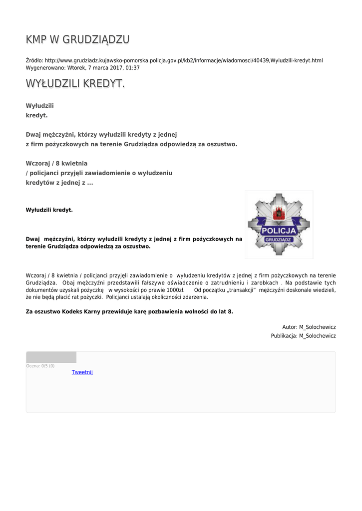 KMP W GRUDZIĄDZU Źródło: http://www.grudziadz.kujawsko-pomorska.policja.gov.pl/kb2/informacje/wiadomosci/40439,Wyludzili-kredyt.html Wygenerowano: Wtorek, 7 marca 2017, 01:37 WYŁUDZILI KREDYT. Wyłudzili kredyt. Dwaj mężczyźni, którzy wyłudzili kredyty z jednej z firm pożyczkowych na terenie Grudziądza odpowiedzą za oszustwo. Wczoraj / 8 kwietnia / policjanci przyjęli zawiadomienie o wyłudzeniu kredytów z jednej z ... Wyłudzili kredyt. Dwaj mężczyźni, którzy wyłudzili kredyty z jednej z firm pożyczkowych na terenie Grudziądza odpowiedzą za oszustwo. Wczoraj / 8 kwietnia / policjanci przyjęli zawiadomienie o wyłudzeniu kredytów z jednej z firm pożyczkowych na terenie Grudziądza. Obaj mężczyźni przedstawili fałszywe oświadczenie o zatrudnieniu i zarobkach . Na podstawie tych dokumentów uzyskali pożyczkę w wysokości po prawie 1000zł. Od początku „transakcji” mężczyźni doskonale wiedzieli, że nie będą płacić rat pożyczki. Policjanci ustalają okoliczności zdarzenia. Za oszustwo Kodeks Karny przewiduje karę pozbawienia wolności do lat 8. Autor: M_Solochewicz Publikacja: M_Solochewicz Ocena: 0/5 (0) Tweetnij