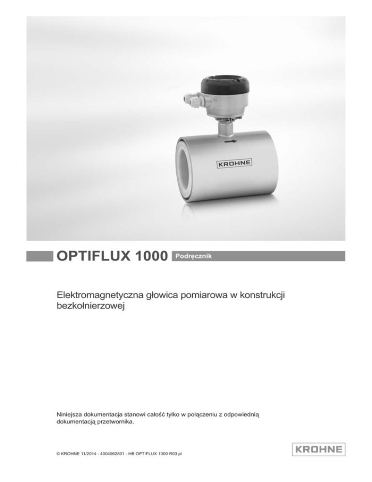 OPTIFLUX 1000 Podręcznik Elektromagnetyczna głowica pomiarowa w konstrukcji bezkołnierzowej Niniejsza dokumentacja stanowi całość tylko w połączeniu z odpowiednią dokumentacją przetwornika. © KROHNE 11/2014 - 4004062801 - HB OPTIFLUX 1000 R03 pl : Adnotacja wydawcy ::::::::::::::::::::::::::::::::::: Wszystkie prawa zastrzeżone. Zabrania się powielania tej dokumentacji lub jakiejkolwiek jej części bez pisemnego upoważnienia KROHNE Messtechnik GmbH. Podlega zmianom bez uprzedniego powiadomienia. Prawa autorskie 2014 przez KROHNE Messtechnik GmbH - Ludwig-Krohne-Str. 5 - 47058 Duisburg (Niemcy) 2 www.krohne.com 11/2014 - 4004062801 - HB OPTIFLUX 1000 R03 pl Spis treści OPTIFLUX 1000 1 Instrukcje bezpieczeństwa 5 1.1 Zamierzone użycie........................................................................................................5 1.2 Certyfikacja ...................................................................................................................5 1.3 Instrukcje bezpieczeństwa producenta .........................................................................6 1.3.1 1.3.2 1.3.3 1.3.4 1.3.5 Prawo autorskie i ochrona danych...................................................................................... 6 Zrzeczenie się..................................................................................................................... 6 Odpowiedzialność i gwarancja produktu ............................................................................ 7 Informacja dotycząca dokumentacji.................................................................................... 7 Ostrzeżenia i użyte symbole............................................................................................... 8 1.4 Instrukcje bezpieczeństwa dla operatora......................................................................8 2 Opis urządzenia 9 2.1 Zakres dostawy.............................................................................................................9 2.2 Opis urządzenia ..........................................................................................................10 2.3 Tabliczka znamionowa................................................................................................11 3 Instalacja 3.1 3.2 3.3 3.4 3.5 12 Uwagi instalacyjne ......................................................................................................12 Magazynowanie ..........................................................................................................12 Transport.....................................................................................................................12 Wstępne wymagania instalacyjne...............................................................................13 Wymagania ogólne .....................................................................................................13 3.5.1 Wibracje............................................................................................................................ 13 3.5.2 Pole magnetyczne ............................................................................................................ 13 3.6 Warunki instalacyjne ...................................................................................................14 3.6.1 Odcinek dolotowy i wylotowy ............................................................................................ 14 3.6.2 Zgięcia 2- lub 3-wymiarowe .............................................................................................. 14 3.6.3 Sekcja T............................................................................................................................ 14 3.6.4 Zagięcia ............................................................................................................................ 15 3.6.5 Wylot swobodny................................................................................................................ 15 3.6.6 Odchyłka kołnierzy............................................................................................................ 16 3.6.7 Pompa .............................................................................................................................. 16 3.6.8 Zawór regulacyjny............................................................................................................. 16 3.6.9 Odpowietrzenie oraz podciśnienie.................................................................................... 17 3.6.10 Pozycja montażowa........................................................................................................ 17 3.7 Montaż ........................................................................................................................18 3.7.1 Momenty dociskowe i ciśnienia ........................................................................................ 18 4 Przyłącza elektryczne 4.1 4.2 4.3 4.4 5 20 Instrukcje bezpieczeństwa ..........................................................................................20 Uziemienie ..................................................................................................................20 Wirtualna referencja....................................................................................................21 Schematy podłączeń...................................................................................................21 Serwis 11/2014 - 4004062801 - HB OPTIFLUX 1000 R03 pl 22 www.krohne.com 3 Spis treści OPTIFLUX 1000 5.1 Dostępność części zapasowych .................................................................................22 5.2 Dostępność usług .......................................................................................................22 5.3 Zwrot urządzenia do producenta ................................................................................22 5.3.1 Ogólne informa