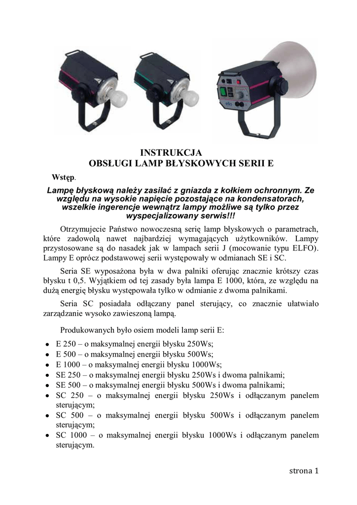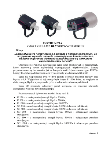 INSTRUKCJA OBSŁUGI LAMP BŁYSKOWYCH SERII E Wstęp. Lampę błyskową należy zasilać z gniazda z kołkiem ochronnym. Ze względu na wysokie napięcie pozostające na kondensatorach, wszelkie ingerencje wewnątrz lampy możliwe są tylko przez wyspecjalizowany serwis!!! Otrzymujecie Państwo nowoczesną serię lamp błyskowych o parametrach, które zadowolą nawet najbardziej wymagających użytkowników. Lampy przystosowane są do nasadek jak w lampach serii J (mocowanie typu ELFO). Lampy E oprócz podstawowej serii występowały w odmianach SE i SC. Seria SE wyposażona była w dwa palniki oferując znacznie krótszy czas błysku t 0,5. Wyjątkiem od tej zasady była lampa E 1000, która, ze względu na dużą energię błysku występowała tylko w odmianie z dwoma palnikami. Seria SC posiadała odłączany panel sterujący, co znacznie ułatwiało zarządzanie wysoko zawieszoną lampą. Produkowanych było osiem modeli lamp serii E: E 250 – o maksymalnej energii błysku 250Ws; E 500 – o maksymalnej energii błysku 500Ws; E 1000 – o maksymalnej energii błysku 1000Ws; SE 250 – o maksymalnej energii błysku 250Ws i dwoma palnikami; SE 500 – o maksymalnej energii błysku 500Ws i dwoma palnikami; SC 250 – o maksymalnej energii błysku 250Ws i odłączanym panelem sterującym; SC 500 – o maksymalnej energii błysku 500Ws i odłączanym panelem sterującym; SC 1000 – o maksymalnej energii błysku 1000Ws i odłączanym panelem sterującym. strona 1 Oznaczenia na płycie czołowej: 1) 2) 3) 4) 5) 6) 7) 8) 9) 10) 11) 12) Wyłącznik główny lampy błyskowej. Przełącznik ustawienia energii błysku lampy. Załączanie żarówki pilotującej. Wybór rodzaju pracy żarówki pilotującej: w pozycji wyłączonej żarówka świeci proporcjonalnie do energii błysku oraz sygnalizuje gotowość lampy do kolejnego błysku (gaśnie po każdym błysku); w pozycji włączonej żarówka świeci pełną mocą niezależnie od ustawionej energii błysku i nie gaśnie po nim. Fotocela służy do synchronizacji błysku z innymi lampami. Gniazdo przewodu synchronizacji. Wyłącznik fotoceli. W pozycji „0” lampę można wyzwolić z przewodu synchro lub przyciskiem TEST. Przycisk TEST pozwala na ręczne wyzwolenie lampy błyskowej. Kontrolka READY sygnalizuje gotowość lampy do błysku. Wskaźnik diodowy ustawienia energii błysku. Bezpiecznik lampy błyskowej 6,3A. Gniazdo zasilające lampę. Uwagi: 1) Przy zmniejszaniu energii błysku zawsze gaśnie kontrolka READY oraz żarówka pilotująca (tylko, gdy wyłącznik pilota znajduje się w pozycji "proporcjonalny”). Stan ten trwa, aż do ustalenia się właściwych parametrów strona 2 błysku. Jeżeli chcemy przyspieszyć proces, to po przestawieniu pokrętła energii należy przyciskiem TEST wyzwolić lampę. Po ponownym naładowaniu się lampy, ma ona w sposób natychmiastowy ustalone nowe parametry błysku. 2) Przy zwiększaniu nastaw energii lampy nie musimy wyzwalać. 3) Każda gotowość lampy po wykonaniu błysku sygnalizowana jest przez krótki sygnał dźwiękowy. 4) W lampie zastosowano dodatkowo wyłącznik termiczny, który zabezpiecza obwody wewnętrzne lampy przed przegrzaniem. Lampa wyłącza się na około 20 minut (żadna z diod nie świeci się), po czym następuje samoczynne załączenie. W związku z tym zaleca się stosowanie żarówek pilotujących o mniejszej mocy. W sytuacji, gdy położenie pracy lampy powoduje jej wyłączanie się (np. gdy lampa świeci pionowo w dół lub gdy założymy tubus). Lampy serii SC dysponują dokładnie tymi samymi funkcjami co lampy E. Jedyną różnicą jest oddzielony panel sterujący od części energetycznej lampy. Panel połączony jest 10 metrowym przewodem z lampą i jest z niej zasilany. Wyposażony jest w specjalny klips, umożliwiający zamocowanie np. na rurce statywu. Istnieje jeden rodzaj panelu (oznaczony symbolem SC123), który pasuje do wszystkich lamp serii SC. Wszelkie uwagi i spostrzeżenia dotyczące produkowanego sprzętu prosimy kierować na adres producenta. ELFO® Jan Tulikowski ul. Zgierska 231d 91-495 Łódź tel: +48 42 658 26 01 +48 42 658 83 44 fax: +48 42 658 81 56 e-mail: [email protected] www.elfo.com.pl www.elfo.pl strona 3 Dane techniczne Energia błysku maksymalna Lampa wyładowcza Temperatura barwowa Wartość przesłony (100 ISO, 1m, czasza 60°) Czas ładowania Czas błysku t 0,5 Stabilizacja energii błysku Sposób regulacji energii Zakres regulacji energii Typ żarówki modelującej Tryb pracy żarówki modelującej E 250 E 500 SE 250 SE 500 E 1000 250 Ws 500 Ws 250 Ws 500 Ws 1000 Ws 5400 K ± 200 K 22 32 1,8 s 1/800 s 2,2 s 1/550 s 32 45 Wyłączony, proporcja, pełna moc Gniazdo synchro Jack 6,3mm, fotocela, podczerwień, przycisk TEST 15V DC 170 - 240V 50Hz 2 x 4A 2 x 6,3A Napięcie wyzwalania Napięcie zasilania Zabezpieczenie główne Zabezpieczenie przed przegrzaniem Tak 12,7 × 14,5 × 24,5 cm Wymiary 3,2 kg 3,7 kg Dane techniczne SC 250 Parametry Analogicznie jak E250 Wymiary panelu sterującego Masa panelu sterującego Wymiary lampy Masa lampy 22 1,8 s 2,2 s 2,4 s 1/1400 s 1/1200 s 1/1000 s ± 1% 1/16 - 1/1 co 0,5f 4f Nominalnie żarówka 100W 220 V E27 (max 250W) Sposób wyzwalania Masa podwójna pojedyncza 3,2 kg SC 500 3,7 kg 12,7 × 14,5 × 32 cm 4,2 kg SC 1000 Analogicznie Analogicznie jak jak E500 E1000 13,5 × 14,5 × 5,0 cm 0,4 kg 12,7 × 14,5 × 24,5 cm 12,7 × 14,5 × 32 cm 2,3 kg 2,8 kg 3,3 kg strona 4