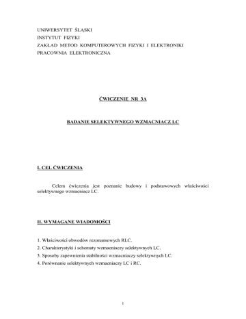 UNIWERSYTET ŚLĄSKI INSTYTUT FIZYKI ZAKŁAD METOD KOMPUTEROWYCH FIZYKI I ELEKTRONIKI PRACOWNIA ELEKTRONICZNA ĆWICZENIE NR 3A BADANIE SELEKTYWNEGO WZMACNIACZ LC I. CEL ĆWICZENIA Celem ćwiczenia jest poznanie budowy i podstawowych właściwości selektywnego wzmacniacz LC. II. WYMAGANE WIADOMOŚCI 1. Właściwości obwodów rezonansowych RLC. 2. Charakterystyki i schematy wzmacniaczy selektywnych LC. 3. Sposoby zapewnienia stabilności wzmacniaczy selektywnych LC. 4. Porównanie selektywnych wzmacniaczy LC i RC. 1 III. PRZEBIEG ĆWICZENIA 1.POMIAR CHARAKTERYSTYKI UWY = F(f) 1.1 Włączyć wzmacniacz. Na wejście wzmacniacza w układzie RZ = podawać sygnał z przekraczającym generatora 100mV. sinusoidalnego Zmieniając o napięciu częstotliwość nie napięcia wejściowego w przedziale od 100Hz do 1MHz (w skali logarytmicznej) mierzyć napięcie wyjściowe wzmacniacza. Z uzyskanych pomiarów określić zakres częstotliwości, w którym należy pomiary zagęścić. 1.2 Dla wyznaczonego zakresu częstotliwości wykonać pomiary następującymi wartościami rezystancji dołączonych do z obwodu rezonansowego (generator przestrajać o nie więcej jak o 3 kHz): a) RZ = b) RZ = 200k c RZ = 100k d) RZ = 51k ***2. POMIAR CHARAKTERYSTYKI UWY = F(UWE) Odłączyć rezystancję tłumiącą obwód rezonansowy Na wejście wzmacniacza podawać sygnał z generatora sinusoidalnego o częstotliwości rezonansowej f=f0. Na wyjście wzmacniacza podłączyć oscyloskop i woltomierz napięcia zmiennego. Mierzyć napięcie wyjściowe zmieniając napięcie wejściowe od 5mV do wartości, przy której wystąpią zniekształcenia napięcia oscyloskopie. *** Dotyczy sekcji - trzy godziny pracowni. 2 wyjściowego zaobserwowane na ***3. POMIAR NAPIĘĆ STAŁYCH Woltomierzem napięcia stałego (przełączyć AC/DC) pomierzyć potencjały względem masy charakterystycznych punktów badanego układu. Pomiary wykonać dla dwóch przypadków: 1. brak sygnału sterującego na wejściu wzmacniacza: 2. na wejście wzmacniacza podawany jest sygnał sterujący o wartości 50mV i częstotliwości f=f0. IV. OPRACOWANIE WYNIKÓW 1. Omówić działanie i własności badanego układu. Wyjaśnić cel stosowania wzmacniacza kaskodowego. 2. Wykreślić zależności wzmocnienia od częstotliwości na jednym wykresie. 3. Wykreślić zależność napięcia wyjściowego od napięcia wejściowego. 4. Wyliczyć indukcyjność cewki obwodu rezonansowego. 5. Określić z wykresu szerokość pasma przenoszenia wzmacniacza dla przypadków: a) RZ = b) RZ = 200k c RZ = 100k d) RZ = 51k a następnie wyliczyć odpowiednie dobroci wzmacniacza. Wyniki te traktować jako uzyskane z pomiarów. Następnie biorąc dobroć wzmacniacza dla przypadku RZ= jako daną wyjściową wyliczyć na drodze rachunkowej dobroci wzmacniacza dla pozostałych wartości RZ. Porównać te wyniki z poprzednio uzyskanymi na drodze pomiarowej. 6. Z charakterystyki UWY = f(UWE) określić użyteczny zakres napięć wejściowych. V. LITERATURA 1. A. Filpkowski, ”Ukady elektroniczne analogowe i cyfrowe” EIT 2005r. 2. J. Kalisz, ”Podstawy elektroniki cyfrowej” WKŁ 2002r 3. P. Horowitz, W Hill, ”Sztuka elektroniki” WKŁ 2002r. 3 4. M. Pióro, ”Podstawy elektroniki” WSiP 2005r. 5. A. Chwaleba, ”Pracownia elektroniczna” WSiP 2002r. 6. T. Zagajewski, ”Układy elektroniki przemysłowej” WNT, W-wa 75. 7. A. Guziński, ”Liniowe elektroniczne układy analogowe” WNT W-wa 1992/93 INDUCTOR1 360pF 51k 100k 200k we wy 4