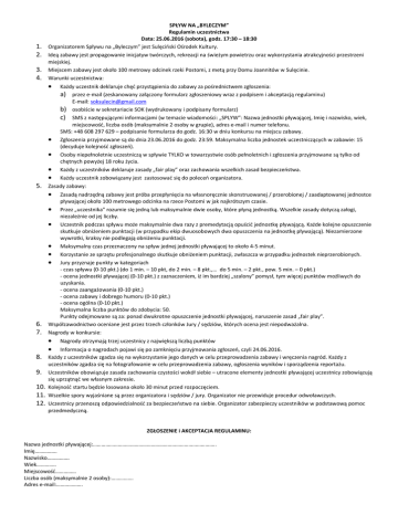 3. 4. SPŁYW NA „BYLECZYM” Regulamin uczestnictwa Data: 25.06.2016 (sobota), godz. 17:30 – 18:30 Organizatorem Spływu na „Byleczym” jest Sulęciński Ośrodek Kultury. Ideą zabawy jest propagowanie inicjatyw twórczych, rekreacji na świeżym powietrzu oraz wykorzystania atrakcyjności przestrzeni miejskiej. Miejscem zabawy jest około 100 metrowy odcinek rzeki Postomi, z metą przy Domu Joannitów w Sulęcinie. Warunki uczestnictwa: 5. Każdy uczestnik deklaruje chęć przystąpienia do zabawy za pośrednictwem zgłoszenia: a) przez e-mail (zeskanowany załączony formularz zgłoszeniowy wraz z podpisem i akceptacją regulaminu) E-mail: [email protected] b) osobiście w sekretariacie SOK (wydrukowany i podpisany formularz) c) SMS z następującymi informacjami (w temacie wiadomości: „SPLYW”: Nazwa jednostki pływającej, Imię i nazwisko, wiek, miejscowość, liczba osób (maksymalnie 2 osoby w grupie), adres e-mail i numer telefonu. SMS: +48 608 297 629 – podpisanie formularza do godz. 16:30 w dniu konkursu na miejscu zabawy. Zgłoszenia przyjmowane są do dnia 23.06.2016 do godz. 23:59. Maksymalna liczba jednostek uczestniczących w zabawie: 15 (decyduje kolejność zgłoszeń). Osoby niepełnoletnie uczestniczą w spływie TYLKO w towarzystwie osób pełnoletnich i zgłoszenia przyjmowane są tylko od chętnych powyżej 18 roku życia. Każdy z uczestników deklaruje zasady „fair play” oraz zachowania wszelkich zasad bezpieczeństwa. Każdy uczestnik zobowiązany jest zastosować się do poleceń organizatora. Zasady zabawy: 6. 7. Zasadą nadrzędną zabawy jest próba przepłynięcia na własnoręcznie skonstruowanej / przerobionej / zaadaptowanej jednostce pływającej około 100 metrowego odcinka na rzece Postomi w jak najkrótszym czasie. Przez „uczestnika” rozumie się jedną lub maksymalnie dwie osoby, które płyną jednostką. Wszelkie zasady dotyczą załogi, niezależnie od jej liczby. Uczestnik podczas spływu może maksymalnie dwa razy z premedytacją opuścić jednostkę pływającą. Każde kolejne opuszczenie skutkuje obniżeniem punktacji (w przypadku ekip dwuosobowych dwa opuszczenia na jednostkę pływającą). Niezamierzone wywrotki, kraksy nie podlegają obniżeniu punktacji. Maksymalny czas przeznaczony na spływ jednej jednostki pływającej to około 4-5 minut. Korzystanie ze sprzętu profesjonalnego skutkuje obniżeniem punktacji, zwłaszcza w przypadku jednostek nieprzerobionych. Jury przyznaje punkty w kategoriach - czas spływu (0-10 pkt.) (do 1 min. – 10 pkt, do 2 min. – 8 pkt.,… do 5 min. – 2 pkt., pow. 5 min. – 0 pkt.) - ocena jednostki pływającej (0-10 pkt.) z zaznaczeniem, iż im bardziej „szalony” pomysł, tym więcej punktów możliwych do uzyskania. - ocena zaangażowania (0-10 pkt.) - ocena zabawy i dobrego humoru (0-10 pkt.) - ocena ogólna (0-10 pkt.) Maksymalna liczba punktów do zdobycia: 50. Punkty odejmowane są za: ponad dwukrotne opuszczenie jednostki pływającej, naruszenie zasad „fair play”. Współzawodnictwo oceniane jest przez trzech członków Jury / sędziów, których ocena jest niepodważalna. Nagrody w konkursie: 1. 2. 8. 9. 10. 11. 12. Nagrody otrzymają trzej uczestnicy z największą liczbą punktów Informacja o nagrodach pojawi się po zamknięciu przyjmowania zgłoszeń, czyli 24.06.2016. Każdy z uczestników zgadza się na wykorzystanie jego danych w celu przeprowadzenia zabawy i wręczenia nagród. Każdy z uczestników zgadza się na fotografowanie w celu przeprowadzenia zabawy, ogłoszenia wyników i sporządzenia reportażu. Uczestników obowiązuje zasada zachowania czystości wokół siebie – utracone elementy jednostki pływającej uczestnicy zobowiązują się uprzątnąć we własnym zakresie. Kolejność startu będzie losowana około 30 minut przed rozpoczęciem. Wszelkie spory wyjaśniane są przez organizatora i sędziów / jury. Organizator nie przewiduje procedur odwoławczych. Uczestnicy przenoszą odpowiedzialność za bezpieczeństwo na siebie. Organizator zabezpieczy uczestników w podstawową pomoc przedmedyczną. ZGŁOSZENIE i AKCEPTACJA REGULAMINU: Nazwa jednostki pływającej:…………………………………………………………………………….. Imię……………. Nazwisko……………. Wiek………….. Miejscowość…………… Liczba osób (maksymalnie 2 osoby):……………. Adres e-mail:………………. Numer telefonu:……………………….. Akceptuję regulamin oraz oświadczam prawdziwość danych w zgłoszeniu, Data: ………………………………Podpis…………………………………………………………………………… (data i czytelny podpis)