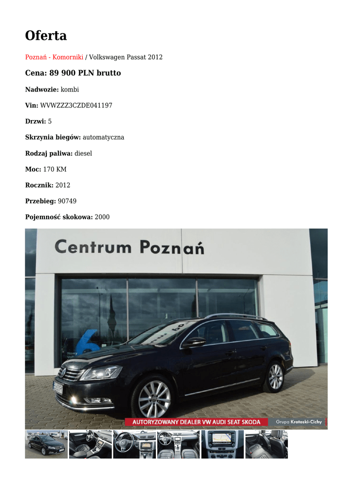 Oferta Poznań - Komorniki / Volkswagen Passat 2012 Cena: 89 900 PLN brutto Nadwozie: kombi Vin: WVWZZZ3CZDE041197 Drzwi: 5 Skrzynia biegów: automatyczna Rodzaj paliwa: diesel Moc: 170 KM Rocznik: 2012 Przebieg: 90749 Pojemność skokowa: 2000 Wyposażenie: abs, kontroli trakcji (asr), regulacja wysokosci fotela, dzielona tyłna kanapa, kierownica wielofunkcyjna, autoalarm, immobiliser, centralny zamek, elektryczne szyby przednie, elektryczne szyby tyłne, elektryczne lusterka, światła przeciwmgielne, czujniki parkowania - tył, czujniki deszczu, komputer pokładowy, nawigacja satelitarna, podgrzewane fotele, regulowana kierownica, szyberdach, tempomat, wspomaganie kierownicy, felgi aluminiowe, przyciemniane szyby, relingi, podgrzewana przednia szyba, eds, blokada dyferencjalu, uchwyt isofix, system start-stop, dach szklany - panoramiczny, automat. hamulec postojowy, bluetooth, blokada drzwi podczas jazdy, automatyczne światła, elektrochromatyczne lusterko wsteczne, podgrzewane lusterka boczne, stabilizacja toru jazdy (esp), poduszki pow. kurtynowe - przód, poduszka pow. pasażera, poduszka pow. kierowcy, reflektory biksenony, czujniki parkowania - przód, gniazdo sd, łopatki zmiany biegów, poduszki pow. boczne - przód, zestaw glosnomowiacy, światła do jazdy dziennej, skórzana kierownica Informacje dodatkowe: bezwypadkowy, serwisowany w aso, ksiażka serwisowa, możliwa zamiana, stan bardzo dobry Opis: Auto-Handel-Centrum Krotoski-Cichy Autoryzowany Dealer VW Audi Seat Skoda Oferujemy gwarancję na ten samochód MOŻLIWOŚĆ SPRAWDZENIA POJAZDU W AUTORYZOWANEJ STACJI OBSŁUGI Uwaga: Miejsce ekspozycji pojazdu - Grupa Krotoski - Cichy Salon Volkswagen ul. Głogowska/Wajsówny 7 (dawniej Kowalewicka 3C), 60-002 Poznań – Komorniki Osoba kontaktowa tel: Romualda Kroll 601 751 199 Maciej Oblizajek 697 700 055 Maciej Śmigielski 781 440 157 Tel.: +48 61 832 72 06 MOŻLIWA JAZDA PRÓBNA PO WCZEŚNIEJSZYM UZGODNIENIU TERMINU Kupiony w Polskim salonie VOLKSWAGEN Data 1 rejestracji 11-01-2013 r. Silnik 2.0 TDI 170 KM Automatyczna, 6-biegowa skrzynia DSG Napęd 4x4 4Motion Wersja wyposażenia HIGHLINE Najważniejsze elementy wyposażenia: ABS ASR Airbag 6 sztuk (2 przednie, 2 boczne, 2 kurtyny powietrzne) Czujnik ciśnienia w oponach Czujnik deszczu Czujnik zmierzchu - automatyczne włączanie świateł z funkcją Coming/Leaving Home ESP El. podnoszenie szyb, przód i tył Elektromechaniczny hamulec postojowy z funkcją Auto-Hold Fotel kierowcy - elektryczna regulacją odcinka lędźwiowego oraz pochylenia oparcia Fotele przednie komfortowe, podgrzewane Immobilizer Klimatyzacja automatyczna Climatronic - 2 strefowa, Komputer pokładowy MFA Plus Lusterka elektrycznie regulowane i ogrzewane, po stronie kierowcy automatycznie przyciemniające się Lusterko wsteczne przyciemniające się automatycznie Oparcie tylnej kanapy z podłokietnikiem i otworem na długie przedmioty Podgrzewane dysze spryskiwaczy Przedni podłokietnik ze schowkiem Relingi dachowe - chromowane Schowek w desce rozdzielczej po stronie pasażera, podświetlany, zamykany z funkcją chłodzenia Sygnalizacja zmęczenia kierowcy - sygnał dźwiękowy i wizualny na ekranie MFA Tempomat Tylna kanapa składana, dzielona Uchwyty ISOFIX Wspomaganie układu kierowniczego, elektromechaniczne, progresywne - zależne od prędkości auta XDS - elektroniczna blokada mechanizmu różnicowego Zamek centralny z pilotem Światła przeciwmgielne Wyposażenie dodatkowe: Dach szklany odsuwany elektrycznie, panoramiczny Lakier Czarny „Deep” perłowy Pakiet Business - instalacja do telefonu Start - czujniki parkowania z przodu i z tyłu z wizualizacją na ekranie radia - system bezkluczykowego dostępu i uruchamiania pojazdu Keyless Access - rolety przeciwsłoneczne dla tylnych szyb bocznych, ustawiane manualnie Pakiet Oświetlenie Ambient - 2 lampki oświetlające przestrzeń wokół nóg z przodu - lampki oświetlające przestrzeń wokół nóg podczas wsiadania/wysiadania z samochodu - podświetlenie w listwach wykończeniowych w drzwiach Pakiet Komfort - reflektory bi-ksenonowe z funkcją doświetlania zakrętów i światłami LED do jazdy dziennej - system nawigacji satelitarnej RNS 510 Szyba przednia – ogrzewana, Tapicerka skórzana Nappa perforowana dla siedzeń komfortowych z przodu, z klimatyzacją i funkcją masażu Podana cena brutto - wystawiamy fakturę VAT 23% Dla Firm możliwość odliczenia podatku VAT Oferujemy kompleksową obsługę sprzedaży ratalnej na bardzo dogodnych warunkach - w celu bliższego zapoznania się z aktualną ofertą finansowania prosimy o kontakt : Maciej Oblizajek 697-700-055 . Oferujemy ubezpieczenia samochodowe z wiodących na rynku ubezpieczalni - możliwość zakupu pakietu ubezpieczeniowego na miejscu. Oferujemy możliwość jazdy próbnej przed zakupem oraz usługę inspekcji pojazdu w autoryzowanym serwisie Skoda. Przyjmujemy również w rozliczeniu każdy pojazd. Godziny otwarcia: pon - pt 9.00 - 19.00 sob 9.00 - 14.00 Uwaga: Miejsce ekspozycji pojazdu - Grupa Krotoski - Cichy Salon Volkswagen ul. Głogowska/Wajsówny 7 (dawniej Kowalewicka), 60-002 Poznań - Komorniki Osoba kontaktowa tel: Romualda Kroll 601 751 199 Maciej Oblizajek 697 700 055 Maciej Śmigielski 781 440 157 tel.: +48 61 832 72 06 Ogłoszenie ma charakter informacyjny i stanowi zaproszenie do zawarcia umowy (art. 71 Kodeksu cywilnego); nie stanowi natomiast oferty handlowej w rozumieniu art. 66 § 1 Kodeksu cywilnego. W celu sprawdzenia zgodności oferty oraz uzyskania wszelkich informacji prosimy kontaktować się z handlowcem d.s. samochodów używanych. i541442922i Auto możesz zobaczyć: ul. Głogowska/Wajsówny 7 (dawniej Kowalewicka) 60-002 Poznań tel: 61 832 72 05 Romualda Kroll GSM: 601-751-199 e-mail: [email protected] Maciej Oblizajek GSM: 697-700-055 e-mail: [email protected] Maciej Śmigielski GSM: 781-440-157 e-mail: [email protected]