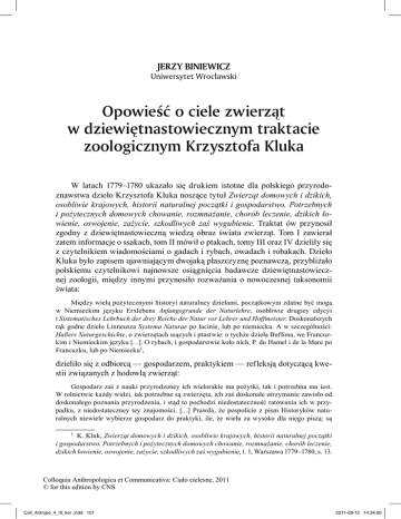 JERZY BINIEWICZ Uniwersytet Wroc³awski Opowieœæ o ciele zwierz¹t w dziewiêtnastowiecznym traktacie zoologicznym Krzysztofa Kluka W latach 1779–1780 ukazało się drukiem istotne dla polskiego przyrodoznawstwa dzieło Krzysztofa Kluka noszące tytuł Zwierząt domowych i dzikich, osobliwie krajowych, historii naturalnej początki i gospodarstwo. Potrzebnych i pożytecznych domowych chowanie, rozmnażanie, chorób leczenie, dzikich łowienie, oswojenie, zażycie, szkodliwych zaś wygubienie. Traktat ów przynosił zgodny z dziewiętnastowieczną wiedzą obraz świata zwierząt. Tom I zawierał zatem informacje o ssakach, tom II mówił o ptakach, tomy III oraz IV dzieliły się z czytelnikiem wiadomościami o gadach i rybach, owadach i robakach. Dzieło Kluka było zapisem ujawniającym dwojaką płaszczyznę poznawczą, przybliżało polskiemu czytelnikowi najnowsze osiągnięcia badawcze dziewiętnastowiecznej zoologii, między innymi przynosiło rozważania o nowoczesnej taksonomii świata: Między wielą pożytecznymi historyi naturalney dziełami, początkowym zdatne być mogą w Niemieckim języku Erxlebens Anfangsgrunde der Naturlehre, osobliwie drugiey edycyi i Sistematisches Lehrbuch der drey Reiche der Natur vor Lehrer und Hoffmeister. Doskonalszych rąk godne dzieło Linneusza Systema Naturae po łacinie, lub po niemiecku. A w szczególności: Hallers Naturgeschichte, o zwierzętach ssących i ptastwie: o tychże dzieła Buffona, we Francuzkim i Niemieckim języku […]. O rybach, i gospodarstwie koło nich, P. du Hamel i de la Mare po Francuzku, lub po Niemiecku1, dzieliło się z odbiorcą — gospodarzem, praktykiem — refleksją dotyczącą kwestii związanych z hodowlą zwierząt: Gospodarz zaś z nauki przyrodzoney ich wielorakie ma pożytki, tak i potrzebna mu iest. W rolnictwie każdy widzi, iak potrzebne są zwierzęta, ich zaś doskonałe utrzymanie zawisło od doskonałego poznania przyrodzenia, i stąd to pochodzi niedostateczność ratowania ich w przypadku, z niedostateczney tey znajomości. […] Prawda, że pospolicie z pism Historyków naturalnych niewiele wybierze gospodarz do praktyki, ile, że wielu za wysoko dla niego piszą: są 1 K. Kluk, Zwierząt domowych i dzikich, osobliwie krajowych, historii naturalnej początki i gospodarstwo. Potrzebnych i pożytecznych domowych chowanie, rozmnażanie, chorób leczenie, dzikich łowienie, oswojenie, zażycie, szkodliwych zaś wygubienie, t. 1, Warszawa 1779–1780, s. 13. Colloquia Anthropologica et Communicativa: Ciało cielesne, 2011 © for this edition by CNS Coll_Antropo_4_III_kor .indd 101 2011-09-12 14:34:00 102 JERZY BINIEWICZ przecięż, którzy się do poięcia gospodarza stosuią, i ią gospodarującemu raczey w tym dziele pomagać przyrzekam 2. Autor traktatu, dzieląc się z czytelnikiem rozważaniami dotyczącymi świata zwierząt, przyjął trojaki punkt widzenia: a) zgodny z naukową wizją natury (zob. taksonomia Linneusza), b) pragmatyczny („gospodarski”), mówiący o hodowli zwierząt, korzyściach z niej płynących (zob. „Trzymając się podług przedsięwzięcia w tym Tomie I. samych tylko ssących Zwierząt, daię naprzód inne o nich wiadomości, z podziałem ich tak systematycznym, ile i gospodarskim. Lubo bowiem te znaczy dzieli Historyk naturalny, inaczej Gospodarz”3), c) teologiczny ujawniający metafizyczny wymiar refleksji o człowieku w „rzeczpospolitej zwierząt”. Kluk był przekonany, że dokonania naukowe przełomu XVIII i XIX stulecia dostarczają wiarygodnych danych pozwalających wykazać, że istnienie owej „rzeczpospolitej zwierząt” jest oczywistym faktem umacniającym przekonanie o systemowości, spójności świata natury: Powszechność żyiących stworzeń nazywa się Królestwem Zwierząt; pod imieniem zaś zwierzęcia zamykaią się wszystkie od Człowieka aż do nayostatnieyszego robaczka. Tę prawie niezliczoną gromadę starali się umieyętni na iakoweś porządne, i z przyrodzeniem się zgadzające oddziały lub Klassy podzielić4. Naukowym potwierdzeniem tezy o jedności świata zwierząt była ich taksonomia, stworzona przez systematyków XIX wieku, którzy sięgnęli po złożony zestaw kryteriów pozwalający zbudować przejrzysty, logiczny system: Słusznie ów wielki tego wieku Badacz Linneusz, królestwo zwierząt bardzo porządnym nazywa stanem, w którym się przyzwoita naiduye, liczba osób, na wyznaczonych przyzwoicie mieyscach, a każda z nich ma do naznaczonych sobie czynności potrzebną sposobność, i do pełnienia ich ma pobudkę z nagrody, lub bojaźń z kary. […] cała zaś ta Zwierząt rzeczpospolita, iednemu podlega człowiekowi, iako naywyższey, i postanowionemu nad niemi od Boga namiestnikowi, któremu iako dany iest rozum, mocą któremu rządzi niemi5. Ogół zwierząt — zgodnie z przyjętą taksonomią — został podzielony na klasy, rzędy, rodzaje, gatunki i odmiany. Podstawą klasyfikacji była morfologia zwierząt. Ciało zwierzęcia stawało się w przyjętej koncepcji markerem (narzędziem taksonomii) pozwalającym porównać gatunki, umieścić je w odpowiedniej grupie: Rodzaj II. Hippotamus amhibius, Koń Morski ma te gatunki: […] 218. Koń Morski, Tab: III. Fig: 4. ma długości od głowy do ogona stop 13. a okrąg jego ciała iest długości równy. Nogi od ziemi aż do brzucha są w około na półczwarty stopy grube. Głowa 2 3 4 5 Ibidem, s. 6–9. Ibidem, s. 51. Ibidem, s. 23. Ibidem, s. 127 nn. Colloquia Anthropologica et Communicativa: Ciało cielesne, 2011 © for this edition by CNS Coll_Antropo_4_III_kor .indd 102 2011-09-12 14:34:00 Opowieœæ o ciele zwierz¹t 103 na półtrzeciey stopy szeroka, a na trzy długa. Paszczęka czyni otwor na stopę. Oczy i uszy małe. Przez podłużne nozdrza wytryska wodę, ile razy na ląd wychodzi. Całe ciało iest nadęte, tłuste; nogi krótkie, grube; ogon: krótki zaostrzony. Sierści nigdzie nie ma, tylko na końcu ogona, i wąsy na mordzie. Skóra i