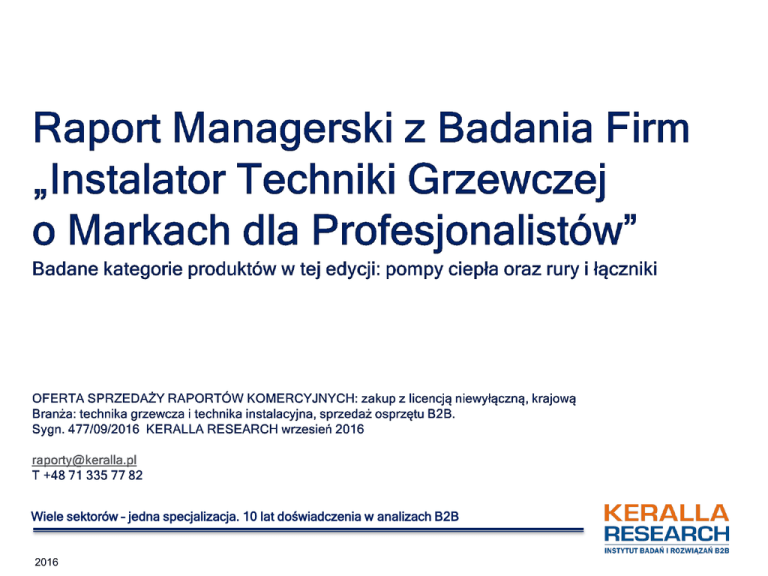 Wiele sektorów – jedna specjalizacja. 10 lat doświadczenia w analizach B2B 2016 Wiele sektorów – jedna specjalizacja. 10 lat doświadczenia w analizach B2B 2016       Data wydania raportu: wrzesień 2016. Sygn. 477/09/2016 Stron: 40 (PowerPoint) Format dostawy: elektronicznie PDF Język: polski Cena licencji krajowej: 4 000 PLN netto. Zamawiam Wydawca: Keralla Research Instytut Badań i Rozwiązań B2B Ul. Kazimierza Wielkiego 67 50-077 Wrocław Polska T 48 71 335 77 82 F 48 71 722 03 72 www.keralla.pl [email protected] Wiele sektorów – jedna specjalizacja. 10 lat doświadczenia w analizach B2B 2016 Z raportu dowiesz się między innymi  Jakie czynniki wpływają na wybór marek pompy ciepła, a jakie na wybór rur i łączników?  Czy duże i małe firmy różnią się pod względem skłonności do wyboru określonej marki pomp ciepła oraz rur i łączników?  Jakie marki pomp ciepła są najczęściej kupowane przez profesjonalistów?  Czy jakiś producent pomp ciepła wyróżnia się pozytywnie na tle konkurencji? A jeśli tak – to kto?  Czy cena jest faktycznie najważniejszym kryterium zakupu?  Czy coś różni młodszych i starszych stażem instalatorów w kryteriach wyboru?  Skąd instalatorzy czerpią informacje o nowych produktach na rynku ?  Czy profesjonaliści korzystają ze sklepów typu DIY?  Które z najczęściej kupowanych lub rekomendowanych marek mają wizerunek zapewniających szeroki asortyment produktów dostosowanych do różnych inwestycji?  Czy instalatorzy biorą pod uwagę doradztwo przy zakupie? WSPARCIE STRATEGII I SPRZEDAŻY  Jaka jest świadomość marek pomp ciepła oraz rur i łączników?  Które marki mają wysoką znajomość spontaniczną, a które mają wysoką wspomaganą?  Które marki stanowią tzw. „drugi wybór”?  Czy przyzwyczajenie to ważny czynnik przy zakupie produktów określonej marki?  Które marki pomp oraz rur i łączników wyróżniają się na rynku?  Czym wyróżniają się te marki?  Która grupa profesjonalistów jest najbardziej skłonna do kupowania pomp ciepła bezpośrednio od producentów?  Jak kształtuje się poziom przywiązania do marki na rynku techniki instalacyjnej?  Ilu zawodowców sięgnie po inny brand w sytuacji, gdyby zabrakło marki preferowanej?  Marki drugiego wyboru – czyli kto jest dla kogo konkurentem w opinii profesjonalisty?  Czy marki, które mają wysoką świadomość uzyskują równie wysoki poziom użytkowania (zakupu)?  Czy instalatorzy uczestniczą w targach branżowych?  Jak można scharakteryzować „typowego instalatora” (profil pod segmentację)? WSPARCIE KOMUNIKACJI I MARKETINGU Wiele sektorów – jedna specjalizacja. 10 lat doświadczenia w analizach B2B 2016 W raporcie firmy wymieniają m.in. te marki pomp ciepła:  Wiele sektorów – jedna specjalizacja. 10 lat doświadczenia w analizach B2B 2016 W raporcie firmy wymieniają m.in. te marki rur i łączników:  Wiele sektorów – jedna specjalizacja. 10 lat doświadczenia w analizach B2B 2016 Cel główny Cele szczegółowe Metodyka badania  Sporządzić syntetyczny, użyteczny i managerski raport, który będzie wspierał decyzje biznesowe producentów, dystrybutorów oraz wszystkich zainteresowanych rozwojem rynku markowego osprzętu, którego montującym i współdecydentem przy zakupie jest bardzo często (oprócz inwestora czy użytkownika końcowego) profesjonalista, instalator techniki grzewczej.  Określić poziom świadomości marek wśród instalatorów techniki grzewczej; sprawdzić, jakie marki są tzw. „pierwszym wyborem” i wskazać, kto dla kogo jest faktycznym konkurentem w percepcji instalatorów, którzy decydują bezpośrednio lub mają wpływ pośredni na wybór konkretnych marek.  Kategorie produktowe objęte badaniem w tej edycji to: POMPY CIEPŁA, RURY I ŁĄCZNIKI.  Zbadać, jak kształtuje się spontaniczna i wspomagana znajomość marek w kategorii: techniki grzewczej i techniki instalacyjnej?  Porównać rozpoznawalność marek (świadomości brandu) w relacji do stopnia jej wykorzystania (zakupu)?  Sprawdzić, jaki wizerunek mają najczęściej montowane marki pomp ciepła oraz rur i łączników?  Zidentyfikować występujące podobieństwa oraz różnice w postawach i praktykach zakupowych pomiędzy firmami ze względu na rozmiar (zatrudnienie) czy doświadczenie na rynku.  Wskazać źródła wiedzy o producentach i markach, o nowościach na rynku, poznać stosunek instalatorów do doradztwa, kryteria wyboru marek,  Prezentowanie wyniki oparto na wywiadach z instalatorami techniki grzewczej. Próba ogólnopolska, dobór losowy N=300, technika CATI (standaryzowane wywiady telefoniczne z pełną kontrolą poprawności doboru respondenta). Badanie przeprowadzono w całej Polsce wyłącznie wśród firm prowadzących aktywną działalność zarobkową, z wyłączeniem podmiotów w stanie zawieszenia lub upadłości likwidacyjnej. Czas trwania wywiadu: średnio do 15 minut. Czas prowadzenia badań: 07.2016  .W raporcie umieszczono dodatkowe informacje z tzw. analiz krzyżowych, które przeprowadzono dla wszystkich pytań przez zmienne metrykowe typu zatrudnienie czy staż pracy w zawodzie. Tylko wówczas, gdy różnice w odpowiedziach (rozkładach częstości) okazywały się - po sprawdzeniu specjalistycznymi testami SPSS - istotne statystycznie, informację taką umieszczono w ramkach, opisując je jako Profil. Informacje tego rodzaju sygnalizują, że np. pomiędzy grupami odbiorców zachodzą różnice w kryteriach doboru marki czy świadomości marki, co warto uwzględnić podczas tworzenia kampanii reklamowych, budowaniu programów rabatowych lub w innych działaniach marketingowo-sprzedażowych, których adresatem będzie instalator techniki grzewczej. Wiele sektorów – jedna specjalizacja. 10 lat doświadczenia w analizach B2B 2016 Zawartość raportu: Cele projektu  Cele projektu, metodologia i kontekst badania  Charakterystyka badanych wg specjalizacji, rozmiaru firmy, funkcji