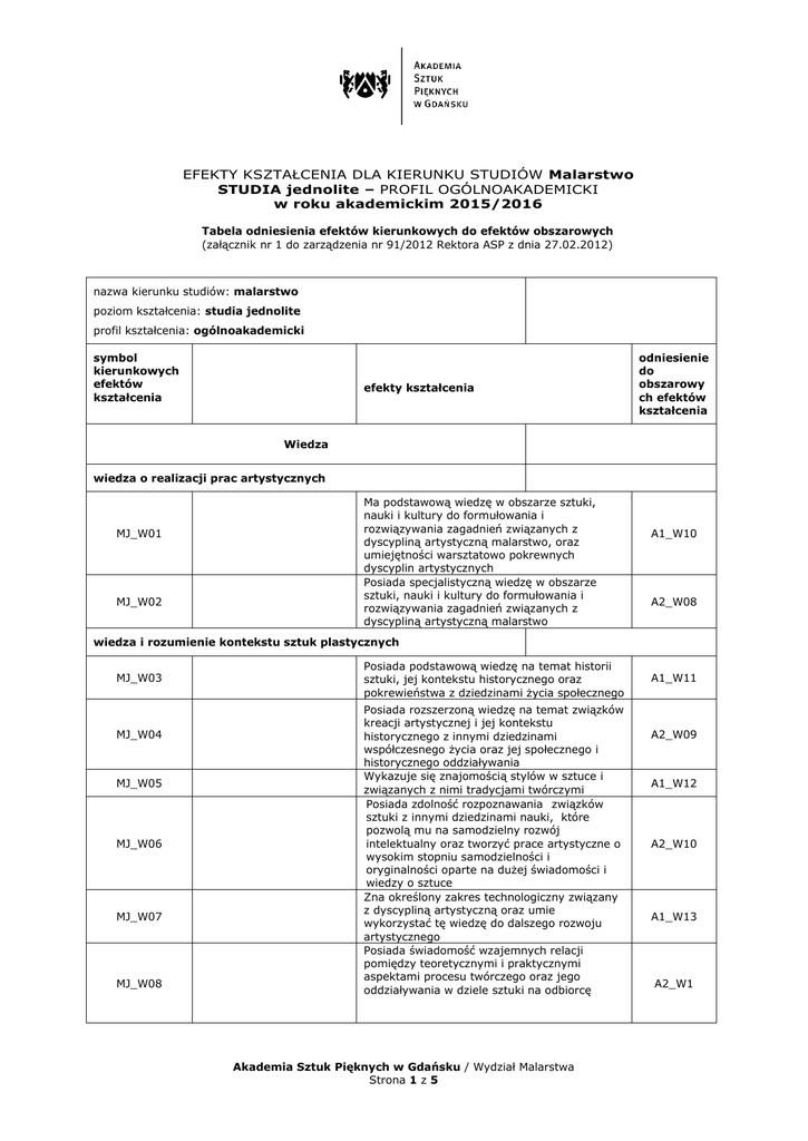 EFEKTY KSZTAŁCENIA DLA KIERUNKU STUDIÓW Malarstwo STUDIA jednolite – PROFIL OGÓLNOAKADEMICKI w roku akademickim 2015/2016 Tabela odniesienia efektów kierunkowych do efektów obszarowych (załącznik nr 1 do zarządzenia nr 91/2012 Rektora ASP z dnia 27.02.2012) nazwa kierunku studiów: malarstwo poziom kształcenia: studia jednolite profil kształcenia: ogólnoakademicki symbol kierunkowych efektów kształcenia efekty kształcenia odniesienie do obszarowy ch efektów kształcenia Wiedza wiedza o realizacji prac artystycznych MJ_W01 MJ_W02 Ma podstawową wiedzę w obszarze sztuki, nauki i kultury do formułowania i rozwiązywania zagadnień związanych z dyscypliną artystyczną malarstwo, oraz umiejętności warsztatowo pokrewnych dyscyplin artystycznych Posiada specjalistyczną wiedzę w obszarze sztuki, nauki i kultury do formułowania i rozwiązywania zagadnień związanych z dyscypliną artystyczną malarstwo A1_W10 A2_W08 wiedza i rozumienie kontekstu sztuk plastycznych MJ_W03 MJ_W04 MJ_W05 MJ_W06 MJ_W07 MJ_W08 Posiada podstawową wiedzę na temat historii sztuki, jej kontekstu historycznego oraz pokrewieństwa z dziedzinami życia społecznego Posiada rozszerzoną wiedzę na temat związków kreacji artystycznej i jej kontekstu historycznego z innymi dziedzinami współczesnego życia oraz jej społecznego i historycznego oddziaływania Wykazuje się znajomością stylów w sztuce i związanych z nimi tradycjami twórczymi Posiada zdolność rozpoznawania związków sztuki z innymi dziedzinami nauki, które pozwolą mu na samodzielny rozwój intelektualny oraz tworzyć prace artystyczne o wysokim stopniu samodzielności i oryginalności oparte na dużej świadomości i wiedzy o sztuce Zna określony zakres technologiczny związany z dyscypliną artystyczną oraz umie wykorzystać tę wiedzę do dalszego rozwoju artystycznego Posiada świadomość wzajemnych relacji pomiędzy teoretycznymi i praktycznymi aspektami procesu twórczego oraz jego oddziaływania w dziele sztuki na odbiorcę Akademia Sztuk Pięknych w Gdańsku / Wydział Malarstwa Strona 1 z 5 A1_W11 A2_W09 A1_W12 A2_W10 A1_W13 A2_W1 wiedza w zakresie możliwości kreacji artystycznej Potrafi dokonywać świadomych wyborów tworzących jego kreację artystyczną , uwzględniającą swobodę i niezależność wypowiedzi artystycznej MJ_W09 A2_W12 UMIEJĘTNOŚCI umiejętności ekspresji artystycznej MJ_U01 MJ_U02 Dysponując nabytymi środkami wyrazu tworzy i realizuje własne koncepcje artystyczne Posiada rozwiniętą osobowość artystyczną i umiejętność samodzielnego kreowania dzieła oraz własnych koncepcji artystycznych A1_U14 Umie świadomi posługiwać się warsztatem oraz wybraną techniką i technologią w realizacji prac artystycznych Potrafi realizować, wdrażać i podejmować samodzielne decyzje artystyczne Umie podejmować samodzielne decyzje podczas realizacji własnych działań artystycznych Jest przygotowany do projektowania prac artystycznych w aspekcie estetycznym, społecznym i prawnym A1_U15 A1_U16 A2_U11 umiejętności realizacji prac artystycznych MJ_U03 MJ_U04 MJ_U05 MJ_U06 A2_U12 A2_U13 A1_U17 A2_U14 umiejętności pracy w zespole Jest przygotowany do twórczej pracy w zespole z innymi osobami Jest przygotowany do twórczej współpracy z innymi osobami w ramach prac zespołowych oraz przewodniczenia w trakcie realizacji projektów zespołowych MJ_U07 MJ_U08 A1_U18 A2_U15 umiejętności warsztatowe Posiada zakres umiejętności formalnych do realizacji własnych koncepcji artystycznych oraz posługuje się efektywnymi technikami ćwiczenia umiejętności warsztatowych Posiada umiejętności formalne do realizowania i wyrażania własnych koncepcji, idei i pomysłów artystycznych MJ_U09 MJ_U10 A1_U19 A1_U20 A2_U16 umiejętności kreacji artystycznej MJ_U11 MJ_U12 Ma umiejętności własnych idei artystycznych w różnych koncepcjach stylistycznych, przy swobodnym wykorzystaniu emocjonalności intuicji i wyobraźni Posiada umiejętność i świadomość wykorzystywania wszelkich wzorców leżących u podstaw niezależnych kreacji artystycznych A1_U21 A2_U17 umiejętności werbalne MJ_U13 Posiada umiejętności korzystania z rożnych źródeł teoretycznych oraz przygotowania prac pisemnych i wystąpień ustnych Akademia Sztuk Pięknych w Gdańsku / Wydział Malarstwa Strona 2 z 5 A1_U22 Posiada umiejętności przygotowania rozbudowanych prac pisemnych i wystąpień ustnych związanych z szeroko pojętymi zagadnieniami malarstwa przy wykorzystaniu podst. źródeł teoretycznych a także innych ujęć Posiada umiejętności językowe w zakresie dziedzin sztuki i dyscyplin artystycznych, właściwych dla studiowania kierunku studiów zgodnie z wymaganiami określonymi dla poziomu B2 Europejskiego Systemu Opisu Kształcenia Językowego Posiada umiejętności językowe w zakresie dziedzin sztuki i dyscyplin artystycznych, właściwych dla studiowanego kierunku studiów na poziomie B2+ ESOKJ MJ_U14 MJ_U15 MJ_U16 A2_U18 A1_U23 A2_U19 umiejętności w zakresie publicznej prezentacji Zna formy zachowań związane z publicznymi prezentacjami własnych dokonań Wykazuje dużą odpowiedzialność podczas publicznych wystąpień prezentujących własną twórczość i działalność artystyczną innych twórców MJ_U17 MJ_U18 A1_U24 A2_U20 Kompetencje społeczne niezależność Rozumie potrzebę uczenia się przez całe życie MJ_K01 Absolwent poprzez nabytą wiedzę i umiejętność łączenia jej elementów, rozumie potrzebę inspirowania innych i uczenia się przez całe życie Samodzielnie podejmuje niezależne prace, wykazuje się umiejętnościami zbierania, analizowania i interpretowania informacji, rozwijania idei i formułowania krytycznej argumentacji, oraz wewnętrzną motywacją i umiejętnością organizacji pracy Potrafi podejmować niezależne decyzje artystyczne, także w warunkach ograniczonego dostępu do potrzebnych informacji MJ_K02 MJ_K03 MJ_K04 A1_K01 A2_K01 A1_K02 A2_K02 uwarun