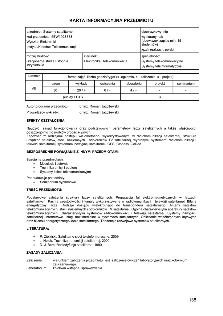 KARTA INFORMACYJNA PRZEDMIOTU przedmiot: Systemy satelitarne kod przedmiotu: 5EW109S733 Wydział: Elektroniki Instytut/Katedra: Telekomunikacji obowiązkowy: nie wybierany: tak (obowiązek zapisu min. 15 studentów) język realizacji: polski rodzaj studiów: Stacjonarne studia I stopnia inżynierskie semestr kierunek: Elektronika i telekomunikacja specjalność: Systemy telekomunikacyjne Systemy teleinformatyczne forma zajęć, liczba godzin/rygor (x -egzamin, + - zaliczenia, # - projekt) VII razem wykłady ćwiczenia laboratoria projekt seminarium 30 20 / + 6/+ 4/+ - - punkty ECTS Autor programu przedmiotu: dr inż. Roman Jażdżewski Prowadzący wykłady: dr inż. Roman Jażdżewski 3 EFEKTY KSZTAŁCENIA: Nauczyć: zasad funkcjonowania oraz podstawowych parametrów łączy satelitarnych a także właściwości poszczególnych ośrodków propagacyjnych. Zapoznać z: rodzajami dostępu wielokrotnego, wykorzystywanymi w radiokomunikacji satelitarnej, strukturą urządzeń satelitów, stacji naziemnych i odbiorników TV satelitarnej, wybranymi systemami radiokomunikacji i telewizji satelitarnej, systemami nawigacji satelitarnej: GPS, Glonass, Galileo. BEZPOŚREDNIE POWIĄZANIE Z INNYMI PRZEDMIOTAMI: Bazuje na przedmiotach: • Modulacja i detekcja • Technika emisji i odbioru • Systemy i sieci telekomunikacyjne Podbudowuje przedmioty: • Seminarium dyplomowe TREŚĆ PRZEDMIOTU: Podstawowe założenia struktury łączy satelitarnych. Propagacja fal elektromagnetycznych w łączach satelitarnych. Pasma częstotliwości i kanały wykorzystywane w radiokomunikacji i telewizji satelitarnej. Bilans energetyczny łącza. Rodzaje dostępu wielokrotnego do transpondera satelitarnego. Anteny satelitów telekomunikacyjnych, stacji naziemnych i odbiorników TV satelitarnej. Ogólna charakterystyka aparatury satelitów telekomunikacyjnych. Charakterystyka systemów radiokomunikacji i telewizji satelitarnej. Systemy nawigacji satelitarnej. Internetowe usługi multimedialne w systemach satelitarnych. Obliczanie współrzędnych kątowych oraz bilansu energetycznego łącza satelitarnego. Tendencje rozwojowe systemów satelitarnych. LITERATURA: • • • R. Zieliński, Satelitarne sieci teleinformatyczne, 2009 J. Hołub, Technika transmisji satelitarnej, 2000 D. J. Bem, Radiodyfuzja satelitarna, 1990 ZASADY ZALICZANIA: Zaliczenie: Laboratorium: warunkiem zaliczenia przedmiotu jest zaliczenie ćwiczeń laboratoryjnych oraz kolokwium zaliczeniowego. kolokwia wstępne, sprawozdania. 138