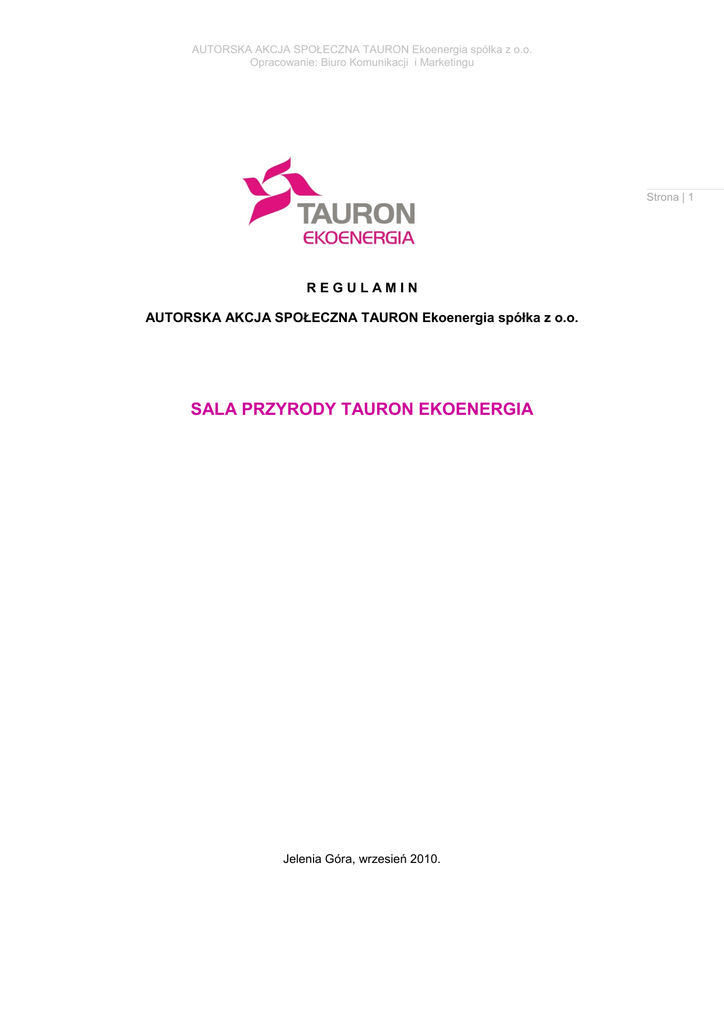 AUTORSKA AKCJA SPOŁECZNA TAURON Ekoenergia spółka z o.o. Opracowanie: Biuro Komunikacji i Marketingu Strona | 1 REGULAMIN AUTORSKA AKCJA SPOŁECZNA TAURON Ekoenergia spółka z o.o. SALA PRZYRODY TAURON EKOENERGIA Jelenia Góra, wrzesień 2010. AUTORSKA AKCJA SPOŁECZNA TAURON Ekoenergia spółka z o.o. Opracowanie: Biuro Komunikacji i Marketingu Społeczna akcja „Sala Przyrody Tauron Ekoenergia” adresowana jest do szkół podstawowych, z terenu działania TAURON Ekoenergii. Przedstawiciele szkół walczą o cztery równorzędne nagrody w wysokości 40.000 zł każda. Nagroda, zgodnie z regulaminem, jest nagrodą celową z przeznaczeniem na zorganizowanie (tzn. remont i wyposażenie) sali dydaktycznej do nauki przyrody pod nazwą „Sala Przyrody TAURON Ekoenergia”. Strona | 2 §1 ORGANIZATOR I CZAS TRWANIA AKCJI 1.1 Akcja prowadzona jest pod nazwą „Sala przyrody TAURON Ekoenergia”. 1.2 Organizatorem akcji „Sala przyrody TAURON Ekoenergia” jest TAURON Ekoenergia spółka z o.o. z siedzibą w Jeleniej Górze, 58 - 500 przy ul. Obrońców Pokoju 2B, o kapitale zakładowym w wysokości 200.264.000,00 zł. wpisanym przez Sąd Rejonowy dla Wrocławia Fabrycznej, Wydział IX Gospodarczy KRS do rejestru przedsiębiorców pod numerem KRS 0000195546, posiadającym numer identyfikacji podatkowej NIP 611-25-02-075 oraz REGON 231194695, zwanym dalej ,,Organizatorem’’. 1.3. Akcja opiera się na określonym temacie przewodnim, który jest jednocześnie osią rozgrywanego między szkołami konkursu. 1.4 W roku 2011 akcja rozpoczyna się w dniu 1 lutego 2011 r. i trwać będzie do dnia 30 września 2011 r. i odbywa się w następujących etapach: HARMONOGRAM AKCJI DATA ZDARZENIE 01 luty 2011r. Rozpoczęcie Akcji. 31 marzec 2011r. Ostatni dzień dostarczenia do Organizatora formularza zgłoszeniowego. 31 maja 2011r. Ostatni dzień dostarczenia do Organizatora prac konkursowych. 01 – 10 czerwiec 2011r. Obrady Kapituły Akcji. 10 czerwca 2011r. Ogłoszenie wyników Uroczyste wręczenie Laureatom symbolicznych czeków 15 czerwca 2011r. 23 czerwca – 15 lipiec 2011r. wrzesień 2011r. Podpisanie umów i przekazanie nagród finansowych na konta wskazane przez Laureatów. Uroczyste otwarcie „Sali przyrody TAURON Ekoenergia” (dokładne daty po ustaleniu haromonogramu z laureatami akcji). 1.6 Temat przewodnim pierwszej edycji akcji brzmi: „Nasza Szkoła dba o klimat”. Zasady konkursu określa §5 niniejszego regulaminu. AUTORSKA AKCJA SPOŁECZNA TAURON Ekoenergia spółka z o.o. Opracowanie: Biuro Komunikacji i Marketingu §2 WARUNKI UCZESTNICTWA 2.1 Uczestnikiem Akcji może być szkoła podstawowa znajdująca się na terenie miasta lub gminy w którym znajduje się elektrownia wodna lub wiatrowa należąca do spółki TAURON Ekoenergia. Strona | 3 2.2 Warunkiem uczestnictwa w Akcji jest przesłanie do Organizatora w terminie do 31 marca 2011r. wypełnionego arkusza zgłoszeniowego, stanowiącego załącznik nr 1 do niniejszego regulaminu oraz dosłanie w terminie do 31 maja 2011 roku prac konkursowych, zgodnie z wymogami opisanymi w §5 ZASADY KONKURSU 2011. 2.3 Uczestnik Konkursu zobowiązany jest do zapoznania się z Regulaminem Akcji. Spełnienie warunku uczestnictwa w Akcji, wskazanego w ust. 2.2. oznacza akceptację wszystkich punktów Regulaminu. 2.4 Organizator nie ponosi odpowiedzialności za zgłoszenia, które nie dotarły do niego z przyczyn od niego niezależnych. 2.5 Organizator nie ponosi odpowiedzialności za podanie nieprawdziwych danych. Podanie nieprawdziwych danych skutkuje odebraniem prawa do nagrody. 2.6 Udział w Akcji jest bezpłatny. §3 OBOWIĄZKI UCZESTNIKÓW AKCJI 3.1 Przystępując do Akcji zarządzający Szkołą zobowiązani są do uzyskania wszelkich pozwoleń (jeśli są takie wymagane przez administratora budynku, konserwatora zabytków itd.), dzięki którym po ewentualnym zwycięstwie sala przeznaczona na „Salę przyrody TAURON Ekoenergia” będzie mogła być opisana odpowiednim szyldem, a na budynku szkoły będzie można zawiesić tablice z logotypem Organizatora oraz hasłem: „TAURON Ekoenergia - Nazwa szkoły - NATURALNIE NAJLEPSI”. 3.2 Szyld z logo zostanie wykonany przez TAURON Ekoenergię, po wcześniejszym ustaleniu jego rozmiarów i miejsca montażu z Laureatem. 3.3 Montażu szyldów zarówno na budynku jak i nad salą przyrody dokona Laureat na własny koszt. 3.4 Zarządzający szkołą zobowiązani są do powołania jednej osoby będącej koordynatorem Akcji na terenie szkoły. §4 KAPITUŁA AKCJI 4.1 Laureatów Akcji/Zwycięzców konkursu wybiera kapituła Akcji. 4.2 Kapituła Akcji jest tożsama z Kapitułą konkursu. 4.3 Członków Kapituły powołuje Organizator. 4.4 Decyzje Kapituły są ostateczne. AUTORSKA AKCJA SPOŁECZNA TAURON Ekoenergia spółka z o.o. Opracowanie: Biuro Komunikacji i Marketingu § 5. ZASADY KONKURSU 2011 5.1 Uczestnicy biorący udział w Akcji po przesłaniu formularza zgłoszeniowego zostają automatycznie zarejestrowani w konkursie, którego tematem przewodnim jest hasło „Nasza szkoła dba o klimat”. 5.2 Do dnia 31 maja 2011roku Uczestnik zobowiązany jest przesłać do siedziby Organizatora pracę Strona | 4 konkursową, na którą składają się: Załącznik a) Szczegółowy opis przedsięwzięć realizowanych lub wprowadzonych do realizacji w szkole w ramach ochrony klimatu. Załącznik b) Ponadprogramowe działania edukacyjne prowadzone w szkole w zakresie ochrony środowiska naturalnego, ze szczególnym uwzględnieniem ochrony klimatu. Załącznik c) Wszelkiego rodzaju prace w dowolnej technice (literackie, plastyczne, multimedialne i inne), które ilustrować będą zaangażowanie uczniów i nauczycieli w prace nad ochroną klimatu. Uwaga: Dodatkowe punkty będą przyznane za już zdobyte nagrody i wyróżnienia w zakresie szeroko rozumianej działalności proekologicznej szkoły. Jeden punkt za każdy tytuł lub wyróżnienie. Organizator zastrzega sobie jednak, że uzyskane w ten sp