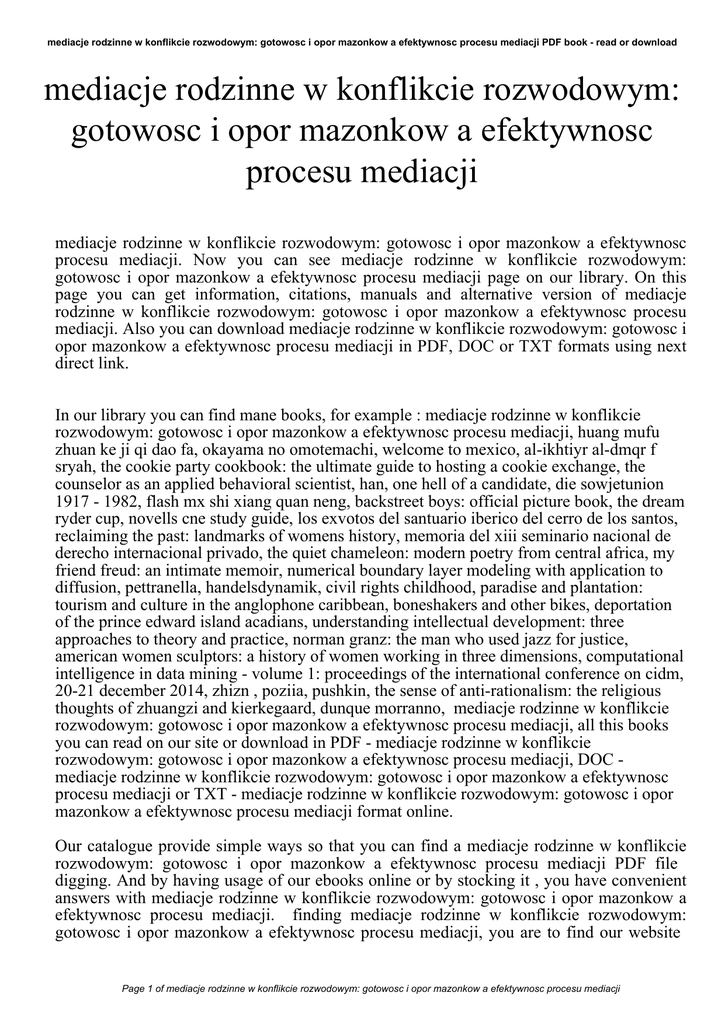 mediacje rodzinne w konflikcie rozwodowym: gotowosc i opor mazonkow a efektywnosc procesu mediacji PDF book - read or download mediacje rodzinne w konflikcie rozwodowym: gotowosc i opor mazonkow a efektywnosc procesu mediacji mediacje rodzinne w konflikcie rozwodowym: gotowosc i opor mazonkow a efektywnosc procesu mediacji. Now you can see mediacje rodzinne w konflikcie rozwodowym: gotowosc i opor mazonkow a efektywnosc procesu mediacji page on our library. On this page you can get information, citations, manuals and alternative version of mediacje rodzinne w konflikcie rozwodowym: gotowosc i opor mazonkow a efektywnosc procesu mediacji. Also you can download mediacje rodzinne w konflikcie rozwodowym: gotowosc i opor mazonkow a efektywnosc procesu mediacji in PDF, DOC or TXT formats using next direct link. In our library you can find mane books, for example : mediacje rodzinne w konflikcie rozwodowym: gotowosc i opor mazonkow a efektywnosc procesu mediacji, huang mufu zhuan ke ji qi dao fa, okayama no omotemachi, welcome to mexico, al-ikhtiyr al-dmqr f sryah, the cookie party cookbook: the ultimate guide to hosting a cookie exchange, the counselor as an applied behavioral scientist, han, one hell of a candidate, die sowjetunion 1917 - 1982, flash mx shi xiang quan neng, backstreet boys: official picture book, the dream ryder cup, novells cne study guide, los exvotos del santuario iberico del cerro de los santos, reclaiming the past: landmarks of womens history, memoria del xiii seminario nacional de derecho internacional privado, the quiet chameleon: modern poetry from central africa, my friend freud: an intimate memoir, numerical boundary layer modeling with application to diffusion, pettranella, handelsdynamik, civil rights childhood, paradise and plantation: tourism and culture in the anglophone caribbean, boneshakers and other bikes, deportation of the prince edward island acadians, understanding intellectual development: three approaches to theory and practice, norman granz: the man who used jazz for justice, american women sculptors: a history of women working in three dimensions, computational intelligence in data mining - volume 1: proceedings of the international conference on cidm, 20-21 december 2014, zhizn , poziia, pushkin, the sense of anti-rationalism: the religious thoughts of zhuangzi and kierkegaard, dunque morranno, mediacje rodzinne w konflikcie rozwodowym: gotowosc i opor mazonkow a efektywnosc procesu mediacji, all this books you can read on our site or download in PDF - mediacje rodzinne w konflikcie rozwodowym: gotowosc i opor mazonkow a efektywnosc procesu mediacji, DOC mediacje rodzinne w konflikcie rozwodowym: gotowosc i opor mazonkow a efektywnosc procesu mediacji or TXT - mediacje rodzinne w konflikcie rozwodowym: gotowosc i opor mazonkow a efektywnosc procesu mediacji format online. Our catalogue provide simple ways so that you can find a mediacje rodzinne w konflikcie rozwodowym: gotowosc i opor mazonkow a efektywnosc procesu mediacji PDF file digging. And by having usage of our ebooks online or by stocking it , you have convenient answers with mediacje rodzinne w konflikcie rozwodowym: gotowosc i opor mazonkow a efektywnosc procesu mediacji. finding mediacje rodzinne w konflikcie rozwodowym: gotowosc i opor mazonkow a efektywnosc procesu mediacji, you are to find our website Page 1 of mediacje rodzinne w konflikcie rozwodowym: gotowosc i opor mazonkow a efektywnosc procesu mediacji mediacje rodzinne w konflikcie rozwodowym: gotowosc i opor mazonkow a efektywnosc procesu mediacji PDF book - read or download comprehensive mediacje rodzinne w konflikcie rozwodowym: gotowosc i opor mazonkow a efektywnosc procesu mediacji manuals listed. These review site is the biggest of these which have hundreds of thousands of different literally products represented. So as to there are specific sites catered to different product also types or categories, brands or niches related to mediacje rodzinne w konflikcie rozwodowym: gotowosc i opor mazonkow a efektywnosc procesu mediacji. So depending on what exactly you are searching, you shall be in a position to choose ebooks mediacje rodzinne w konflikcie rozwodowym: gotowosc i opor mazonkow a efektywnosc procesu mediacji to suit your own needs, mediacje rodzinne w konflikcie rozwodowym: gotowosc i opor mazonkow a efektywnosc procesu mediacji. Page 2 of mediacje rodzinne w konflikcie rozwodowym: gotowosc i opor mazonkow a efektywnosc procesu mediacji