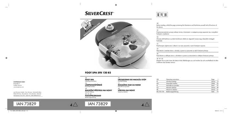 Before reading, unfold the page containing the illustrations and familiarise yourself with all functions of the device. Przed przeczytaniem proszę rozłożyć stronę z ilustracjami, a następnie proszę zapoznać się z wszystkimi funkcjami urządzenia. Olvasás előtt kattintson az ábrát tartalmazó oldalra és végezetül ismerje meg a készülék mindegyik funkcióját. Pred branjem odprite stran s slikami in se nato seznanite z vsemi funkcijami naprave. Před čtením si otevřete stranu s obrázky a potom se seznamte se všemi funkcemi přístroje. Pred čítaním si odklopte stranu s obrázkami a potom sa oboznámte so všetkými funkciami prístroja. Klappen Sie vor dem Lesen die Seite mit den Abbildungen aus und machen Sie sich anschließend mit allen Funktionen des Gerätes vertraut. FOOT SPA SFB 120 B2 FOOT SPA URZĄDZENIE DO MASAŻU STÓP LÁBPEZSGŐFÜRDŐ MASAŽNA KAD ZA NOGE MASÁŽNÍ PŘÍSTROJ NA NOHY VÍRIVKA NA NOHY Operating instructions KOMPERNASS GMBH Burgstraße 21 D-44867 Bochum www.kompernass.com Használati utasítás Návod k obsluze Last Information Update · Stan informacji · Információk állása Stanje informacij · Stav informací · Stav informácií · Stand der Informationen: 02 / 2012 · Ident.-No.: SFB120B2022012-1 Instrukcja obsługi Navodila za uporabo Návod na obsluhu GB PL HU SI CZ SK DE / AT / CH Operating instructions Instrukcja obsługi Használati utasítás Navodila za uporabo Návod k obsluze Návod na obsluhu Bedienungsanleitung Page Strona Oldal Stran Strana Strana Seite 1 13 25 37 49 61 73 FUSSSPRUDELBAD Bedienungsanleitung IAN 73829 CV_73829_SFB120B2_LB4.indd 1-3 4 IAN 73829 4 06.02.12 11:11 1 2 3 4 5 6 7 8 0 9 w q 0 CV_73829_SFB120B2_LB4.indd 4-6 06.02.12 11:11 Index GB Information for these operating instructions . . . . . . . . . . . . . . . . . . . . . . . . 2 Copyright . . . . . . . . . . . . . . . . . . . . . . . . . . . . . . . . . . . . . . . . . . . . . . . . . . . . . . . . . . . . . . . 2 Intended use . . . . . . . . . . . . . . . . . . . . . . . . . . . . . . . . . . . . . . . . . . . . . . . . . . 2 Safety instructions . . . . . . . . . . . . . . . . . . . . . . . . . . . . . . . . . . . . . . . . . . . . . 3 Items supplied . . . . . . . . . . . . . . . . . . . . . . . . . . . . . . . . . . . . . . . . . . . . . . . . . 5 Disposal of the packaging . . . . . . . . . . . . . . . . . . . . . . . . . . . . . . . . . . . . . . . . . . . . . . . . . . 5 Technical data . . . . . . . . . . . . . . . . . . . . . . . . . . . . . . . . . . . . . . . . . . . . . . . . . 6 Description of appliance / attachments . . . . . . . . . . . . . . . . . . . . . . . . . . . . 6 Functions of the Foot Bubble Bath . . . . . . . . . . . . . . . . . . . . . . . . . . . . . . . . . 7 Operation . . . . . . . . . . . . . . . . . . . . . . . . . . . . . . . . . . . . . . . . . . . . . . . . . . . . 7 Setup . . . . . . . . . . . . . . . . . . . . . . . . . . . . . . . . . . . . . . . . . . . . . . . . . . . . . . . . . . . . . . . . . . Fitting the attachment for the centre console . . . . . . . . . . . . . . . . . . . . . . . . . . . . . . . . . . . . Fill with water . . . . . . . . . . . . . . . . . . . . . . . . . . . . . . . . . . . . . . . . . . . . . . . . . . . . . . . . . . . . Switching on . . . . . . . . . . . . . . . . . . . . . . . . . . . . . . . . . . . . . . . . . . . . . . . . . . . . . . . . . . . . Using the Foot Bubble bath . . . . . . . . . . . . . . . . . . . . . . . . . . . . . . . . . . . . . . . . . . . . . . . . . After the foot bath . . . . . . . . . . . . . . . . . . . . . . . . . . . . . . . . . . . . . . . . . . . . . . . . . . . . . . . . 7 7 8 8 9 9 Cleaning . . . . . . . . . . . . . . . . . . . . . . . . . . . . . . . . . . . . . . . . . . . . . . . . . . . . . 10 Storage . . . . . . . . . . . . . . . . . . . . . . . . . . . . . . . . . . . . . . . . . . . . . . . . . . . . . 10 Disposal of the appliance . . . . . . . . . . . . . . . . . . . . . . . . . . . . . . . . . . . . . . . 11 Notes on the Declaration of Conformity . . . . . . . . . . . . . . . . . . . . . . . . . . . 11 Importer. . . . . . . . . . . . . . . . . . . . . . . . . . . . . . . . . . . . . . . . . . . . . . . . . . . . . 11 Warranty . . . . . . . . . . . . . . . . . . . . . . . . . . . . . . . . . . . . . . . . . . . . . . . . . . . . 12 Service . . . . . . . . . . . . . . . . . . . . . . . . . . . . . . . . . . . . . . . . . . . . . . . . . . . . . . 12 SFB 120 B2 IB_73829_SFB120B2_LB4.indb Abs2:1 1 06.02.12 12:47 Information for these operating instructions GB These operating instructions are a component of the Foot Bubble Bath SFB 120 B2 (henceforth designated as the appliance) and they provide you with important information about the intended use, safety and connection as well as operation of the appliance. The operating instructions must be constantly kept available close to the appliance. They are to be read and applied by everyone assigned to operate, and eliminate faults in, the appliance. Keep these operating instructions and hand them over with the appliance to any future owners. Copyright This documentation is copyright protected. Any copying or reproduction of it, including as extracts, as well as the reproduction of images, also in an altered state, is only permitted with the written authorisation of the manufacturer. Intended use This foot bubble bath is intended for personal, home use. Its function is only to bathe and massage the feet. It is not suitable for any other purpose. It is not intended for use in the medical/ therapeutic or commercial fields. WARNING Risks from unintended use! Risks can be engendered by the appliance if it used for unintended purposes and/or other types of use. ► Use the appliance exclusively for its intended purposes. ► Observe the procedures described in these operating instructions. NOTICE ► Risks can be engendered if this appliance is used for purposes not intended for it and/or for other types of 