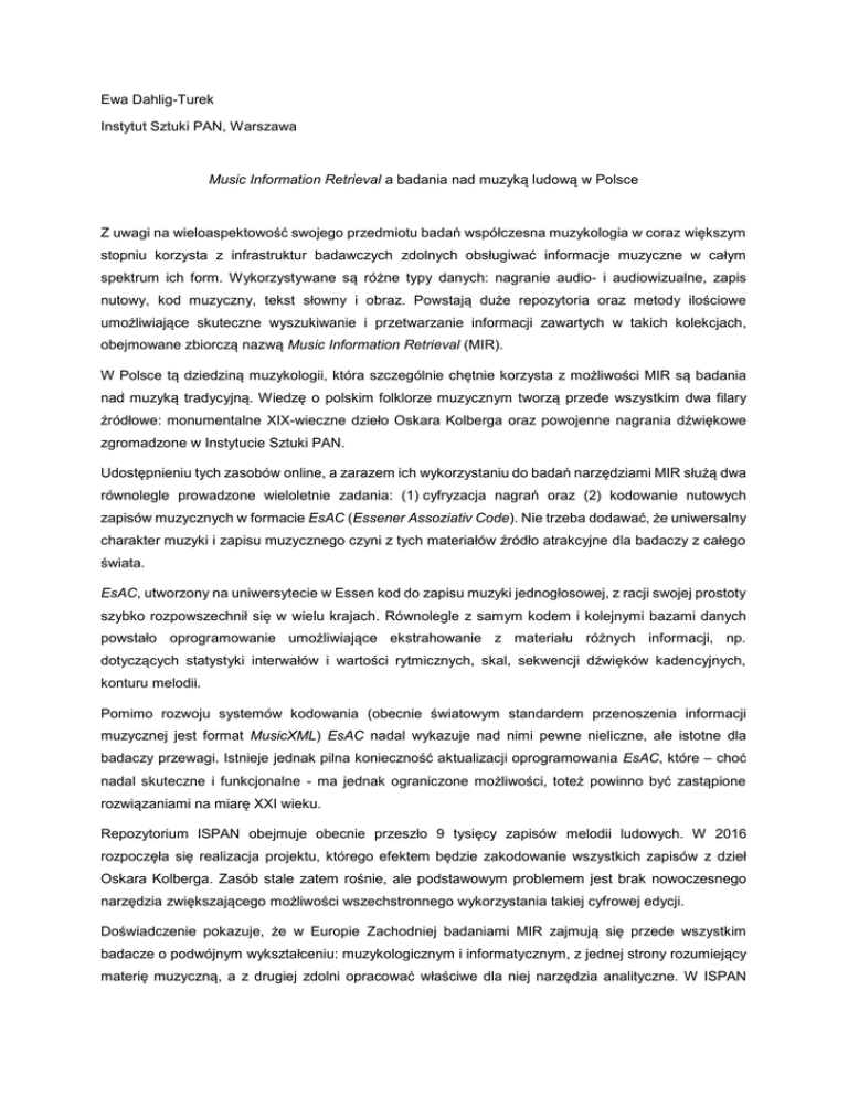 Ewa Dahlig-Turek Instytut Sztuki PAN, Warszawa Music Information Retrieval a badania nad muzyką ludową w Polsce Z uwagi na wieloaspektowość swojego przedmiotu badań współczesna muzykologia w coraz większym stopniu korzysta z infrastruktur badawczych zdolnych obsługiwać informacje muzyczne w całym spektrum ich form. Wykorzystywane są różne typy danych: nagranie audio- i audiowizualne, zapis nutowy, kod muzyczny, tekst słowny i obraz. Powstają duże repozytoria oraz metody ilościowe umożliwiające skuteczne wyszukiwanie i przetwarzanie informacji zawartych w takich kolekcjach, obejmowane zbiorczą nazwą Music Information Retrieval (MIR). W Polsce tą dziedziną muzykologii, która szczególnie chętnie korzysta z możliwości MIR są badania nad muzyką tradycyjną. Wiedzę o polskim folklorze muzycznym tworzą przede wszystkim dwa filary źródłowe: monumentalne XIX-wieczne dzieło Oskara Kolberga oraz powojenne nagrania dźwiękowe zgromadzone w Instytucie Sztuki PAN. Udostępnieniu tych zasobów online, a zarazem ich wykorzystaniu do badań narzędziami MIR służą dwa równolegle prowadzone wieloletnie zadania: (1) cyfryzacja nagrań oraz (2) kodowanie nutowych zapisów muzycznych w formacie EsAC (Essener Assoziativ Code). Nie trzeba dodawać, że uniwersalny charakter muzyki i zapisu muzycznego czyni z tych materiałów źródło atrakcyjne dla badaczy z całego świata. EsAC, utworzony na uniwersytecie w Essen kod do zapisu muzyki jednogłosowej, z racji swojej prostoty szybko rozpowszechnił się w wielu krajach. Równolegle z samym kodem i kolejnymi bazami danych powstało oprogramowanie umożliwiające ekstrahowanie z materiału różnych informacji, np. dotyczących statystyki interwałów i wartości rytmicznych, skal, sekwencji dźwięków kadencyjnych, konturu melodii. Pomimo rozwoju systemów kodowania (obecnie światowym standardem przenoszenia informacji muzycznej jest format MusicXML) EsAC nadal wykazuje nad nimi pewne nieliczne, ale istotne dla badaczy przewagi. Istnieje jednak pilna konieczność aktualizacji oprogramowania EsAC, które – choć nadal skuteczne i funkcjonalne - ma jednak ograniczone możliwości, toteż powinno być zastąpione rozwiązaniami na miarę XXI wieku. Repozytorium ISPAN obejmuje obecnie przeszło 9 tysięcy zapisów melodii ludowych. W 2016 rozpoczęła się realizacja projektu, którego efektem będzie zakodowanie wszystkich zapisów z dzieł Oskara Kolberga. Zasób stale zatem rośnie, ale podstawowym problemem jest brak nowoczesnego narzędzia zwiększającego możliwości wszechstronnego wykorzystania takiej cyfrowej edycji. Doświadczenie pokazuje, że w Europie Zachodniej badaniami MIR zajmują się przede wszystkim badacze o podwójnym wykształceniu: muzykologicznym i informatycznym, z jednej strony rozumiejący materię muzyczną, a z drugiej zdolni opracować właściwe dla niej narzędzia analityczne. W ISPAN dysponujemy tylko jedną stroną tych kompetencji, licząc na szansę, jaką stwarza partnerstwo w konsorcjum DARIAH.PL. W referacie zaprezentowana zostanie specyfika kodu EsAC i dotychczasowe (oficjalne i doraźnie „improwizowane”) sposoby analizowania zakodowanego materiału, który wygląda jak specyficzny tekst słowny. Celem będzie uzyskanie wskazówek, sugestii i być może propozycji współdziałania ze strony partnerów dysponujących doświadczeniem koniecznym do maksymalnego wykorzystania cennych zasobów.
