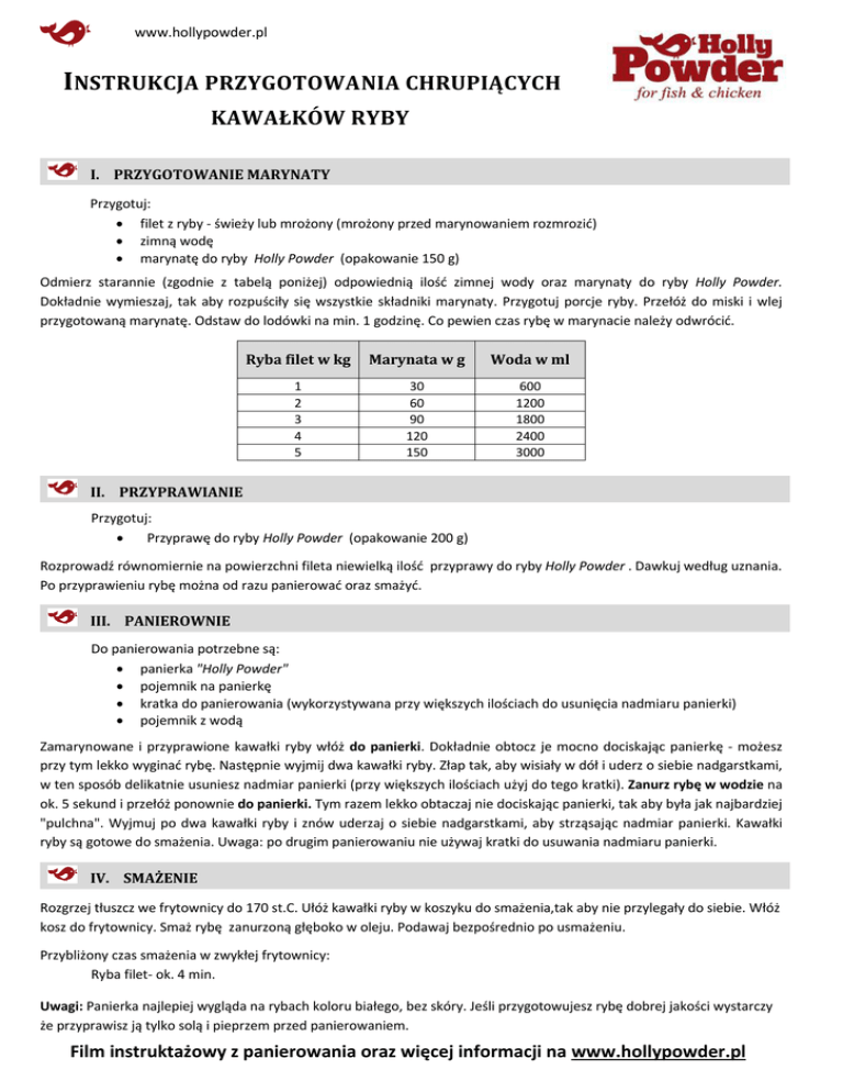 www.hollypowder.pl INSTRUKCJA PRZYGOTOWANIA CHRUPIĄCYCH KAWAŁKÓW RYBY I. PRZYGOTOWANIE MARYNATY Przygotuj: filet z ryby - świeży lub mrożony (mrożony przed marynowaniem rozmrozić) zimną wodę marynatę do ryby Holly Powder (opakowanie 150 g) Odmierz starannie (zgodnie z tabelą poniżej) odpowiednią ilość zimnej wody oraz marynaty do ryby Holly Powder. Dokładnie wymieszaj, tak aby rozpuściły się wszystkie składniki marynaty. Przygotuj porcje ryby. Przełóż do miski i wlej przygotowaną marynatę. Odstaw do lodówki na min. 1 godzinę. Co pewien czas rybę w marynacie należy odwrócić. Ryba filet w kg Marynata w g Woda w ml 1 2 3 4 5 30 60 90 120 150 600 1200 1800 2400 3000 II. PRZYPRAWIANIE Przygotuj: Przyprawę do ryby Holly Powder (opakowanie 200 g) Rozprowadź równomiernie na powierzchni fileta niewielką ilość przyprawy do ryby Holly Powder . Dawkuj według uznania. Po przyprawieniu rybę można od razu panierować oraz smażyć. III. PANIEROWNIE Do panierowania potrzebne są: panierka "Holly Powder" pojemnik na panierkę kratka do panierowania (wykorzystywana przy większych ilościach do usunięcia nadmiaru panierki) pojemnik z wodą Zamarynowane i przyprawione kawałki ryby włóż do panierki. Dokładnie obtocz je mocno dociskając panierkę - możesz przy tym lekko wyginać rybę. Następnie wyjmij dwa kawałki ryby. Złap tak, aby wisiały w dół i uderz o siebie nadgarstkami, w ten sposób delikatnie usuniesz nadmiar panierki (przy większych ilościach użyj do tego kratki). Zanurz rybę w wodzie na ok. 5 sekund i przełóż ponownie do panierki. Tym razem lekko obtaczaj nie dociskając panierki, tak aby była jak najbardziej "pulchna". Wyjmuj po dwa kawałki ryby i znów uderzaj o siebie nadgarstkami, aby strząsając nadmiar panierki. Kawałki ryby są gotowe do smażenia. Uwaga: po drugim panierowaniu nie używaj kratki do usuwania nadmiaru panierki. IV. SMAŻENIE Rozgrzej tłuszcz we frytownicy do 170 st.C. Ułóż kawałki ryby w koszyku do smażenia,tak aby nie przylegały do siebie. Włóż kosz do frytownicy. Smaż rybę zanurzoną głęboko w oleju. Podawaj bezpośrednio po usmażeniu. Przybliżony czas smażenia w zwykłej frytownicy: Ryba filet- ok. 4 min. Uwagi: Panierka najlepiej wygląda na rybach koloru białego, bez skóry. Jeśli przygotowujesz rybę dobrej jakości wystarczy że przyprawisz ją tylko solą i pieprzem przed panierowaniem. Film instruktażowy z panierowania oraz więcej informacji na www.hollypowder.pl