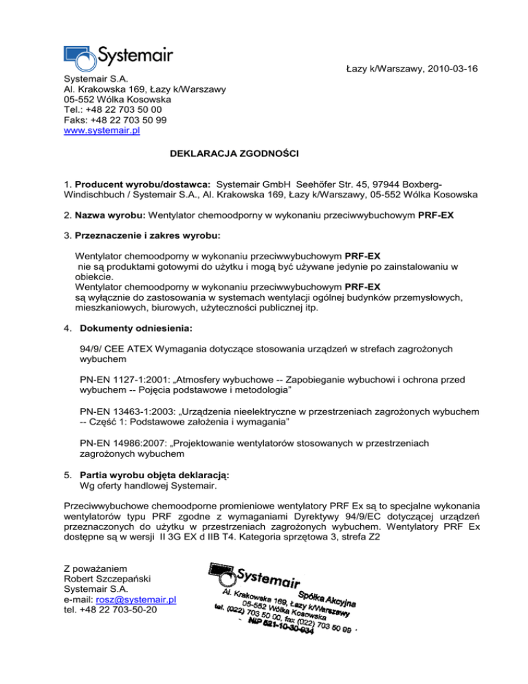 Łazy k/Warszawy, 2010-03-16 Systemair S.A. Al. Krakowska 169, Łazy k/Warszawy 05-552 Wólka Kosowska Tel.: +48 22 703 50 00 Faks: +48 22 703 50 99 www.systemair.pl DEKLARACJA ZGODNOŚCI 1. Producent wyrobu/dostawca: Systemair GmbH Seehöfer Str. 45, 97944 BoxbergWindischbuch / Systemair S.A., Al. Krakowska 169, Łazy k/Warszawy, 05-552 Wólka Kosowska 2. Nazwa wyrobu: Wentylator chemoodporny w wykonaniu przeciwwybuchowym PRF-EX 3. Przeznaczenie i zakres wyrobu: Wentylator chemoodporny w wykonaniu przeciwwybuchowym PRF-EX nie są produktami gotowymi do użytku i mogą być używane jedynie po zainstalowaniu w obiekcie. Wentylator chemoodporny w wykonaniu przeciwwybuchowym PRF-EX są wyłącznie do zastosowania w systemach wentylacji ogólnej budynków przemysłowych, mieszkaniowych, biurowych, użyteczności publicznej itp. 4. Dokumenty odniesienia: 94/9/ CEE ATEX Wymagania dotyczące stosowania urządzeń w strefach zagrożonych wybuchem PN-EN 1127-1:2001: „Atmosfery wybuchowe -- Zapobieganie wybuchowi i ochrona przed wybuchem -- Pojęcia podstawowe i metodologia” PN-EN 13463-1:2003: „Urządzenia nieelektryczne w przestrzeniach zagrożonych wybuchem -- Część 1: Podstawowe założenia i wymagania” PN-EN 14986:2007: „Projektowanie wentylatorów stosowanych w przestrzeniach zagrożonych wybuchem 5. Partia wyrobu objęta deklaracją: Wg oferty handlowej Systemair. Przeciwwybuchowe chemoodporne promieniowe wentylatory PRF Ex są to specjalne wykonania wentylatorów typu PRF zgodne z wymaganiami Dyrektywy 94/9/EC dotyczącej urządzeń przeznaczonych do użytku w przestrzeniach zagrożonych wybuchem. Wentylatory PRF Ex dostępne są w wersji II 3G EX d IIB T4. Kategoria sprzętowa 3, strefa Z2 Z poważaniem Robert Szczepański Systemair S.A. e-mail: [email protected] tel. +48 22 703-50-20