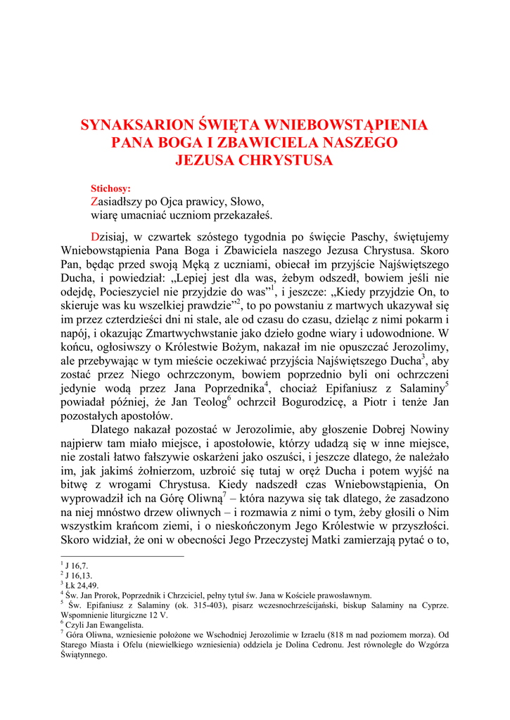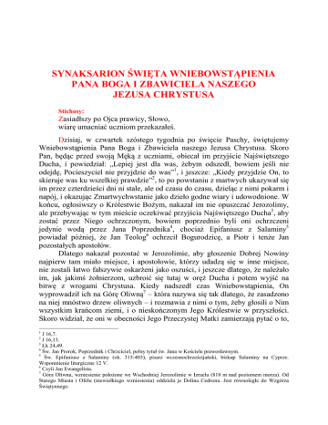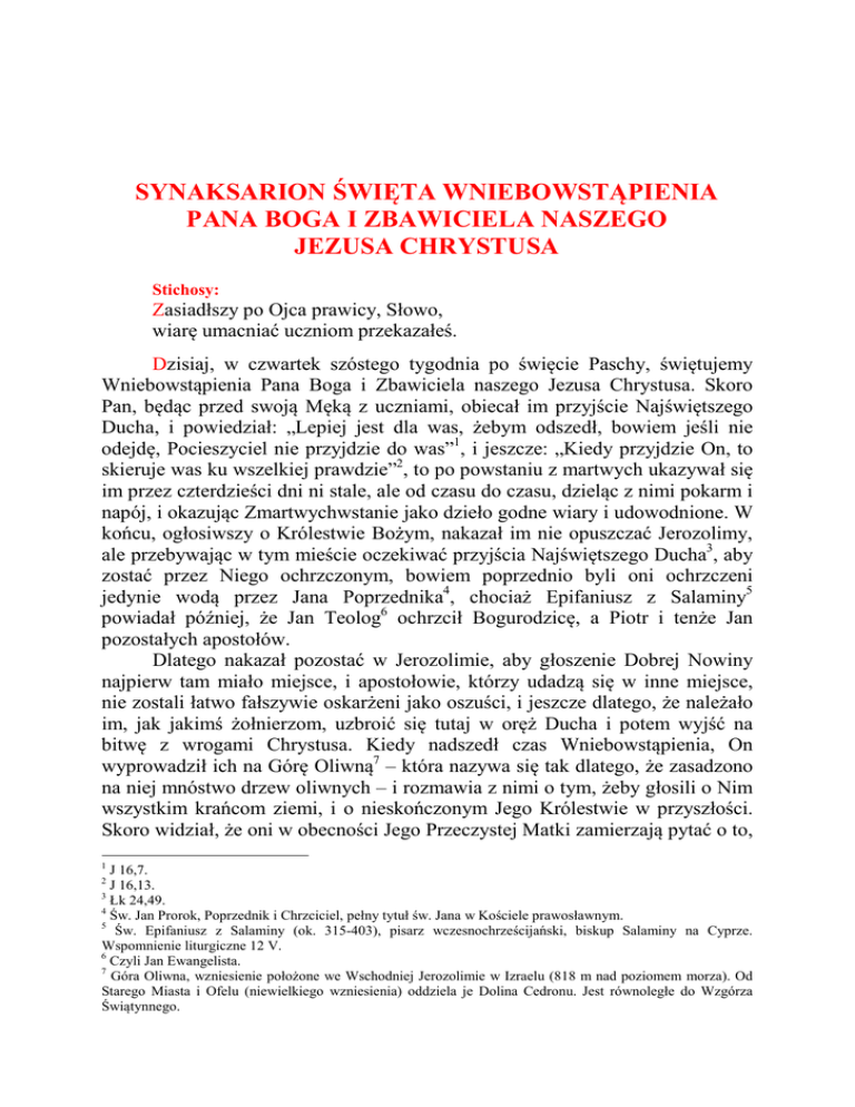 SYNAKSARION ŚWIĘTA WNIEBOWSTĄPIENIA PANA BOGA I ZBAWICIELA NASZEGO JEZUSA CHRYSTUSA Stichosy: Zasiadłszy po Ojca prawicy, Słowo, wiarę umacniać uczniom przekazałeś. Dzisiaj, w czwartek szóstego tygodnia po święcie Paschy, świętujemy Wniebowstąpienia Pana Boga i Zbawiciela naszego Jezusa Chrystusa. Skoro Pan, będąc przed swoją Męką z uczniami, obiecał im przyjście Najświętszego Ducha, i powiedział: „Lepiej jest dla was, żebym odszedł, bowiem jeśli nie odejdę, Pocieszyciel nie przyjdzie do was”1, i jeszcze: „Kiedy przyjdzie On, to skieruje was ku wszelkiej prawdzie”2, to po powstaniu z martwych ukazywał się im przez czterdzieści dni ni stale, ale od czasu do czasu, dzieląc z nimi pokarm i napój, i okazując Zmartwychwstanie jako dzieło godne wiary i udowodnione. W końcu, ogłosiwszy o Królestwie Bożym, nakazał im nie opuszczać Jerozolimy, ale przebywając w tym mieście oczekiwać przyjścia Najświętszego Ducha3, aby zostać przez Niego ochrzczonym, bowiem poprzednio byli oni ochrzczeni jedynie wodą przez Jana Poprzednika4, chociaż Epifaniusz z Salaminy5 powiadał później, że Jan Teolog6 ochrzcił Bogurodzicę, a Piotr i tenże Jan pozostałych apostołów. Dlatego nakazał pozostać w Jerozolimie, aby głoszenie Dobrej Nowiny najpierw tam miało miejsce, i apostołowie, którzy udadzą się w inne miejsce, nie zostali łatwo fałszywie oskarżeni jako oszuści, i jeszcze dlatego, że należało im, jak jakimś żołnierzom, uzbroić się tutaj w oręż Ducha i potem wyjść na bitwę z wrogami Chrystusa. Kiedy nadszedł czas Wniebowstąpienia, On wyprowadził ich na Górę Oliwną7 – która nazywa się tak dlatego, że zasadzono na niej mnóstwo drzew oliwnych – i rozmawia z nimi o tym, żeby głosili o Nim wszystkim krańcom ziemi, i o nieskończonym Jego Królestwie w przyszłości. Skoro widział, że oni w obecności Jego Przeczystej Matki zamierzają pytać o to, 1 J 16,7. J 16,13. 3 Łk 24,49. 4 Św. Jan Prorok, Poprzednik i Chrzciciel, pełny tytuł św. Jana w Kościele prawosławnym. 5 Św. Epifaniusz z Salaminy (ok. 315-403), pisarz wczesnochrześcijański, biskup Salaminy na Cyprze. Wspomnienie liturgiczne 12 V. 6 Czyli Jan Ewangelista. 7 Góra Oliwna, wzniesienie położone we Wschodniej Jerozolimie w Izraelu (818 m nad poziomem morza). Od Starego Miasta i Ofelu (niewielkiego wzniesienia) oddziela je Dolina Cedronu. Jest równoległe do Wzgórza Świątynnego. 2 co ma nastąpić, stawia przy nich aniołów, które wyjaśniają Jego wstąpienie na niebiosa. Oto na oczach uczniów został zabrany od nich, gdy okrył Go obłok, i tak w otoczeniu aniołów, nakazujących jeden drugiemu podnieść bramy niebios8, dziwiących się purpurze Jego ciała z powodu krwi9, wstąpił na niebo i zasiadł po prawicy Ojca10, przebóstwiony, i odważę się powiedzieć, uczyniwszy podobnym Bogu to samo ciało, przez które my po zlikwidowaniu dawnej wrogości pogodziliśmy się z Bogiem. Aniołowie natomiast, przybliżywszy się w ludzkich postaciach do apostołów, mówili: „Mężowie Galilejscy! Dlaczego stoicie dziwiąc się i patrząc na niebo? Ten, którego widzieliście z ciałem, Bóg Jezus, znowu przyjdzie tak samo, to znaczy z ciałem, ale jak poprzednio, w biedzie i milczeniu, a w wielkiej chwale i w otoczeniu aniołów, jak i teraz”11. Wtedy apostołowie przestawszy wpatrywać się w niebo, powrócili z Góry Oliwnej, bowiem znajduje się ona bardzo blisko Jerozolimy – dwa tysiące czterdzieści kroków – a to jest droga soboty12. Tak Prawo nakazało za czasów Mojżesza, ile kroków można przejść w sobotę, bowiem Namiot Spotkania był odległy od zgromadzenia Żydów o tyle właśnie kroków, a pozwalano tutaj przychodzić w sobotę dla pokłonu, ale nie wydłużać drogi, dlatego też nazwano tę drogę „sobotnią”13. Stąd też niektórzy zakładają, że Wniebowstąpienie Chrystusa miało miejsce w sobotę, a przecież jest to błąd. Apostołowie po powrocie weszli do Wieczernika, gdzie przebywali z niewiastami niosącymi wonności i z Matką Słowa, poświęcając cały czas postom, modlitwom i błaganiom, i oczekując, zgodnie z obietnicą, przyjścia Ducha Świętego14. Chryste Boże nasz, który wzniosłeś się w chwale, zmiłuj się nad nami. Amen. 8 Ps 23,7. Iz 63,2. 10 Mk 16,19. 11 Dz 1,11. 12 Dz 1,12. 13 Joz 3,4. 14 Dz 1,14. 9