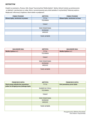 DETEKTYW Znajdź na wystawie „Picasso, Dali, Goya/ Tauromachia/ Walka byków” dzieła, których tytuły są zamieszczone w tabelach i porównaj je ze sobą. Która z prezentowanej pary dzieł podoba Ci się bardziej? Dokonaj wyboru. Większośd informacji znajdziesz obok dzieła w podpisach. PABLO PICASSO Głowa byka, zwrócona w prawo ARTYSTA TYTUŁ TECHNIKA PABLO PICASSO Głowa byka, zwrócona w lewo TEMAT ROK POWSTANIA ROZMIAR MIEJSCE TWÓJ WYBÓR SALVADOR DALI Walka byków nr 1 ARTYSTA TYTUŁ TECHNIKA SALVADOR DALI Walka byków nr 1 TEMAT ROK POWSTANIA ROZMIAR MIEJSCE TWÓJ WYBÓR FRANCISCO GOYA Dwie grupy pikadorów powalone jedna na drugiej przez jednego byka ARTYSTA TYTUŁ FRANCISCO GOYA Koń powalony przez byka NUMER W CYKLU TECHNIKA TEMAT ROK POWSTANIA ROZMIAR MIEJSCE TWÓJ WYBÓR Przygotowały: Elżbieta Kazańska Ewa Obara–Grączewska