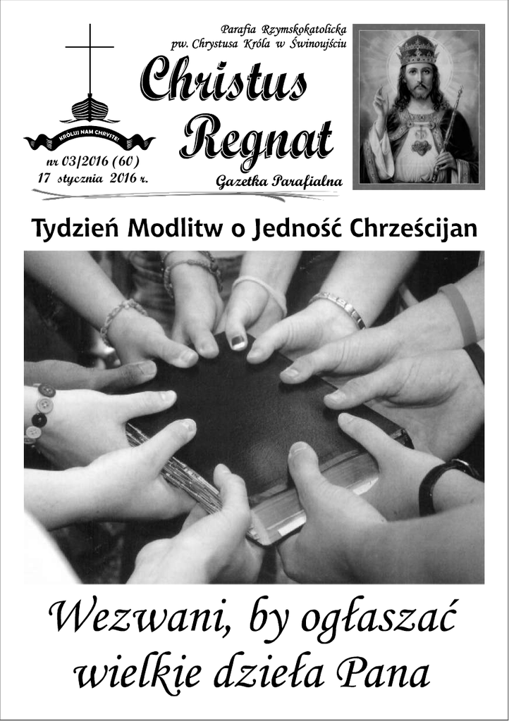 nr 03/2016 (60) 17 stycznia 2016 r. STYCZEŃ 17 niedziela STYCZEŃ 18 poniedziałek STYCZEŃ 19 wtorek STYCZEŃ 20 środa STYCZEŃ 21 czwartek II Niedziele Zwykła wspomnienia: Św. Antoniego (o); Jana (mn); Rozeliny (bł) „Wtedy Matka Jego powiedziała do sług: >>Zróbcie wszystko, cokolwiek wam powie<<”. Iż 62,1-5; 1 Kor 12,4-11; J 2,1-12 wspomnienia: Bł. Reginy Protmann (z); Małgorzaty Węgierskiej (kr) Żywe jest słowo Boże i skuteczne, zdolne osądzić pragnienia i myśli serca. 1 Sm 15, 16-23; Mk 2, 18-22 wspomnienia: Św. Józefa Sebastiana Pelczara (bp); Henryka (m); Kanuta (kr); Mariusza (m); Makarego (pust) To szabat został ustanowiony dla człowieka, a nie człowiek dla szabatu. Zatem Syn Człowieczy jest panem szabatu. 1 Sm 16, 1-13; Mk 2, 23-28 wspomnienia: Świętych męczenników Fabiana (p) i Sebastiana A do nich powiedział: >>Co wolno w szabat: uczynić coś dobrego czy coś złego? Życie ocalić czy zabić?<< Lecz oni milczeli. 1 Sm 17, 32-33. 37. 40-51; Mk 3, 1-6 wspomnienia: Św. Agnieszki, dziewicy i męczennicy Nawet duchy nieczyste, na Jego widok, padały przed Nim i wołały: «Ty jesteś Syn Boży» 1 Sm 18, 6-9; 19, 1-7; Mk 3, 7-12 STYCZEŃ 22 piątek STYCZEŃ 23 sobota 2 wspomnienia: Św. Wincentego (diak m.); Św. Wincentego Pallottiego (pr) I ustanowił Dwunastu, aby Mu towarzyszyli, by mógł wysyłać ich na głoszenie nauki, i by mieli władzę wypędzać złe duchy. 1 Sm 24, 3-21; Mk 3,13-19 wspomnienia: Błogosławionych męczenników Wincentego Lewoniuka i Towarzyszy; Ildefonsa (bp) Gdy to posłyszeli Jego bliscy, wybrali się, żeby Go powstrzymać. Mówiono bowiem: >>Odszedł od zmysłów.<< 2 Sm 1,1-4. 11-12. 19. 23-27; Mk 3, 20-21 Christus Regnat - 3/2016 Tydzień Modlitw o Jedność Chrześcijan został zaproponowany w 1908 r. przez ks. Paula Wattsona, założyciela wspólnoty Franciszkanów Pojednania. Od 1910 roku decyzją papieża św. Piusa X, modlitwy i nabożeństwa w tej intencji odbywają się w dniach 18 – 25 stycznia. Sobór Watykański II w Dekrecie o ekumenizmie Unitatis Redintegratio nalegał na tę modlitwę, potwierdzając "swą świadomość, że ten święty plan pojednania wszystkich Chrześcijan w jedności jednego i jedynego Kościoła Chrystusowego przekracza ludzkie siły i zdolności". Chrześcijaństwo jest obecnie najliczniejszą religią na świecie. Niestety, nie ma jedności i istnieją tysiące odłamów i wspólnot kościelnych. Według badań z chrześcijaństwem identyfikuje się blisko 32% ludności świata blisko 2,2 miliarda osób wśród których większość stanowią katolicy (ponad 50% wszystkich Chrześcijan) oraz protestanci (37% Chrześcijan). Dla wszystkich Chrześcijan wspólna jest wiara w jeden Kościół powszechny ustanowiony przez Jezusa, jako wspólnota ludzi wierzących i dążących do zbawienia. Katolicyzm, prawosławie i tradycyjne wyznania protestanckie, przyjmują nauczanie pierwszych siedmiu soborów powszechnych za wyznacznik przynależności do chrześcijaństwa. Chodzi przede wszystkim o wiarę w dwie natury Chrystusa: boską i ludzką, oraz o uznanie współistotności trzech Osób Boskich: Ojca, Syna i Ducha Świętego. W ramach Tygodnia odbywa się na całym świecie szereg konferencji, spotkań i nabożeństw organizowanych przez Rady Ekumeniczne, Konferencje Episkopatów i inne organy Kościołów różnych krajów. W polskim Tygodniu Modlitw o Jedność Chrześcijan udział biorą: Kościół Rzymskokatolicki, Polski Autokefaliczny Kościół Prawosławny, Kościół Ewangelicko-Augsburski, Kościół Ewangelicko-Reformowany, Kościół Ewangelicko-Metodystyczny, Kościół Polskokatolicki, Kościół Starokatolicki Mariawitów, Kościół Chrześcijan Baptystów, Ukraińska Cerkiew Greckokatolicka i Kościół Zielonoświątkowy. Christus Regnat - 3/2016 3 1. Dzisiejsza Ewangelia ukazuje nam Jezusa dokonującego pierwszego cudu w Kanie Galilejskiej, ukazuje nam Jezusa objawiającego swoją chwałę i moc. Uczniowie, którzy byli świadkami tego znaku, uwierzyli w Niego. A my? Czy jesteśmy gotowi uwierzyć Jezusowi, który swoją moc i chwałę objawia w swoim Kościele, zwłaszcza w sakramentach świętych? Podejmijmy refleksję nad tymi pytaniami w ciągu tego tygodnia. 2. Dzisiaj obchodzimy również Dzień Judaizmu. Pamiętajmy w naszych modlitwach o narodzie izraelskim, z którym łączy nas postać Abrahama i innych patriarchów Starego Testamentu, a przede wszystkim księga Pisma Świętego. 3. Od jutra do 25 stycznia trwać będzie Tydzień Powszechnej Modlitwy o Jedność Chrześcijan. O jedność wśród swoich uczniów i wyznawców modlił się Pan Jezus przed swoją męką i śmiercią. Niech ta modlitwa nieustannie trwa, bo podziały wśród chrześcijan to rana, która boli i osłabia świadectwo naszej wiary. 4. Dobiegają końca kolędowe odwiedziny w naszej parafii. W tym tygodniu kolęda według następującego porządku: ź 17. 01 (Niedziela): ul. Witosa nr 10, 3, 5, 9, ul. Staszica - numery nieparzyste ź 18. 01 (Poniedziałek): ul. Staszica - numery parzyste ź 19. 01 (Wtorek): ul. Marynarzy, ul. Rybaki 1 – 7 ź 20. 01 (Środa): ul. Rybaki 8 – 25. Jeżeli ktoś nie mógł przyjąć kolędy w wyznaczonym czasie to prosimy zgłosić na dodatkowy termin, który będzie w czwartek i piątek od godz. 16.00. Zgłaszać prosimy w zakrystii lub telefonicznie. 5. W piątek od godz. 15.00 Godzina Miłosierdzia i Adoracja Najświętszego Sakramentu. 6. W sobotę o godz. 7.00 Godzinki do NMP a po Mszy św, wieczornej adoracja do godz. 20.00 z indywidualnym błogosławieństwem Najświętszym Sakramentem 7. W przyszłą niedzielę po Mszy św. o godz. 11.30 spotkanie z rodzicami dzieci pierwszokomunijnych. 8. Daru zdrowia i obfitości łask Bożych przyzywamy dla solenizantów i jubilatów tygodnia. 4 Christus Regnat - 3/2016 Christus Regnat - 3/2016 5 STYCZEŃ 17 niedziela STYCZEŃ 18 poniedziałek STYCZEŃ 19 wtorek STYCZEŃ 20 środa STYCZEŃ 21 czwarte