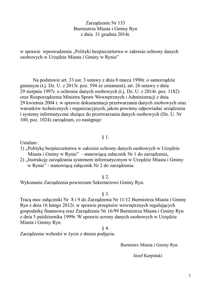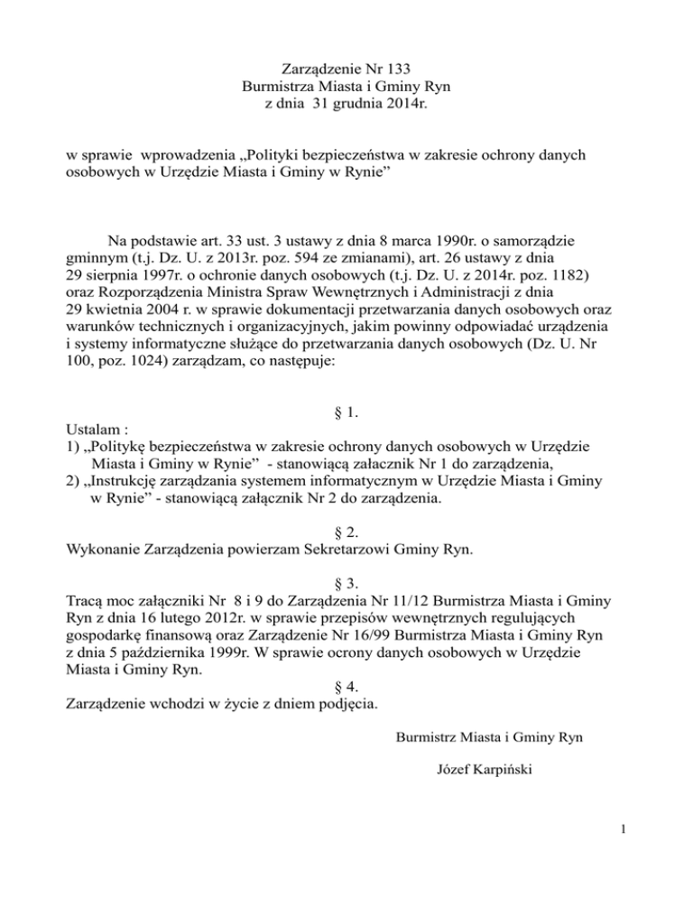 Zarządzenie Nr 133 Burmistrza Miasta i Gminy Ryn z dnia 31 grudnia 2014r. w sprawie wprowadzenia „Polityki bezpieczeństwa w zakresie ochrony danych osobowych w Urzędzie Miasta i Gminy w Rynie” Na podstawie art. 33 ust. 3 ustawy z dnia 8 marca 1990r. o samorządzie gminnym (t.j. Dz. U. z 2013r. poz. 594 ze zmianami), art. 26 ustawy z dnia 29 sierpnia 1997r. o ochronie danych osobowych (t.j. Dz. U. z 2014r. poz. 1182) oraz Rozporządzenia Ministra Spraw Wewnętrznych i Administracji z dnia 29 kwietnia 2004 r. w sprawie dokumentacji przetwarzania danych osobowych oraz warunków technicznych i organizacyjnych, jakim powinny odpowiadać urządzenia i systemy informatyczne służące do przetwarzania danych osobowych (Dz. U. Nr 100, poz. 1024) zarządzam, co następuje: § 1. Ustalam : 1) „Politykę bezpieczeństwa w zakresie ochrony danych osobowych w Urzędzie Miasta i Gminy w Rynie” - stanowiącą załacznik Nr 1 do zarządzenia, 2) „Instrukcję zarządzania systemem informatycznym w Urzędzie Miasta i Gminy w Rynie” - stanowiącą załącznik Nr 2 do zarządzenia. § 2. Wykonanie Zarządzenia powierzam Sekretarzowi Gminy Ryn. § 3. Tracą moc załączniki Nr 8 i 9 do Zarządzenia Nr 11/12 Burmistrza Miasta i Gminy Ryn z dnia 16 lutego 2012r. w sprawie przepisów wewnętrznych regulujących gospodarkę finansową oraz Zarządzenie Nr 16/99 Burmistrza Miasta i Gminy Ryn z dnia 5 października 1999r. W sprawie ocrony danych osobowych w Urzędzie Miasta i Gminy Ryn. § 4. Zarządzenie wchodzi w życie z dniem podjęcia. Burmistrz Miasta i Gminy Ryn Józef Karpiński 1 Załącznik Nr 1 do Zarządzenia Nr 133 Burmistrza Miasta i Gminy Ryn z dnia 31.12.2014r. POLITYKA BEZPIECZEŃSTWA w zakresie ochrony danych osobowych w Urzędzie Miasta i Gminy Ryn 2 R RO OZ ZD DZ ZIIA AŁ Ł 11 Część ogólna §1 Polityka bezpieczeństwa w zakresie ochrony danych osobowych w Urzędzie Miasta i Gminy w Rynie zwana dalej Polityką Bezpieczeństwa określa sposób zabezpieczania oraz przetwarzania danych osobowych. §2 Ze względu na wagę problemów związanych z ochroną prawa do prywatności, a w szczególności prawa osób fizycznych powierzających swoje dane osobowe, do właściwej i skutecznej ochrony tych danych należy: 1) podjąć wszelkie niezbędne działania dla ochrony praw i usprawiedliwionych interesów jednostki związane z bezpieczeństwem danych osobowych, 2) podnosić świadomość oraz kwalifikacje osób przetwarzających dane osobowe w Urzędzie Miasta i Gminy w Rynie w zakresie problematyki bezpieczeństwa tych danych, 3) traktować obowiązki przy przetwarzaniu danych osobowych, przez osoby zatrudnione w Urzędzie Miasta i Gminy w Rynie, jako należące do kategorii podstawowych obowiązków pracowniczych, 4) stałe doskonalić i rozwijać nowoczesne metody przetwarzania danych oraz podejmować i rozwijać organizacyjne, techniczne i informatyczne środki ochrony tych danych tak, aby skutecznie zapobiegać zagrożeniom związanym z: aa)) nieautoryzowanym dostępem, wykradaniem bądź niszczeniem danych przez wszelkiego rodzaju mechanizmy i programy szpiegujące, wirusy komputerowe, konie trojańskie i inne niepożądane oprogramowanie, bb)) dostępem do nieautoryzowanych i niezabezpieczonych stron internetowych, mogących posiadać skrypty pozwalające wykradać zasoby komputera, który się z nimi łączy, cc)) atakami z sieci uniemożliwiającymi przetwarzanie danych (ataki typu DOS na serwer/serwery) oraz spamem, dd)) użytkowaniem oprogramowania do wymiany plików, mogącym służyć do łatwego skopiowania danych poza Urząd, ee)) możliwością niekontrolowanego kopiowania danych na zewnętrzne, nośniki, ff)) działaniami mającymi na celu zaburzenie integralności danych, w celu uniemożliwienia ich przetwarzania lub osiągnięcia korzyści, gg)) lekceważeniem zasad ochrony danych polegającym na pozostawianiu pomieszczenia lub stanowiska pracy bez zabezpieczenia, hh)) brakiem świadomości niebezpieczeństwa przy dopuszczaniu osób postronnych do swojego stanowiska pracy, ii)) kradzieżą sprzętu lub nośników z danymi, jj)) kradzieżami tożsamości umożliwiającymi podszywanie się pod inną osobę, 3 kk)) przekazywaniem niezabezpieczonego sprzętu komputerowego do serwisu zewnętrznego i innym zagrożeniom mogącym wystąpić w przyszłości w związku z rozwojem technik i metod przetwarzania danych. 4 R RO OZ ZD DZ ZIIA AŁ Ł 22 Definicje §3 Użyte w niniejszej Polityce sformułowania lub skróty oznaczają: 1) Urząd - Urząd Miasta i Gminy w Rynie; 2) Burmistrz - Burmistrza Miasta i Gminy Ryn; 3) komórka organizacyjna - wyodrębniony element struktury Urzędu realizujący zadania określone w niniejszym Regulaminie, w szczególności: referat lub samodzielne stanowisko; 4) ADO - Administratora Danych Osobowych; 5) ABI - osoba wyznaczona przez Administratora Danych Osobowych do pełnienia funkcji Administratora Bezpieczeństwa Informacji; 6) ASI - osoba wyznaczona przez Administratora Danych Osobowych do pełnienia funkcji Administratora Systemu Informatycznego Urzędu; 7) użytkownik danych – każdy pracownik, który wykonując czynności służbowe, przetwarzający dane osobowe, tzn. wykonujący na nich operacje takie jak: zbieranie, utrwalanie, przechowywanie, opracowywanie, zmienianie, udostępnianie, usuwanie; 8) osoba upoważniona – osoba posiadająca upoważnienie wydane przez ABI lub osobę uprawnioną przez niego i dopuszczona jako użytkownik do przetwarzania danych osobowych w systemie informatycznym w zakresie wskazanym w upoważnieniu; 9) osoba uprawniona – osoba posiadająca upoważnienie wydane przez ABI do wykonywania w jego imieniu określonych czynności; 10) sieć telekomunikacyjna – sieć o definicji zawartej w Ustawie z dnia 16 lipca 2004 r. – Prawo telekomunikacyjne (Dz. U. z 2004r. Nr 171, poz. 1800, z późniejszymi zmianami); 11) sieć lokalna – połączenie funkcjonujących w Urzędzie systemów informatycznych i st