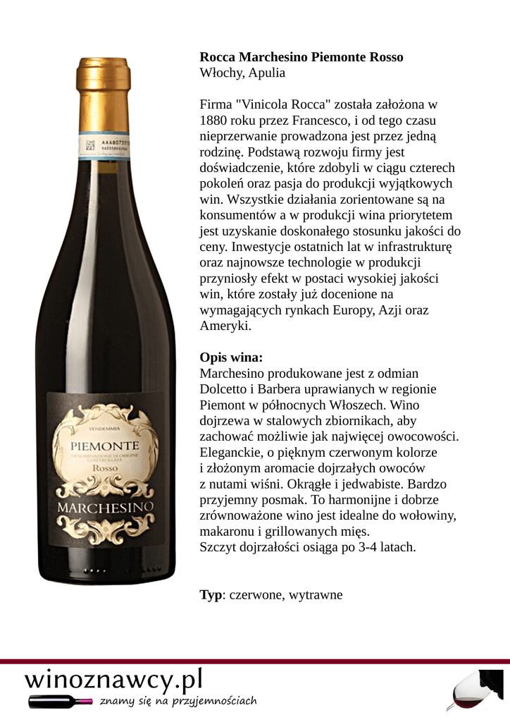 Rocca Marchesino Piemonte Rosso Włochy, Apulia Firma "Vinicola Rocca" została założona w 1880 roku przez Francesco, i od tego czasu nieprzerwanie prowadzona jest przez jedną rodzinę. Podstawą rozwoju firmy jest doświadczenie, które zdobyli w ciągu czterech pokoleń oraz pasja do produkcji wyjątkowych win. Wszystkie działania zorientowane są na konsumentów a w produkcji wina priorytetem jest uzyskanie doskonałego stosunku jakości do ceny. Inwestycje ostatnich lat w infrastrukturę oraz najnowsze technologie w produkcji przyniosły efekt w postaci wysokiej jakości win, które zostały już docenione na wymagających rynkach Europy, Azji oraz Ameryki. Opis wina: Marchesino produkowane jest z odmian Dolcetto i Barbera uprawianych w regionie Piemont w północnych Włoszech. Wino dojrzewa w stalowych zbiornikach, aby zachować możliwie jak najwięcej owocowości. Eleganckie, o pięknym czerwonym kolorze i złożonym aromacie dojrzałych owoców z nutami wiśni. Okrągłe i jedwabiste. Bardzo przyjemny posmak. To harmonijne i dobrze zrównoważone wino jest idealne do wołowiny, makaronu i grillowanych mięs. Szczyt dojrzałości osiąga po 3-4 latach. Typ: czerwone, wytrawne