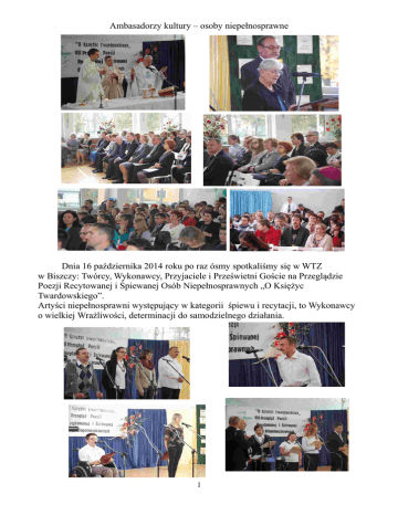 Ambasadorzy kultury – osoby niepełnosprawne Dnia 16 października 2014 roku po raz ósmy spotkaliśmy się w WTZ w Biszczy: Twórcy, Wykonawcy, Przyjaciele i Prześwietni Goście na Przeglądzie Poezji Recytowanej i Śpiewanej Osób Niepełnosprawnych „O Księżyc Twardowskiego”. Artyści niepełnosprawni występujący w kategorii śpiewu i recytacji, to Wykonawcy o wielkiej Wrażliwości, determinacji do samodzielnego działania. 1 Przegląd to wyrównywanie szans i oczekiwanie na to, że jest się rozpoznawalnym, potrzebnym, zapamiętanym a założenia życzliwej rywalizacji dają pewność na wyróżnienie. Wytrwała i ciężka, sprawiająca często wiele trudności praca w przygotowaniu się do wystąpienia na Przeglądzie, sam Przegląd wyniosła do rangi wielkiej Uroczystości i wielu chce brać w nim udział. Atmosfery u nas panującej nie da się opowiedzieć słowami, tak jak artystów niepełnosprawnych się nie opisze, na Przeglądzie trzeba być i brać w nim udział. Było z nami 19 Jednostek Osób Niepełnosprawnych, Opiekunowie, Kochani Rodzice, Prześwietni Goście z Kraju i zagranicy: Przewodniczący Związku Osób Niepełnosprawnych i Inwalidów Ukrainy, Pan Leonid Tarasenko i jego zastępca Pani Oksana Kilianowska, Ekscelencja Biskup dr hab. ks Mariusz Leszczyński, Pani Joanna Urban reprezentująca Senat Rzeczypospolitej Polskiej, Pani Genowefa Tokarska Poseł na Sejm Rzeczypospolitej Polskiej, Pan Jerzy Chróścikowski Senator Rzeczypospolitej Polskiej, Pani Teresa Hernik Prezes Zarządu Państwowego Funduszu Rehabilitacji Osób Niepełnosprawnych, Pan Jacek Grabek reprezentujący Wojewodę Lubelskiego, Pan Marian Jaworski reprezentujący Marszałka Województwa Lubelskiego, Pan Zbigniew Pyczko Wójt Gminy Biszcza, Pani Wanda Żychowska z-ca Wójta Gminy Potok Górny, Pani Janina Bazan Prezes Banku Spółdzielczego w Biszczy, Pani Monika Zając reprezentująca Dyrektora PCPR w Biłgoraju, Przedstawiciele Rady Fundacji Otwórzmy Swoje Serca, Pani prof. dr hab. Elżbieta Korobowicz, Państwo Barbara i Tadeusz Łańcuccy, Pani Elżbieta Blicharz Dyrektor Zespołu Szkół w Biszczy, Ksiądz proboszcz Stanisław Bełz, ksiądz Karol Jędruszczak, ksiądz Łukasz Kolasa, ksiądz Krystian Bordzań dyrektor KR Zamość, Panie Stanisława Budzyńska, Elżbieta Wryszcz Urząd gminy Księżpol, Pan Piotr Cichorz dyrektor GOKSiR w Biszczy i wielu Przyjaciół, Rodzina moja oraz nasze media: Katolickie Radio Zamość, TVP Lublin, Gazeta Biłgorajska. 2 Nie można nie napisać o komisji Sercem Oceniającej w osobach Przewodniczący Pan Tadeusz Kuna, prof. dr hab. Wanda Kociuba, Ksiądz Kanclerz Bronisław Bucki, wybierając Zespoły i indywidualnych Wykonawców do wyróżnień miała ogromne kłopoty, bo nie mogła wyróżnić Wszystkich. Prezenty i nagrody na wyróżnienia otrzymaliśmy: -Wielce Szanowna Pani Anna Komorowska przyznała dyplomy gratulacyjne dla Wykonawców: Jadwigi Mojak, Marioli Matuszak, Mariana Kniaź oraz pracowników: Elżbiety Kulasza, Kamili Solak, Marka Krzeszycha. -Senat Rzeczypospolitej Polskiej przyznał mini wieże Samsung MM-E 330D i inne upominki, które były wręczone przez Panią Joannę Urban. 3 -W ramach przyznanych środków finansowych z Urzędu Marszałkowskiego w Lublinie wyróżnienia wręczali Prześwietni Goście jak: Panie Joanna Urban, Teresa Hernik, Genowefa Tokarska, Panowie: Zbigniew Pyczko, Jacek Grabek, Jerzy Chróścikowski a otrzymali: WTZ w Józefowie, WTZ „Krok za krokiem” w Zamościu, WTZ w Biszczy, DPS w Żułowie, DPS ss. Misjonarek Maryi w Zamościu, DPS w Ruskich Piaskach, DPS w Matczynie, WTZ w Chełmie, ŚDS w Krasnymstawie, Stowarzyszenie na Rzecz Dzieci i Młodzieży Niepełnosprawnej Ruchowo w Lublinie, DPS w Krasnymstawie, Zespół Teatralny „Emmanuel” pod kier. p. Żanny Goraj z Ukrainy; indywidualnie: Bożena Chacia-ŚDS w Tarnogrodzie, Grzegorz Łokaj-WTZ w Biszczy, Maria Choma-DPS w Żułowie, Alina Puk-Stowarzyszenie na Rzecz Osób ze Stwardnieniem Rozsianym w Zamościu, Józef Nizio-WTZ w Biszczy. 4 Jak co roku oczekujemy na koncert naszych Wielkich Przyjaciół Panów Krzysztofa i Wojciecha Cugowskich, którzy dla Wszystkich uczestniczących w Przeglądzie na zakończenie dają Koncert. Nikt z Uczestników i Gości nie pozostał bez rannego i obiadowego posiłku, co roku wspiera nas i zadbał o Wszystkich Wielce Szanowny Pan Tadeusz Badach Prezes Okręgowej Spółdzielni Mleczarskiej w Krasnymstawie, obiad jak co roku sponsorował Pan Zbigniew Pyczko Wójt Gminy Biszcza. Apetyty w miarę jedzenia rosną, a szczególnie, gdy na stołach pojawiło się smakowite ciasto i olbrzymi tort od Państwa Teresy, Czesława, Anny i Kamila Obszyńskich. Pozwalamy sobie na napisanie tych refleksji, zdajemy sobie sprawę z tego, że Oni – Osoby Niepełnosprawne dodają nam odwagi do pochylenia się nad tą trudną i ciężką pracą, jaką jest przygotowanie się do występu i sam występ przed tak wymagającą publicznością osób niepełnosprawnych, dziękujemy im za siłę życia zwracania uwagi na wszelkie niedogodności. 5