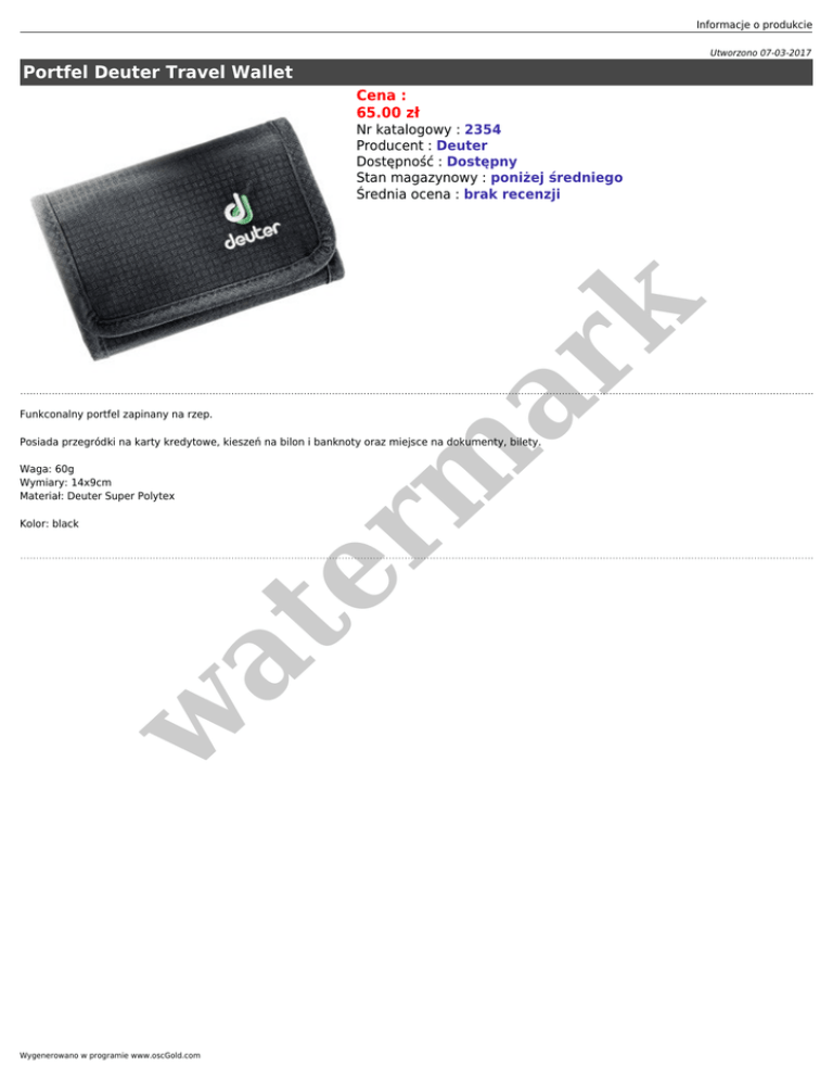 Informacje o produkcie Utworzono 07-03-2017 Portfel Deuter Travel Wallet Cena : 65.00 zł Funkconalny portfel zapinany na rzep. er m ar k Nr katalogowy : 2354 Producent : Deuter Dostępność : Dostępny Stan magazynowy : poniżej średniego Średnia ocena : brak recenzji Posiada przegródki na karty kredytowe, kieszeń na bilon i banknoty oraz miejsce na dokumenty, bilety. Waga: 60g Wymiary: 14x9cm Materiał: Deuter Super Polytex w at Kolor: black Wygenerowano w programie www.oscGold.com