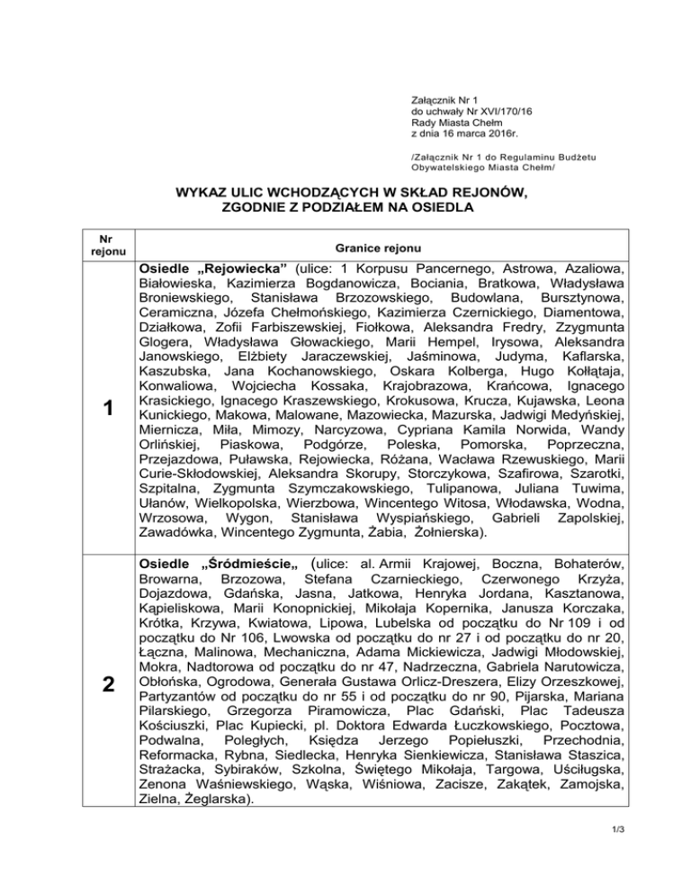 Załącznik Nr 1 do uchwały Nr XVI/170/16 Rady Miasta Chełm z dnia 16 marca 2016r. /Załącznik Nr 1 do Regulaminu Budżetu Obywatelskiego Miasta Chełm/ WYKAZ ULIC WCHODZĄCYCH W SKŁAD REJONÓW, ZGODNIE Z PODZIAŁEM NA OSIEDLA Nr rejonu 1 2 Granice rejonu Osiedle „Rejowiecka” (ulice: 1 Korpusu Pancernego, Astrowa, Azaliowa, Białowieska, Kazimierza Bogdanowicza, Bociania, Bratkowa, Władysława Broniewskiego, Stanisława Brzozowskiego, Budowlana, Bursztynowa, Ceramiczna, Józefa Chełmońskiego, Kazimierza Czernickiego, Diamentowa, Działkowa, Zofii Farbiszewskiej, Fiołkowa, Aleksandra Fredry, Zzygmunta Glogera, Władysława Głowackiego, Marii Hempel, Irysowa, Aleksandra Janowskiego, Elżbiety Jaraczewskiej, Jaśminowa, Judyma, Kaflarska, Kaszubska, Jana Kochanowskiego, Oskara Kolberga, Hugo Kołłątaja, Konwaliowa, Wojciecha Kossaka, Krajobrazowa, Krańcowa, Ignacego Krasickiego, Ignacego Kraszewskiego, Krokusowa, Krucza, Kujawska, Leona Kunickiego, Makowa, Malowane, Mazowiecka, Mazurska, Jadwigi Medyńskiej, Miernicza, Miła, Mimozy, Narcyzowa, Cypriana Kamila Norwida, Wandy Orlińskiej, Piaskowa, Podgórze, Poleska, Pomorska, Poprzeczna, Przejazdowa, Puławska, Rejowiecka, Różana, Wacława Rzewuskiego, Marii Curie-Skłodowskiej, Aleksandra Skorupy, Storczykowa, Szafirowa, Szarotki, Szpitalna, Zygmunta Szymczakowskiego, Tulipanowa, Juliana Tuwima, Ułanów, Wielkopolska, Wierzbowa, Wincentego Witosa, Włodawska, Wodna, Wrzosowa, Wygon, Stanisława Wyspiańskiego, Gabrieli Zapolskiej, Zawadówka, Wincentego Zygmunta, Żabia, Żołnierska). Osiedle „Śródmieście„ (ulice: al. Armii Krajowej, Boczna, Bohaterów, Browarna, Brzozowa, Stefana Czarnieckiego, Czerwonego Krzyża, Dojazdowa, Gdańska, Jasna, Jatkowa, Henryka Jordana, Kasztanowa, Kąpieliskowa, Marii Konopnickiej, Mikołaja Kopernika, Janusza Korczaka, Krótka, Krzywa, Kwiatowa, Lipowa, Lubelska od początku do Nr 109 i od początku do Nr 106, Lwowska od początku do nr 27 i od początku do nr 20, Łączna, Malinowa, Mechaniczna, Adama Mickiewicza, Jadwigi Młodowskiej, Mokra, Nadtorowa od początku do nr 47, Nadrzeczna, Gabriela Narutowicza, Obłońska, Ogrodowa, Generała Gustawa Orlicz-Dreszera, Elizy Orzeszkowej, Partyzantów od początku do nr 55 i od początku do nr 90, Pijarska, Mariana Pilarskiego, Grzegorza Piramowicza, Plac Gdański, Plac Tadeusza Kościuszki, Plac Kupiecki, pl. Doktora Edwarda Łuczkowskiego, Pocztowa, Podwalna, Poległych, Księdza Jerzego Popiełuszki, Przechodnia, Reformacka, Rybna, Siedlecka, Henryka Sienkiewicza, Stanisława Staszica, Strażacka, Sybiraków, Szkolna, Świętego Mikołaja, Targowa, Uściługska, Zenona Waśniewskiego, Wąska, Wiśniowa, Zacisze, Zakątek, Zamojska, Zielna, Żeglarska). 1/3 3 4 5 6 7 Osiedle „Zachód„ (ulice: Generała Władysława Andersa, Bednarska, Gen. Zygmunta Bohusz-Szyszko, Gen. Tadeusza Bór-Komorowskiego, Chłodna, Janówka, Gen. Ludwika Kmicic-Skrzyńskiego, Koszarowa, Kowalska, Legionów Polskich, Lubelska od nr 106a do końca i od nr 111 do końca, Generała Stanisława Maczka, Majdan, Metalowa od nr 11 do końca i od nr 48 do końca, Młynarska, Nadtorowa od nr 49 do końca i od nr 2 do końca, Niska, Gen. Leopolda Okulickiego, Piekarska, Piwna, Plac im. Jana Pawła II, Północna, Generała Stanisława Skalskiego, Synów Pułku, Szarych Szeregów, Trubakowska, Zachodnia, Złota, Związku Strzeleckiego, Źródlana). Osiedle „Słoneczne” (ulice: 15 sierpnia, Adama Asnyka, Bolesława Chrobrego, Dąbrówki, Józefa Elsnera, Kazimierza Wielkiego, Władysława Jagiełły, Jana III Sobieskiego, Mieczysława Karłowicza, Karola Kurpińskiego, Witolda Lutosławskiego, Lwowska od nr 22 do końca i od nr 33 do końca, Łabędzia, Metalowa od początku do nr 9 i od początku do nr 46, Mieszka I, Feliksa Nowowiejskiego, Orląt Lwowskich, Polna, Pszenna, Marii Rodziewiczówny, Rusałki, Skowronkowa, Słowicza, Ireny Stanisławskiej, Szpakowa, dr Barbary Sztembis, Karola Szymanowskiego, Św. Jadwigi Królowej, Henryka Wieniawskiego, Bolesława Wirskiego, Maryli Wolskiej, Dr Stefana Żarnowskiego, Stanisława Żółkiewskiego, Żurawia). Osiedle „XXX-lecia”(ulice: Aleja I Armii Wojska Polskiego, Droga Męczenników, Generała Stefana Grota-Roweckiego, Lwowska B, ks. Marcelego Mrozka, Nowy Świat, Powstańców Warszawy). Osiedle „Działki” (ulice: Krzysztofa Kamila Baczyńskiego, Józefa Bema, Księdza Zygfryda Berezeckiego, Botaniczna, Braci Gierymskich, Jana Brzechwy, Cisowa, Jarosława Dąbrowskiego, Gajowa, Górna, Artura Grottgera, Grunwaldzka, Hrubieszowska od nr 30 do końca i od nr 25 do końca, Jałowcowa, Kazimierza Janczykowskiego, Jaworowa, Kazimierza – Andrzeja Jaworskiego, Jesienna, Jodłowa, Jana Kilińskiego, Klonowa, Eugeniusza Kornasa, Kosynierów, Generała Mariana Langiewicza, Leśna, Letnia, Litewska, Lotnicza, Łowiecka, Jana Matejki, Modrzewiowa, Ignacego Mościckiego, Myśliwska, Niecała, Ogrodnicza, Ignacego Paderewskiego, Parkowa, Partyzantów od nr 61 do końca i od nr 94 do końca, Piastowska, Piękna, Emilii Plater, Podborcze, Pogodna, Południowa, Bolesława Prusa, Pszczela, Racławicka, Tadeusza Reytana, Generała Władysława Sikorskiego, Słoneczna, ks. I.Skorupki, Sosnowa, Generała Józefa Sowińskiego, Spacerowa, Henryka Sucharskiego, Szczęśliwa, Świerkowa, Tęczowa, Topolowa, Romualda Traugutta, Urocza, Wiosenna, Wolwinów, Józefa Wybickiego, Prymasa Stefana Wyszyńskiego, Zimowa, Stefana Żeromskiego). Osiedle „Kościuszki” (ulice: Aleja 3-go Maja, Bazylany, Księcia Adama Kazimierza Czartoryskiego, Stanisława Małachowskiego, Juliana Ursyna Niemcewicza, Połaniecka, Księcia Józefa Poniatowskiego, Ignacego i Stanisława Potockich, Sejmu Czteroletniego, Tuzinek, Henryka Wiercieńskiego, Wojsławicka, Wolności) 2/3 8 9 10 Osiedle „Dyrekcja Dolna” (ulice: 1 Pułku Szwoleżerów – strona nieparzysta, 11 Listopada Nr 1, 3 i 5, al. Marszałka Józefa Piłsudskiego, Aleja Przyjaźni, 