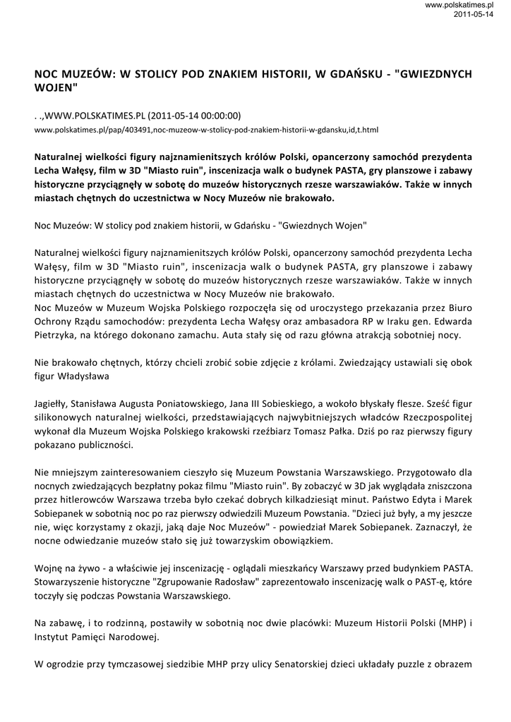 www.polskatimes.pl 2011-05-14 NOC MUZEÓW: W STOLICY POD ZNAKIEM HISTORII, W GDAŃSKU - "GWIEZDNYCH WOJEN" . .,WWW.POLSKATIMES.PL (2011-05-14 00:00:00) www.polskatimes.pl/pap/403491,noc-muzeow-w-stolicy-pod-znakiem-historii-w-gdansku,id,t.html Naturalnej wielkości figury najznamienitszych królów Polski, opancerzony samochód prezydenta Lecha Wałęsy, film w 3D "Miasto ruin", inscenizacja walk o budynek PASTA, gry planszowe i zabawy historyczne przyciągnęły w sobotę do muzeów historycznych rzesze warszawiaków. Także w innych miastach chętnych do uczestnictwa w Nocy Muzeów nie brakowało. Noc Muzeów: W stolicy pod znakiem historii, w Gdańsku - "Gwiezdnych Wojen" Naturalnej wielkości figury najznamienitszych królów Polski, opancerzony samochód prezydenta Lecha Wałęsy, film w 3D "Miasto ruin", inscenizacja walk o budynek PASTA, gry planszowe i zabawy historyczne przyciągnęły w sobotę do muzeów historycznych rzesze warszawiaków. Także w innych miastach chętnych do uczestnictwa w Nocy Muzeów nie brakowało. Noc Muzeów w Muzeum Wojska Polskiego rozpoczęła się od uroczystego przekazania przez Biuro Ochrony Rządu samochodów: prezydenta Lecha Wałęsy oraz ambasadora RP w Iraku gen. Edwarda Pietrzyka, na którego dokonano zamachu. Auta stały się od razu główna atrakcją sobotniej nocy. Nie brakowało chętnych, którzy chcieli zrobić sobie zdjęcie z królami. Zwiedzający ustawiali się obok figur Władysława Jagiełły, Stanisława Augusta Poniatowskiego, Jana III Sobieskiego, a wokoło błyskały flesze. Sześć figur silikonowych naturalnej wielkości, przedstawiających najwybitniejszych władców Rzeczpospolitej wykonał dla Muzeum Wojska Polskiego krakowski rzeźbiarz Tomasz Pałka. Dziś po raz pierwszy figury pokazano publiczności. Nie mniejszym zainteresowaniem cieszyło się Muzeum Powstania Warszawskiego. Przygotowało dla nocnych zwiedzających bezpłatny pokaz filmu "Miasto ruin". By zobaczyć w 3D jak wyglądała zniszczona przez hitlerowców Warszawa trzeba było czekać dobrych kilkadziesiąt minut. Państwo Edyta i Marek Sobiepanek w sobotnią noc po raz pierwszy odwiedzili Muzeum Powstania. "Dzieci już były, a my jeszcze nie, więc korzystamy z okazji, jaką daje Noc Muzeów" - powiedział Marek Sobiepanek. Zaznaczył, że nocne odwiedzanie muzeów stało się już towarzyskim obowiązkiem. Wojnę na żywo - a właściwie jej inscenizację - oglądali mieszkańcy Warszawy przed budynkiem PASTA. Stowarzyszenie historyczne "Zgrupowanie Radosław" zaprezentowało inscenizację walk o PAST-ę, które toczyły się podczas Powstania Warszawskiego. Na zabawę, i to rodzinną, postawiły w sobotnią noc dwie placówki: Muzeum Historii Polski (MHP) i Instytut Pamięci Narodowej. W ogrodzie przy tymczasowej siedzibie MHP przy ulicy Senatorskiej dzieci układały puzzle z obrazem www.polskatimes.pl 2011-05-14 Canaletta "Elekcja Stanisława Augusta". Dla trochę starszych uczestników zabawy była gra komputerowa "Osamotnieni". Nocny Festiwal Planszowych Gier Historycznych zorganizowało Biuro Edukacji Publicznej IPN. W placówce nazywającej się "Przystanek historia" na dobrą rozrywkę mogli liczyć początkujący, jak i bardziej doświadczeni miłośnicy gier. CZYTAJ TEŻ JAK WYGLĄDAŁA NOC MUZEÓW W GDAŃSKU Tagi: Noc Muzeów , Noc Muzeów Warszawa , zdjęcia Noc Muzeów , Noc Muzeów Polska , Noc Muzeów Gdańsk