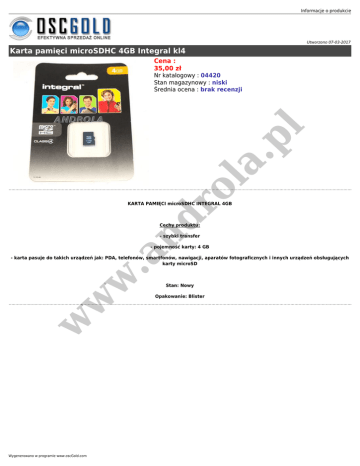 Informacje o produkcie Utworzono 07-03-2017 Karta pamięci microSDHC 4GB Integral kl4 Cena : 35,00 zł ro la .p l Nr katalogowy : 04420 Stan magazynowy : niski Średnia ocena : brak recenzji nd KARTA PAMIĘCI microSDHC INTEGRAL 4GB Cechy produktu: - szybki transfer w .a - pojemność karty: 4 GB w w - karta pasuje do takich urządzeń jak: PDA, telefonów, smartfonów, nawigacji, aparatów fotograficznych i innych urządzeń obsługujących karty microSD Wygenerowano w programie www.oscGold.com Stan: Nowy Opakowanie: Blister