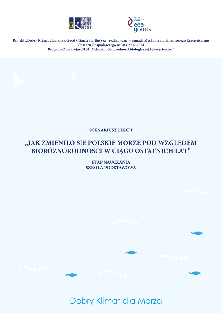 Projekt „Dobry Klimat dla morza/Good Climate for the Sea” realizowany w ramach Mechanizmu Finansowego Europejskiego Obszaru Gospodarczego na lata 2009-2014 Program Operacyjny PL02 „Ochrona różnorodności biologicznej i ekosystemów” SCENARIUSZ LEKCJI „JAK ZMIENIŁO SIĘ POLSKIE MORZE POD WZGLĘDEM BIORÓŻNORODNOŚCI W CIĄGU OSTATNICH LAT” ETAP NAUCZANIA SZKOŁA PODSTAWOWA Dobry Klimat dla Morza Scenariusz do filmu „Jak zmieniło się polskie morze pod względem bioróżnorodności w ciągu ostatnich lat” Temat: Co żyje w Bałtyku? Cel ogólny: Poznanie cech Morza Bałtyckiego i organizmów w nim żyjących Cele szczegółowe: • poznanie wpływu zasolenia na różnorodność organizmów żyjących w Bałtyku • poznanie organizmów występujących w Morzu Bałtyckim • tworzenie łańcucha pokarmowego organizmów morskich Metody pracy: doświadczalna, burza mózgów, praca z mapą, praca z filmem Formy pracy: grupowa i indywidualna Środki dydaktyczne: film dokumentalny (całość lub fragmenty – odcinek „Jak zmieniło się polskie morze pod względem bioróżnorodności w ciągu ostatnich lat”), karta pracy (zał.1), mapa zasolenia Bałtyku (zał. 2), przygotowane okazy muszli i innych organizmów żyjących w Bałtyku, pomoce niezbędne do przeprowadzenia doświadczenia, ilustracje, na których porównana jest wielkość organizmów morskich w Morzu Bałtyckim i bardziej zasolonych morzach oraz zróżnicowanie liczby organizmów morskich w zależności od zasolenia (zał.3) Czas lekcji: 1 godzina lekcyjna Przebieg lekcji: Przed lekcją nauczyciel prosi uczniów o przyniesienie do szkoły muszli i innych okazów organizmów znalezionych nad Morzem Bałtyckim i innymi morzami. Nauczyciel przygotowuje również okazy muszli i pąkli zgromadzone w pracowni przyrodniczej. Faza wprowadzająca Nauczyciel wykonuje z uczniami doświadczenie – Zasolenie Bałtyku i Morza Czerwonego Doświadczenie Przygotuj dwa litrowe przezroczyste pojemniki (butelki, słoiki). Do każdej z nich nalej litr wody, a następnie wsyp do jednej 6g soli kuchennej (Bałtyk) i 35g (Morze Czerwone). W ten sposób uczniowie mogą zobaczyć różnicę w zasoleniu Morza Bałtyckiego i Czerwonego. Uczniowie wykonują zadanie 1 z karty pracy (zał.1). Faza realizacyjna • Nauczyciel ogląda z uczniami fragmenty filmu „Jak zmieniło się polskie morze pod względem bioróżnorodności w ciągu ostatnich lat”. • Rozdaje uczniom mapę Bałtyku (zał.2), na której przedstawione jest zasolenie w różnych jego częściach (w pobliżu Morza Północnego, przy polskim wybrzeżu, w części właściwej i w Zatoce Botnickiej). Nauczyciel wraz z uczniami przeprowadza analizę mapy zasolenia morza. Uczniowie rozwiązują zadanie 2 z karty pracy. • Uczniowie pokazują przyniesione przez siebie okazy muszli znalezionych nad Morzem Bałtyckim i innymi morzami. Nauczyciel wykorzystuje również okazy zgromadzone w pracowni przyrodniczej. Uczniowie porównują wraz z nauczycielem wielkość oglądanych okazów. Wspólnie wykonują zadanie 3 i 4 w karcie pracy. • Nauczyciel przypomina pojęcie łańcucha pokarmowego. Uczniowie budują łańcuch pokarmowy wypełniając zadanie 5 z karty pracy. Faza podsumowująca • Do podsumowania nauczyciel wykorzystuje ilustracje, na których porównana jest wielkość organizmów morskich w Morzu Bałtyckim i bardziej zasolonych morzach oraz zróżnicowanie liczby organizmów morskich w zależności od zasolenia. • Nauczyciel zadaje prace domową – zadanie 6 w karcie pracy Praca domowa Narysuj wymyślony przez Ciebie organizm, który mógłby występować w Morzu Bałtyckim, gdyby były w nim lepsze warunki do wzrostu. Dobry Klimat dla Morza