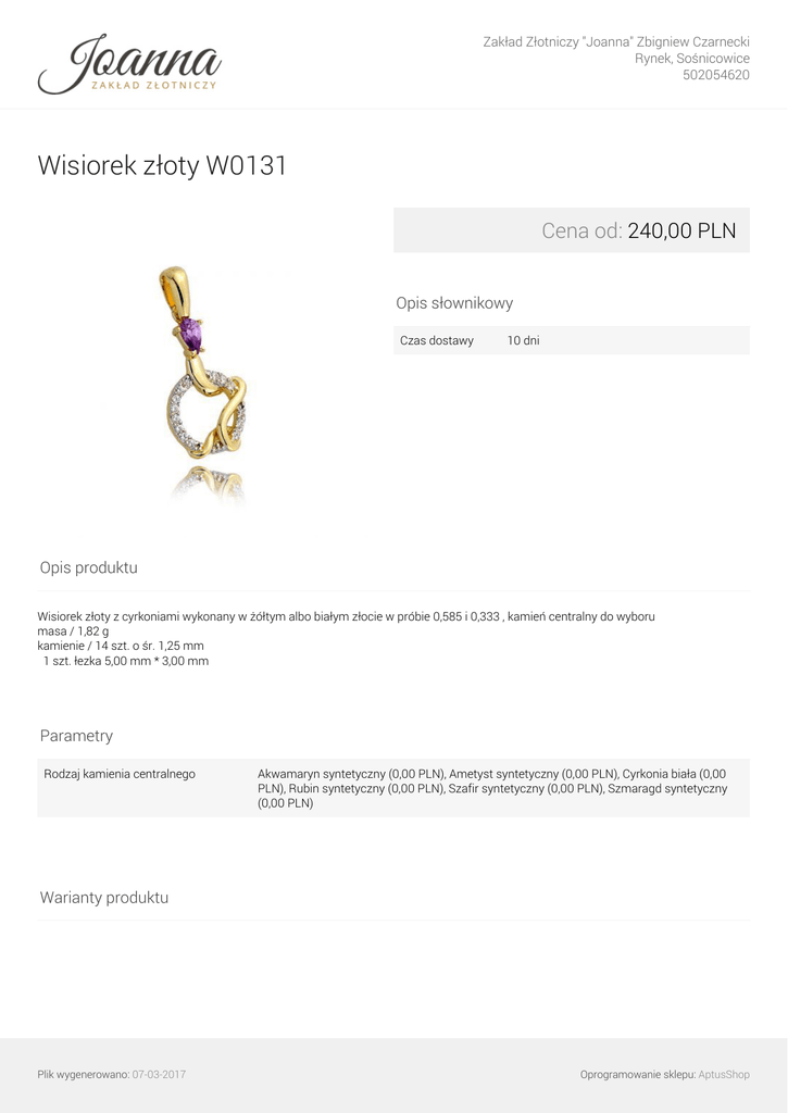Zakład Złotniczy "Joanna" Zbigniew Czarnecki Rynek, Sośnicowice 502054620 Wisiorek złoty W0131 Cena od: 240,00 PLN Opis słownikowy Czas dostawy 10 dni Opis produktu Wisiorek złoty z cyrkoniami wykonany w żółtym albo białym złocie w próbie 0,585 i 0,333 , kamień centralny do wyboru masa / 1,82 g kamienie / 14 szt. o śr. 1,25 mm 1 szt. łezka 5,00 mm * 3,00 mm Parametry Rodzaj kamienia centralnego Akwamaryn syntetyczny (0,00 PLN), Ametyst syntetyczny (0,00 PLN), Cyrkonia biała (0,00 PLN), Rubin syntetyczny (0,00 PLN), Szafir syntetyczny (0,00 PLN), Szmaragd syntetyczny (0,00 PLN) Warianty produktu Plik wygenerowano: 07-03-2017 Oprogramowanie sklepu: AptusShop Zakład Złotniczy "Joanna" Zbigniew Czarnecki Rynek, Sośnicowice 502054620 240,00 PLN Wisiorek złoty W0131/3 złoto 0,333 Wisiorek złoty z cyrkoniami wykonany w żółtym albo białym złocie w próbie 0,585 i 0,333 390,00 PLN Wisiorek złoty W0131/1 złoto 0,585 Wisiorek złoty z cyrkoniami wykonany w żółtym albo białym złocie w próbie 0,585 i 0,333 390,00 PLN Wisiorek złoty W0131/2 białe złoto 0,585 Wisiorek złoty z cyrkoniami wykonany w żółtym albo białym złocie w próbie 0,585 i 0,333 Plik wygenerowano: 07-03-2017 Powered by TCPDF (www.tcpdf.org) Oprogramowanie sklepu: AptusShop